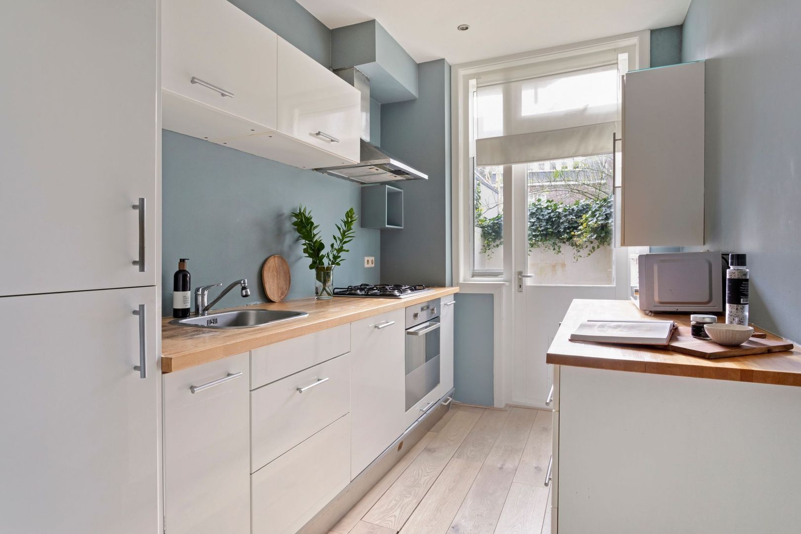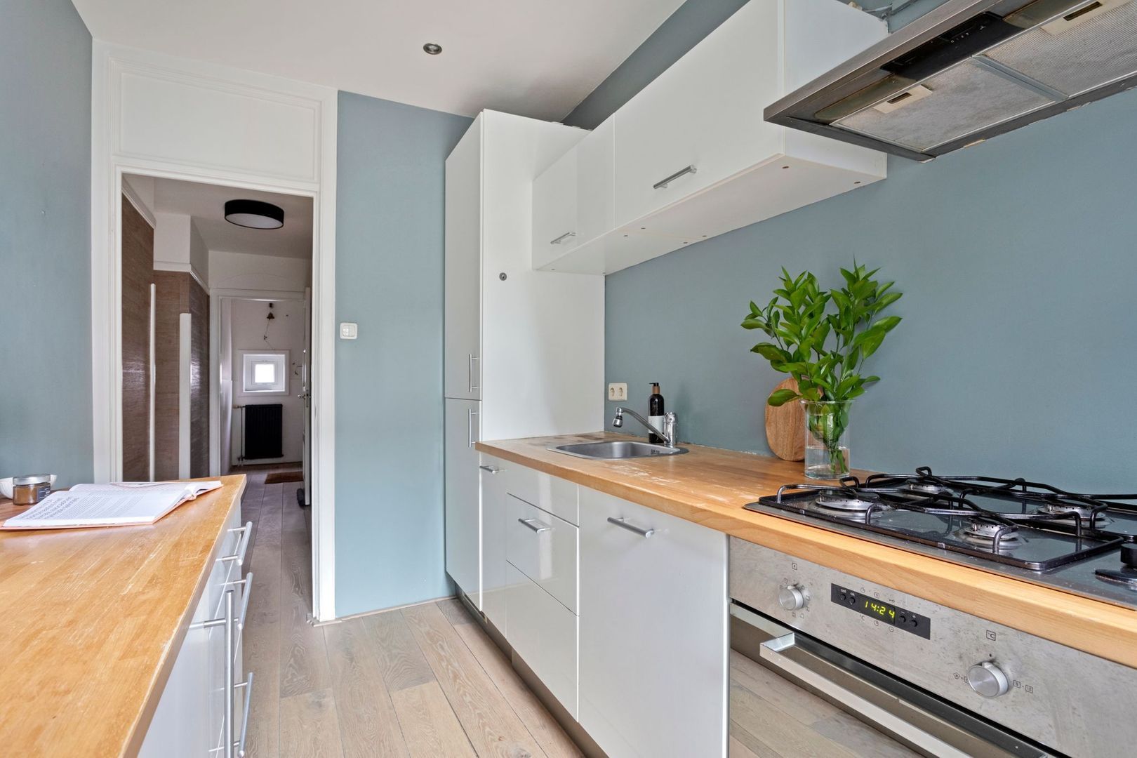 From the hallway, you reach the closed kitchen at the rear. It is set up on two sides and equipped with glossy white cabinets with stainless steel handles, combined with a wooden countertop. The kitchen also includes several built-in appliances and access to the cozy south-facing garden.