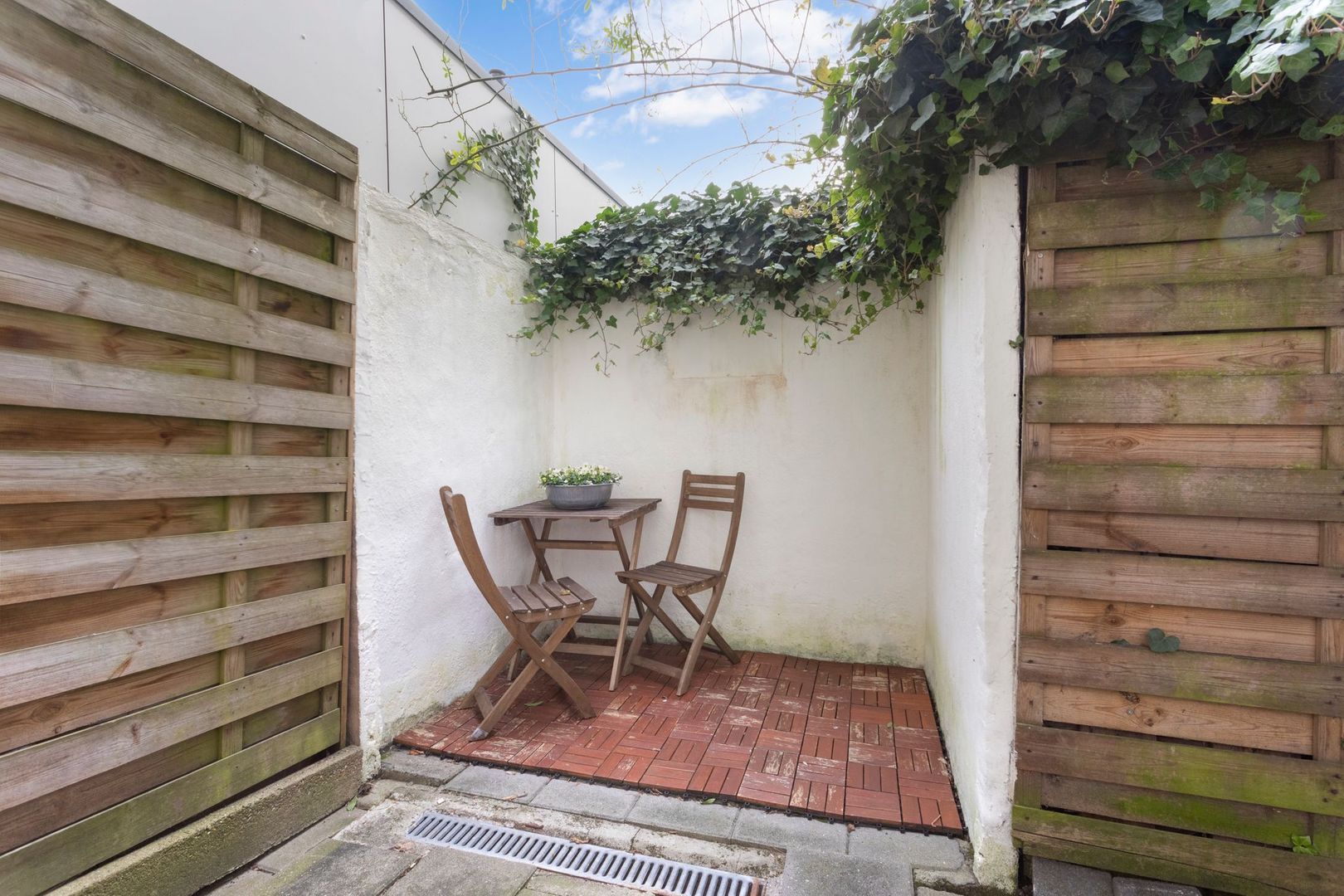 The garden has an area of 13.5m², is south-facing, and is fully tiled. A nice detail is the sheltered seating area. Finally, the garden includes a large garden shed that houses the central heating system.