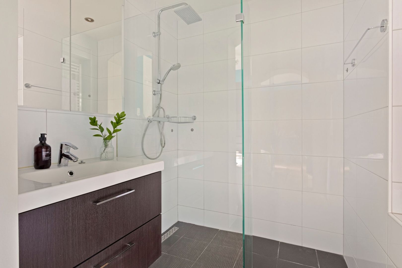 The master bedroom is also located at the rear. This bedroom features a full-height, wall-wide built-in wardrobe with a TV connection and includes an en-suite bathroom. French doors give access to the aforementioned garden. The en-suite bathroom is equipped with anthracite-colored floor tiles and fully tiled white walls. The bathroom features a walk-in shower with both a rain shower and a hand shower, along with a wide wooden vanity unit and matching mirrored cabinet.
