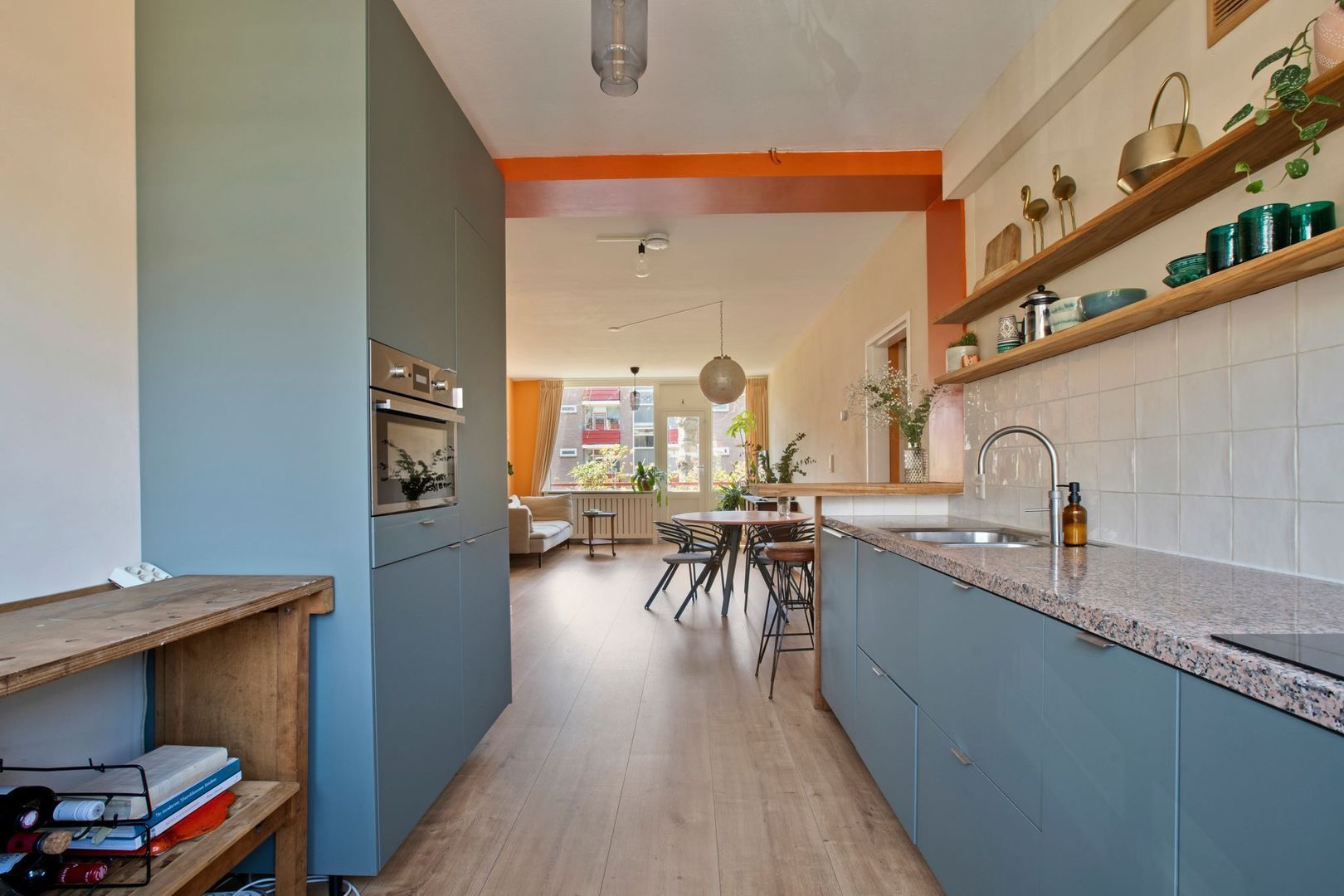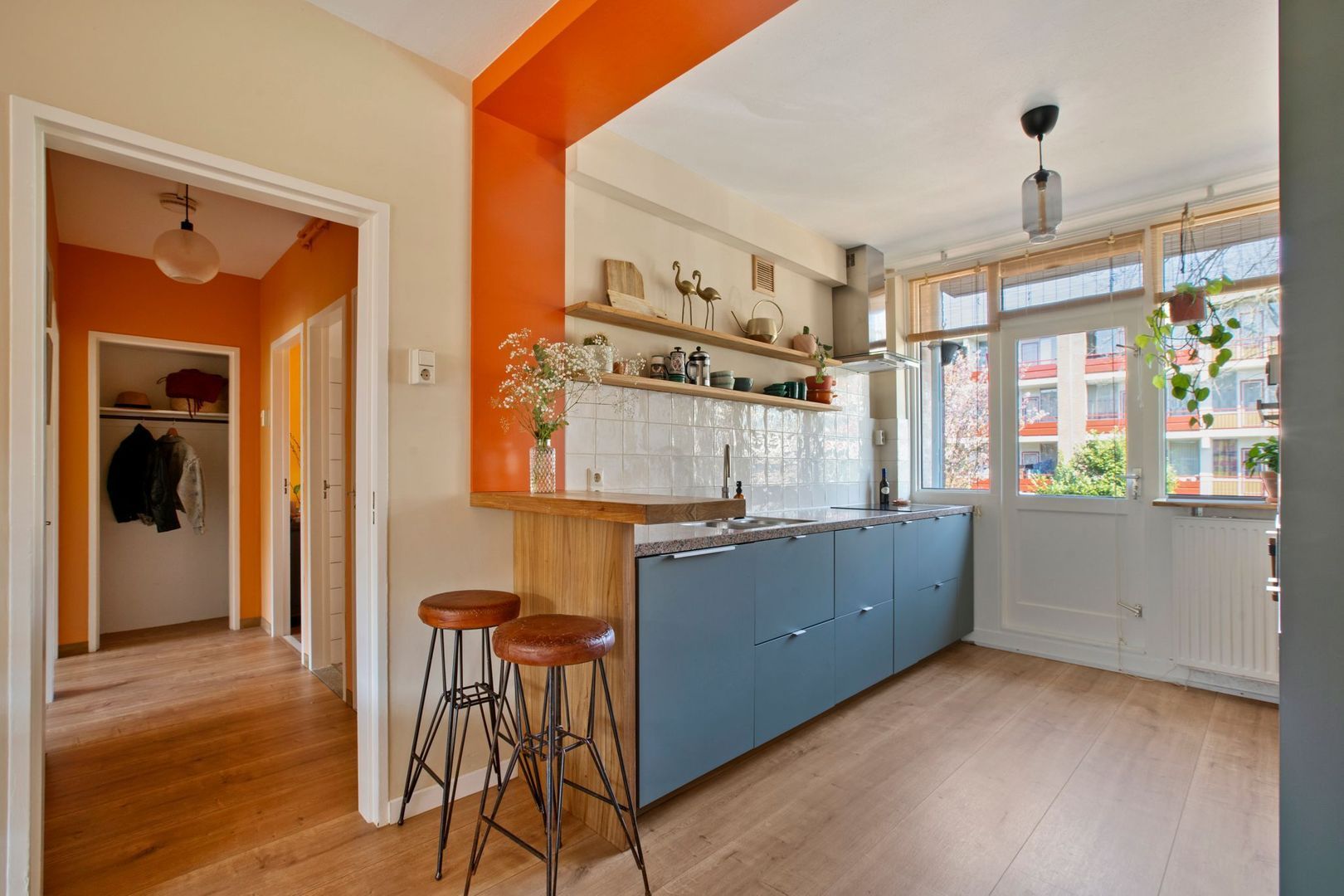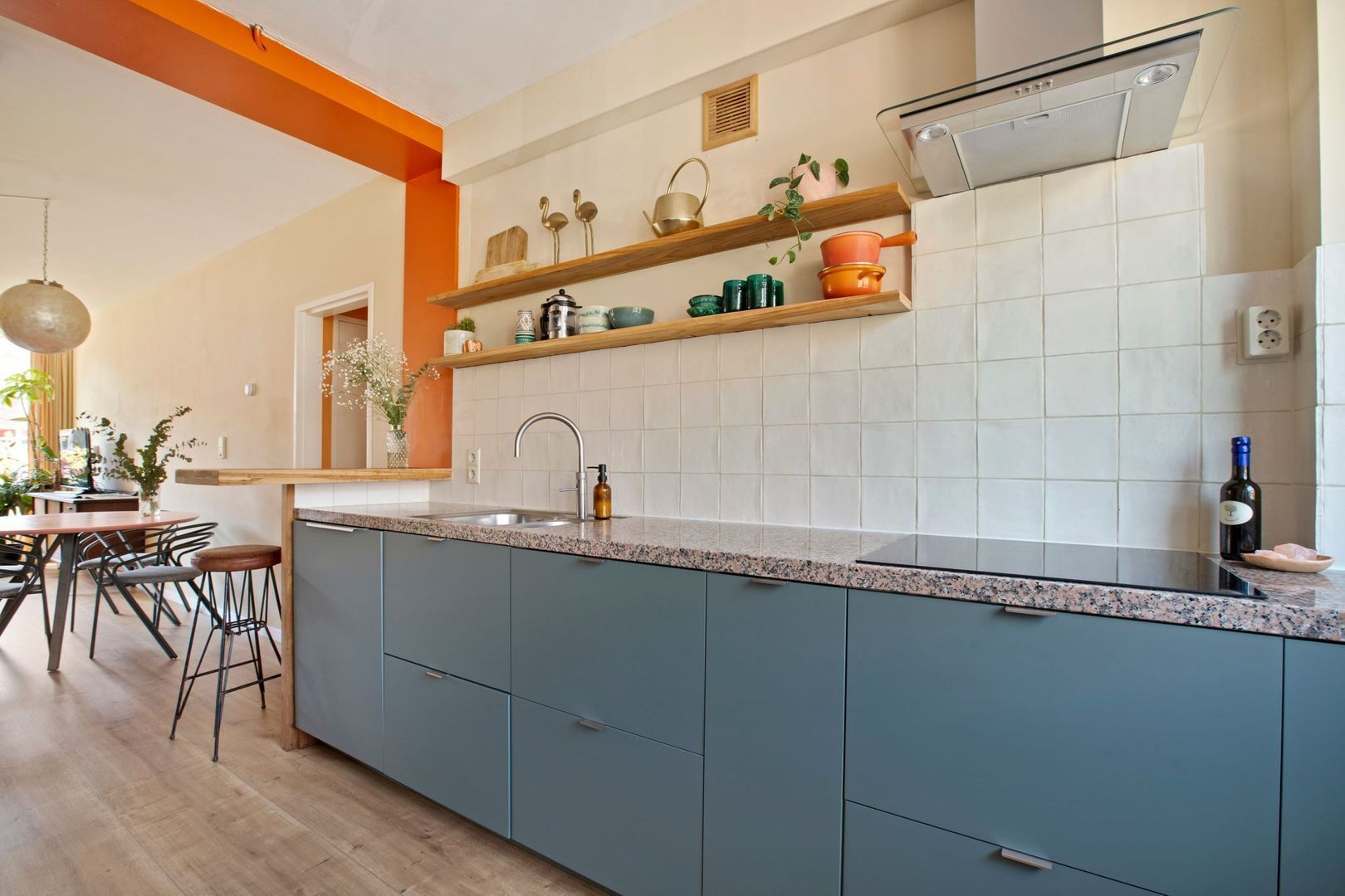 LAYOUT Through the spacious closed porch and the large communal stairwell, you reach the entrance on the first floor. Upon entering, you immediately step into the living room, which is wonderfully bright due to the large windows on both sides. The living room has access to a balcony facing the sunny west, which runs along the entire rear of the apartment. The open kitchen is located at the front and was renovated in 2022, featuring a granite countertop with green cabinet fronts and modern built-in appliances, including a Quooker, an oven, and a 4-burner induction cooktop. From the kitchen, there is access to a small balcony at the front of the apartment.