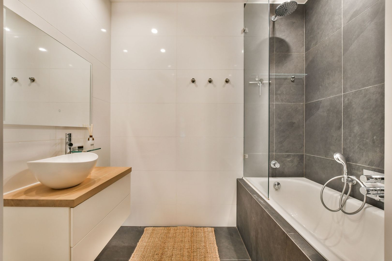 Bathroom 1 includes a bathtub/shower combination, a white vanity unit with a stylish wooden countertop, and a beautiful vessel sink.