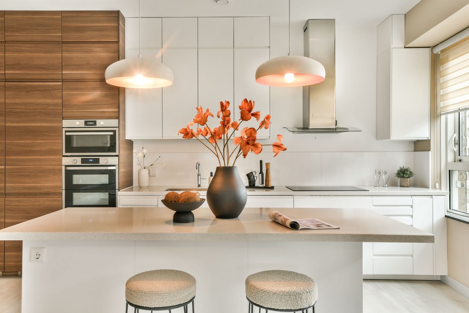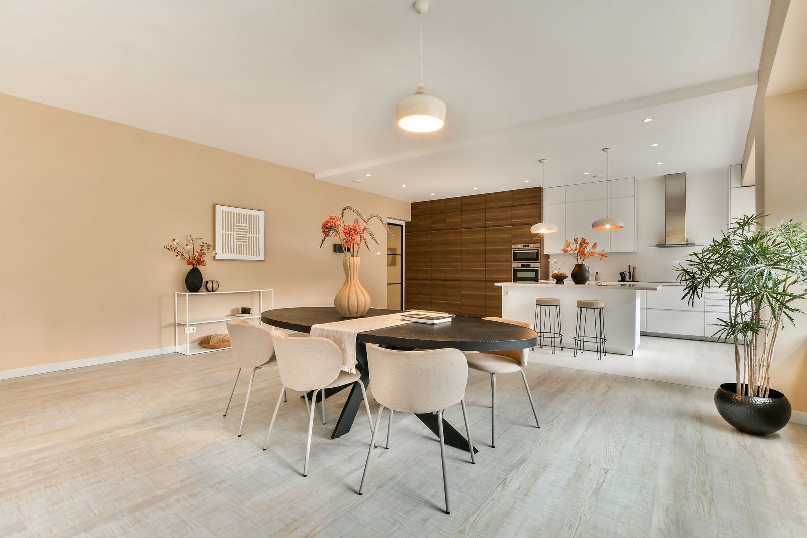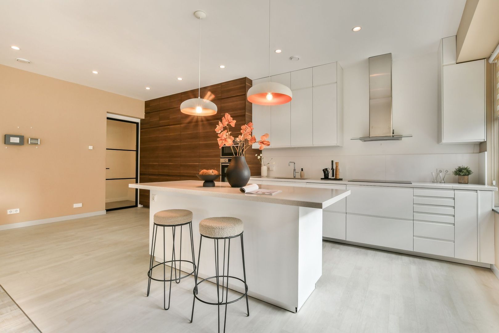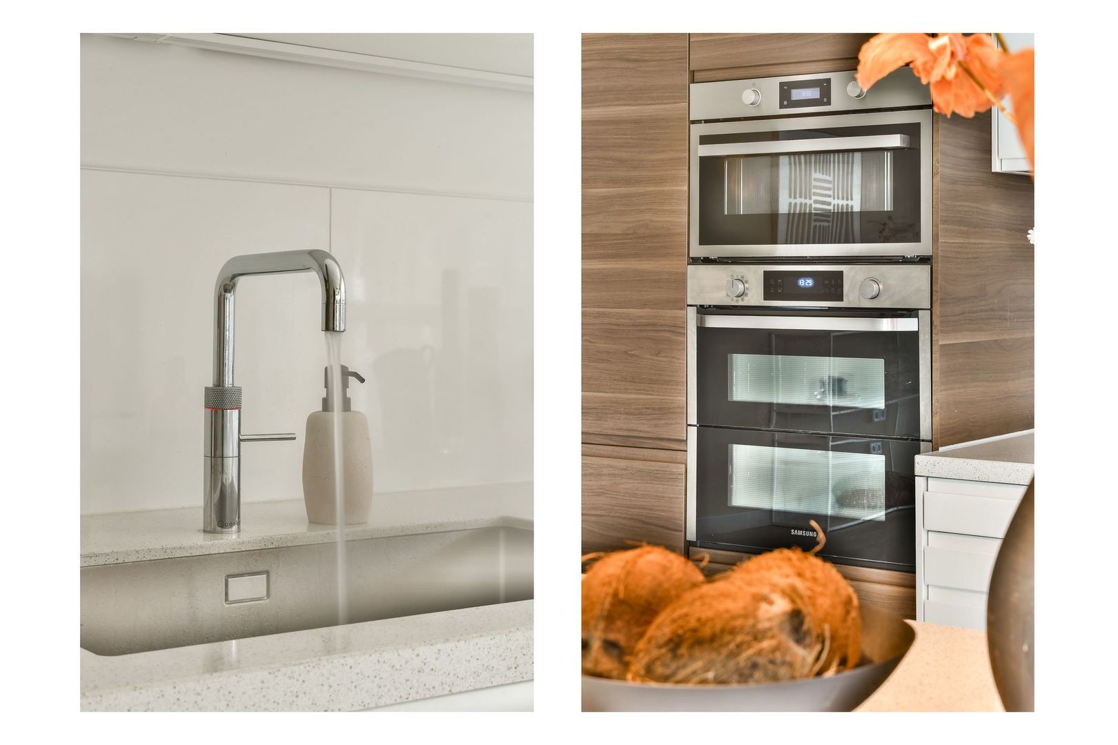 The stunning living area, stretching an impressive 13 meters, is located at the front and side of the building. With large windows on two sides, the space is exceptionally bright. The generous size allows for a spacious sitting and dining area, as well as a luxurious open-plan kitchen. The modern kitchen features white cabinetry, light-speckled natural stone countertops, and a full-height wall of built-in appliances. Additionally, there is a kitchen island with seating and extra storage. The kitchen is also equipped with a Quooker and a double-door fridge and freezer.