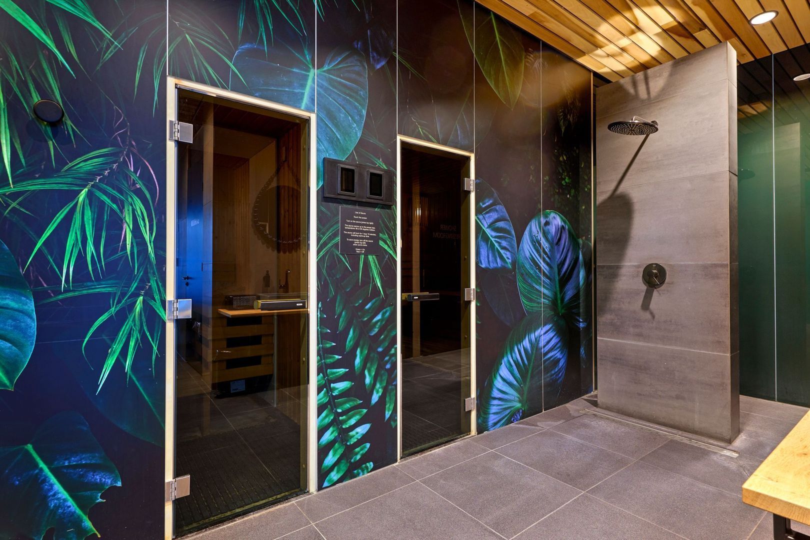 The apartment features two well-appointed bathrooms, both with anthracite floor tiles and glass shower walls. The other walls are finished with white tiling.