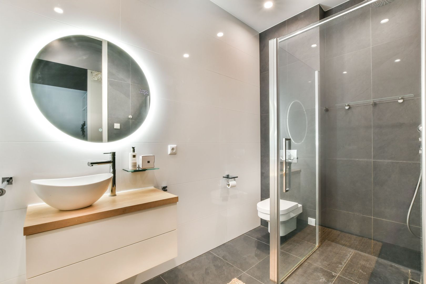 Bathroom 2 offers a large walk-in shower, wall-mounted toilet, and a sink.