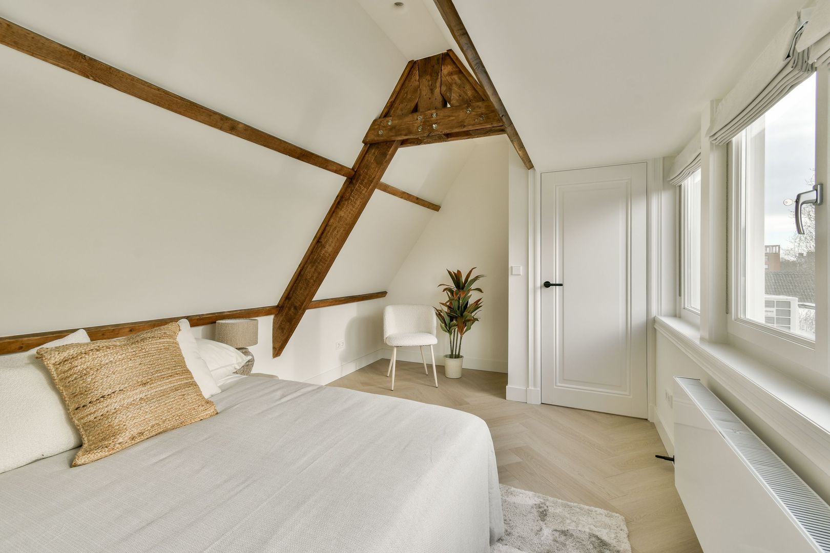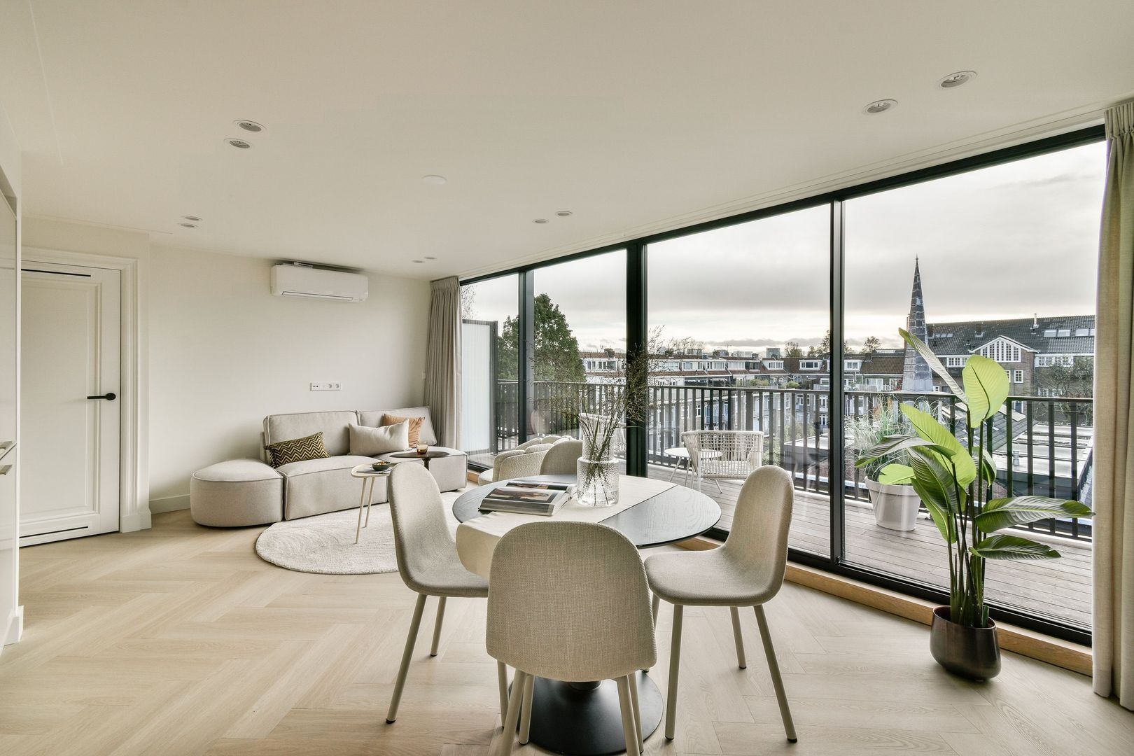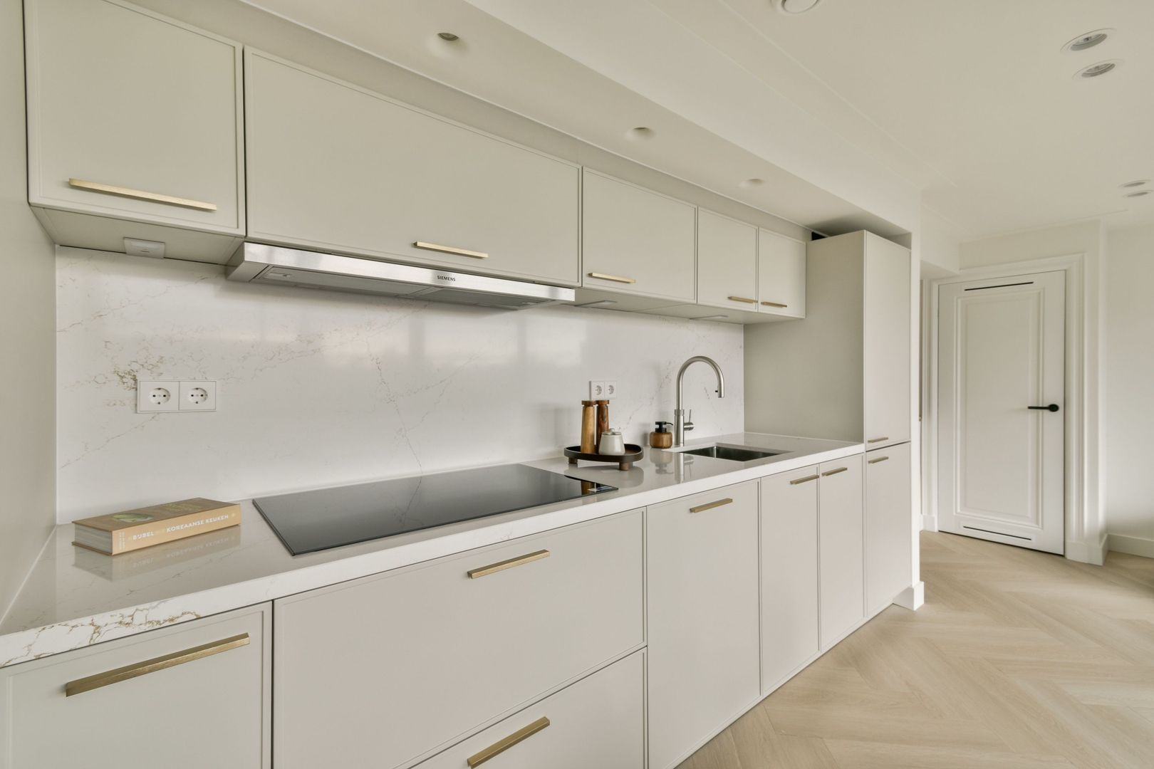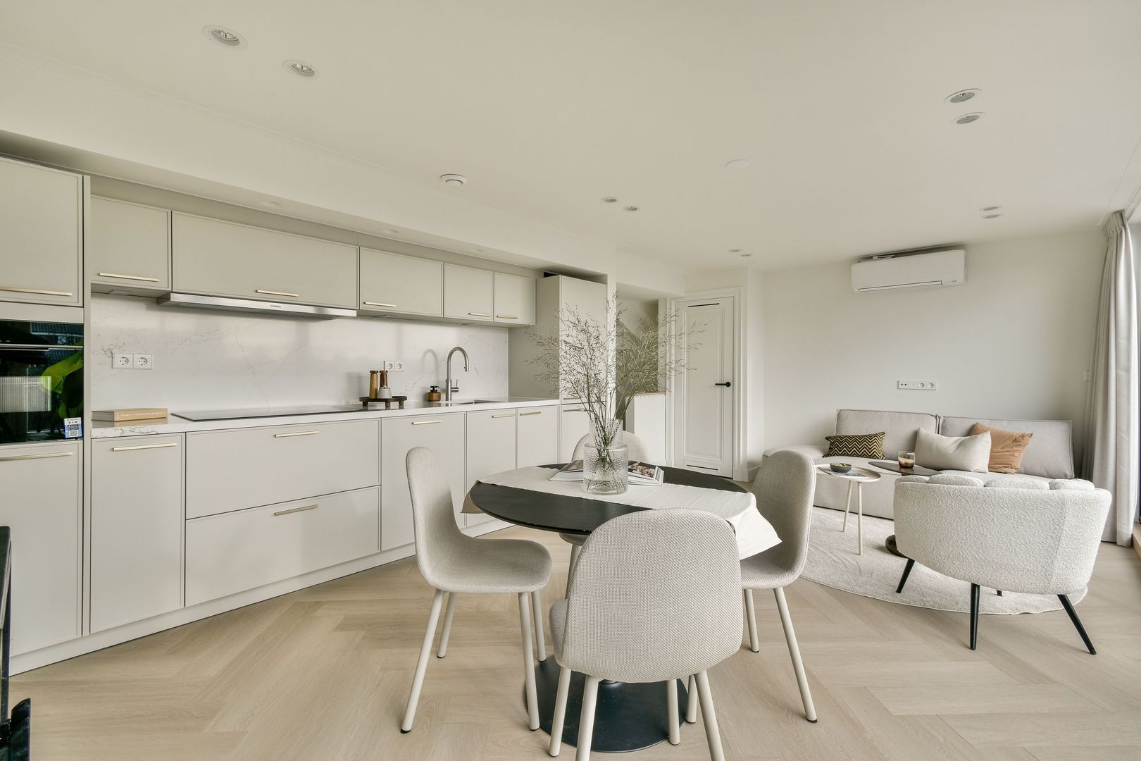 De zeer licht living met airconditioning is aan de achterzijde gesitueerd en heeft een pandbrede schuifpui naar het privé terras van ruim 20m². Het terras is uitgevoerd met hardhouten terrasdelen en kijkt uit op de voormalige Andreaskerk. De living heeft een breed keukenblok van maar liefst 3.5m lang en is uitgevoerd met taupe kleurige kasten en lades met een bronzen greep in combinatie met een gemêleerd composiet aanrechtblad. Voorts is de keuken volledig voorzien van inbouwapparatuur met in het bijzonder vermeld de Quooker en inductiekookplaat.