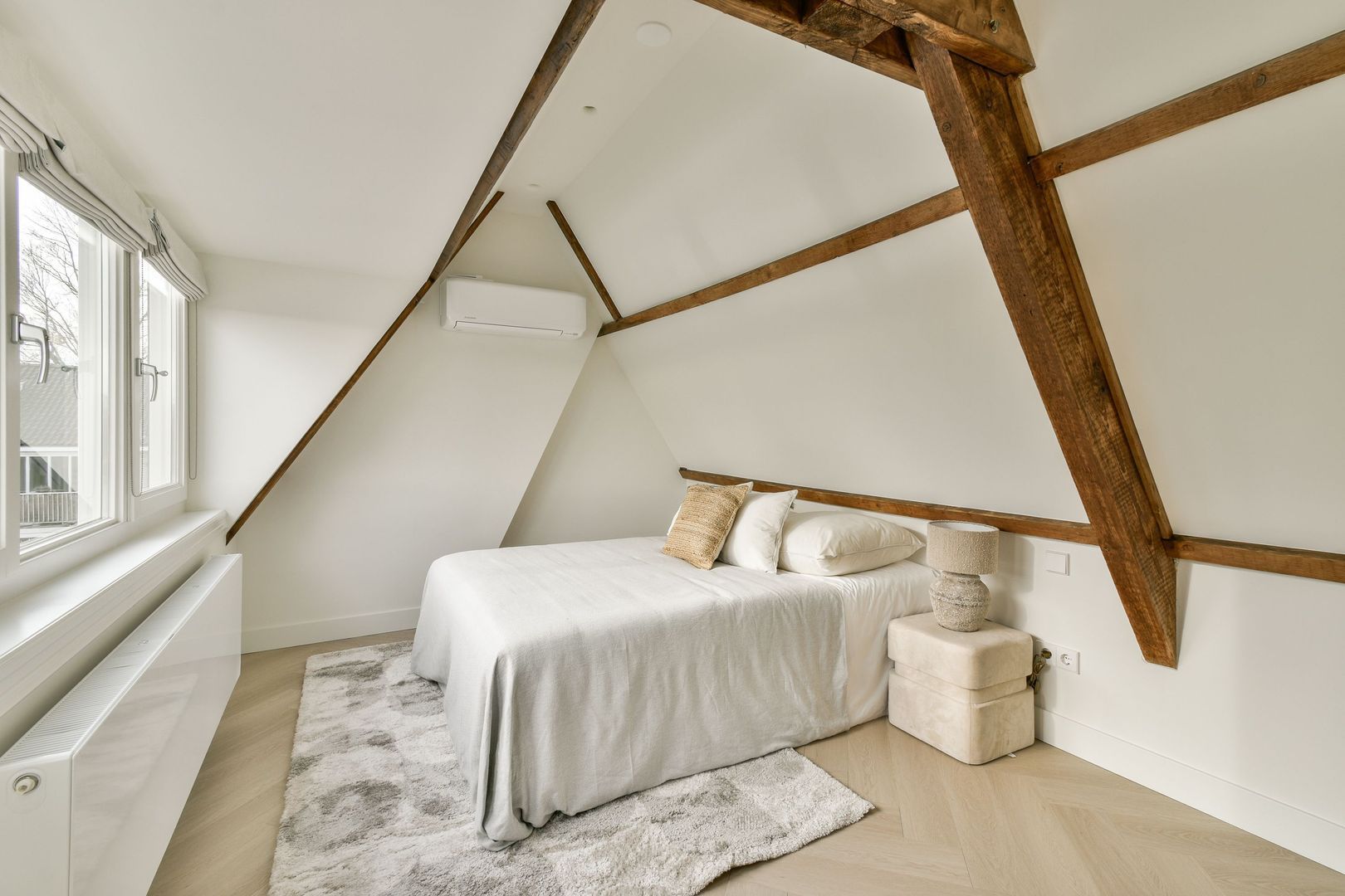 De houten trap leidt naar bovengelegen slaapkamer, bereikbaar via een compacte overloop met tussendeur. Deze aangename slaapkamer beschikt over een charmante kapconstructie wat een romantische uitstraling geeft. Tevens is deze slaapkamer voorzien van airconditioning.