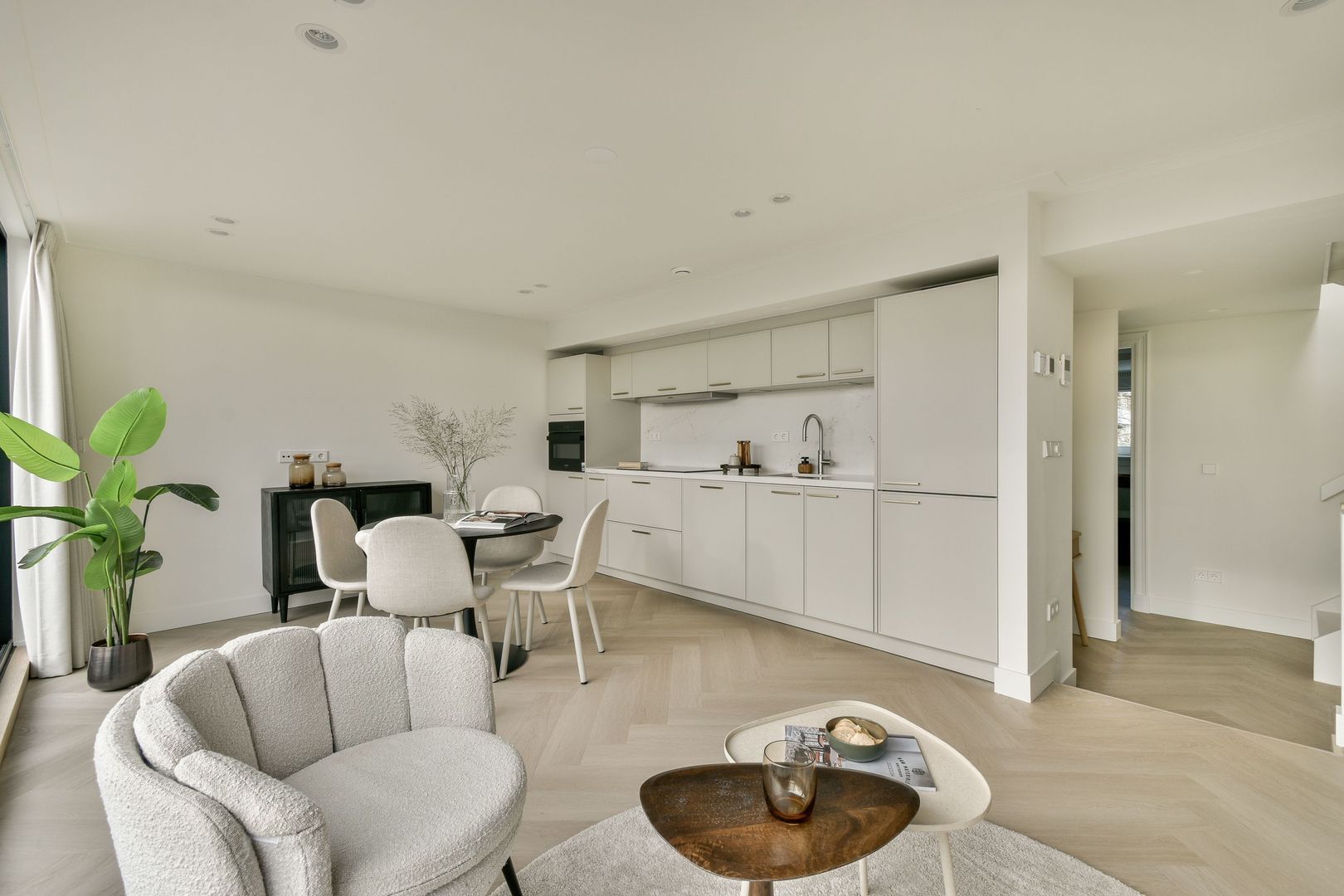 Het gehele appartement is uitgevoerd met lichte wanden en plafonds met inbouwverlichting, kozijnen met dubbele beglazing en een visgraat vloer met vloerverwarming.