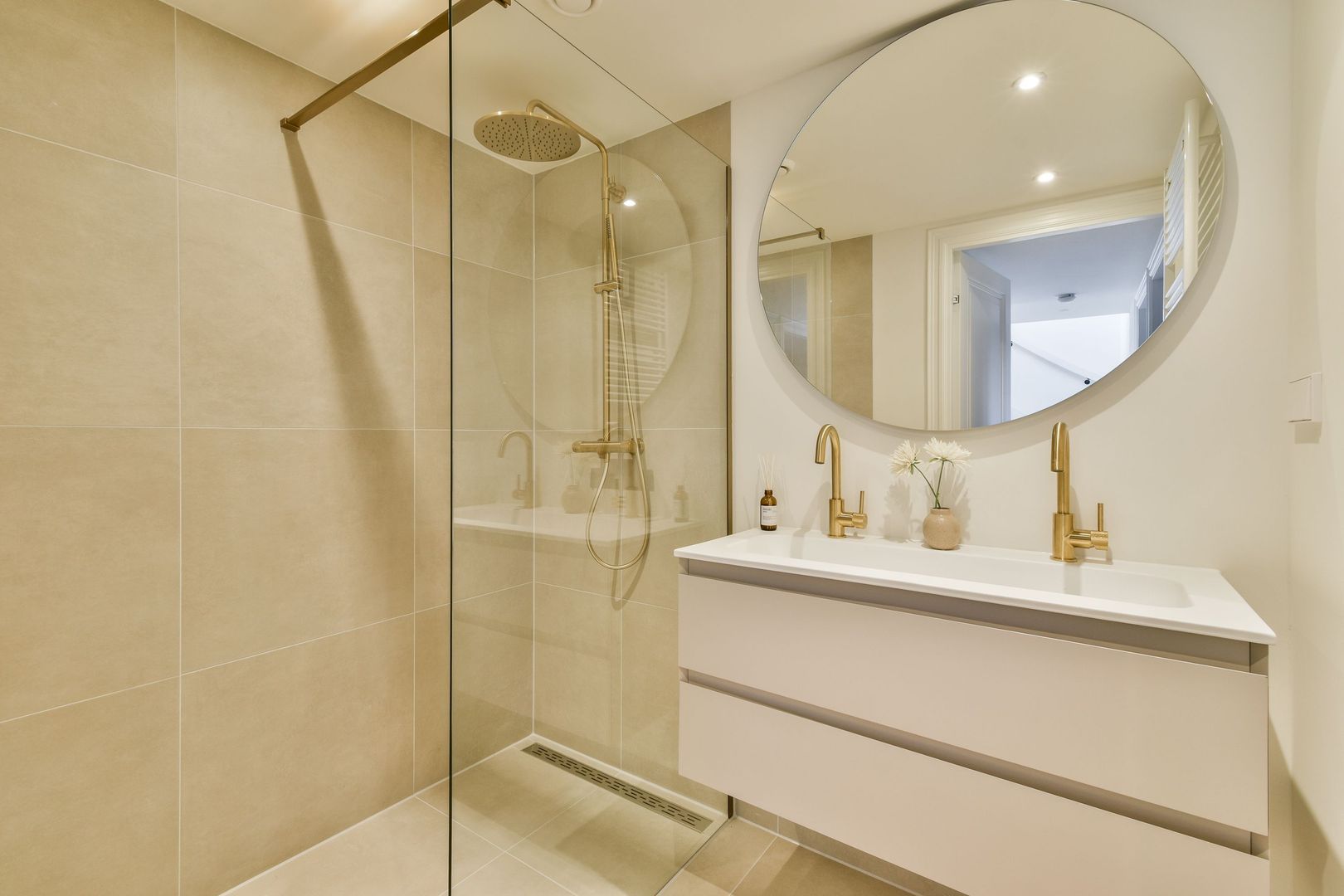 De sanitaire ruimtes hebben een gelijke uitvoering; een beige vloer- en wandtegel in combinatie met een deels witte wand. Beide ruimtes zijn uitgevoerd met bronskleurige kranen. De badkamer beschikt over een breed wastafelmeubel met dubbele kraan en een grote, verlichte ronde spiegel, inloopdouche met stort/handdouche en een handdoekradiator.