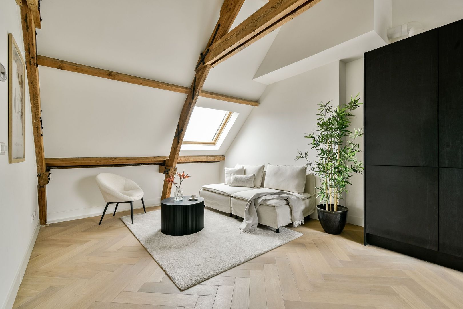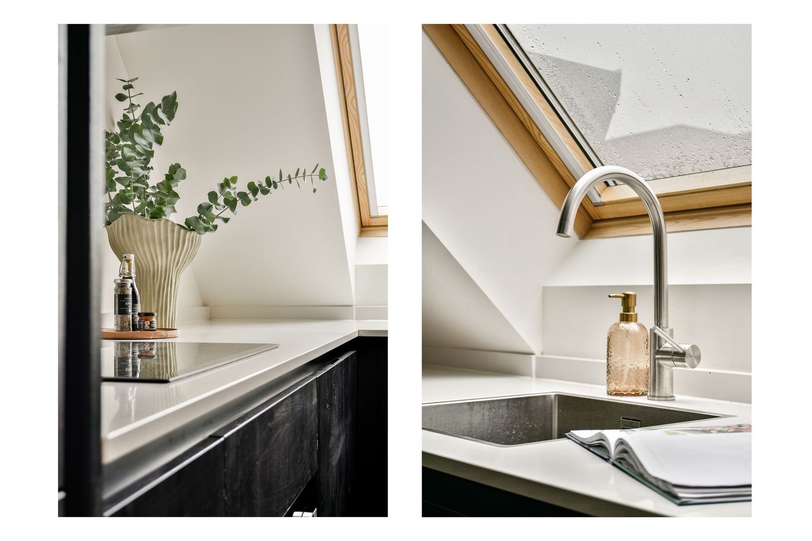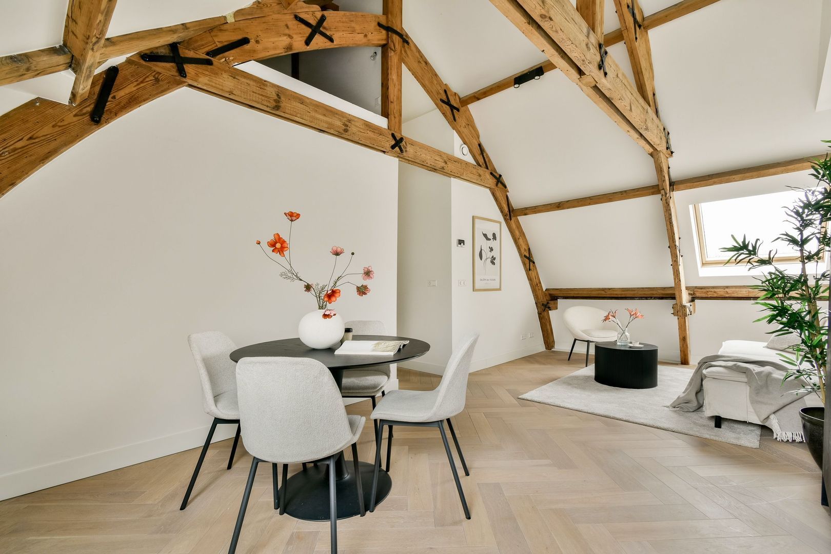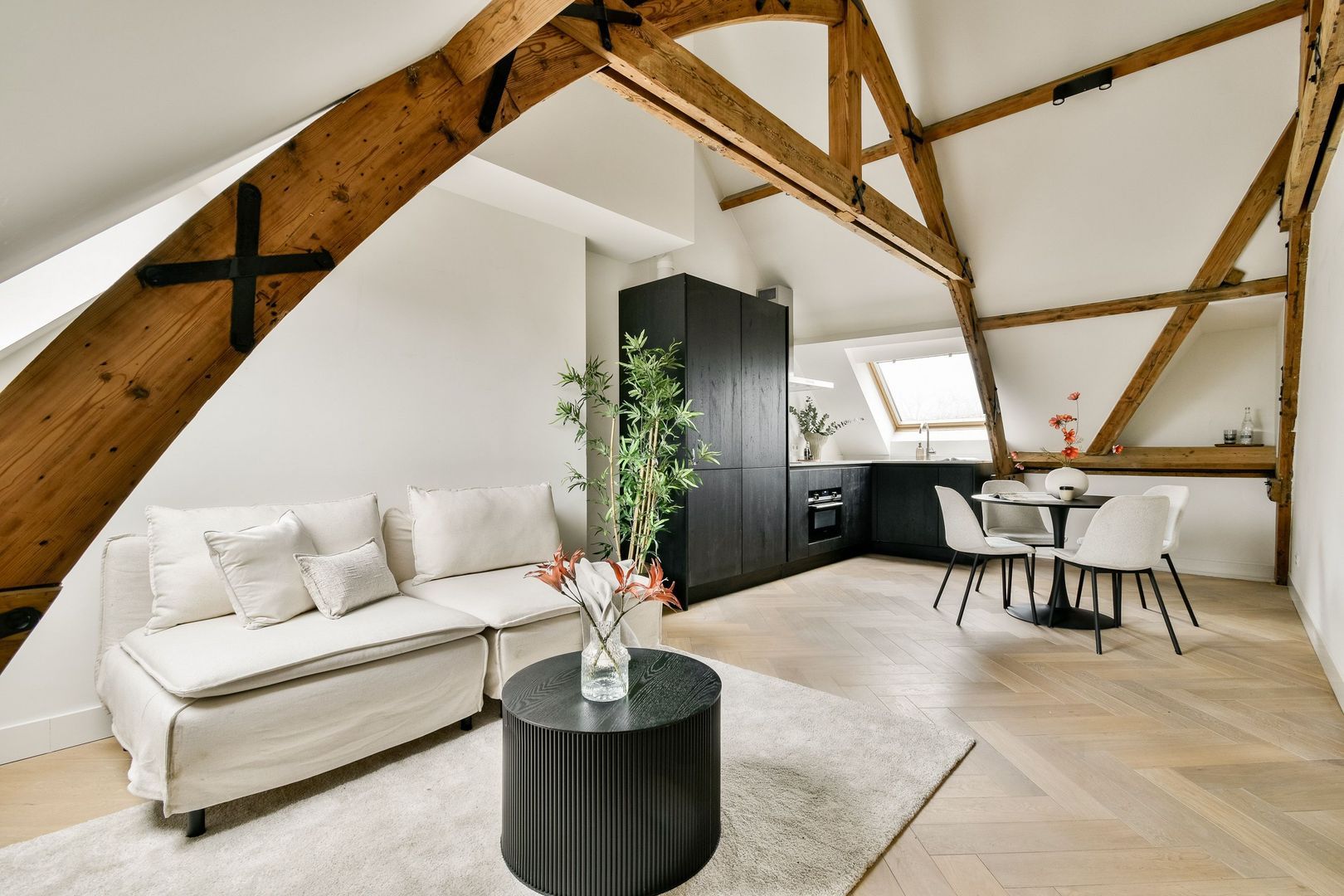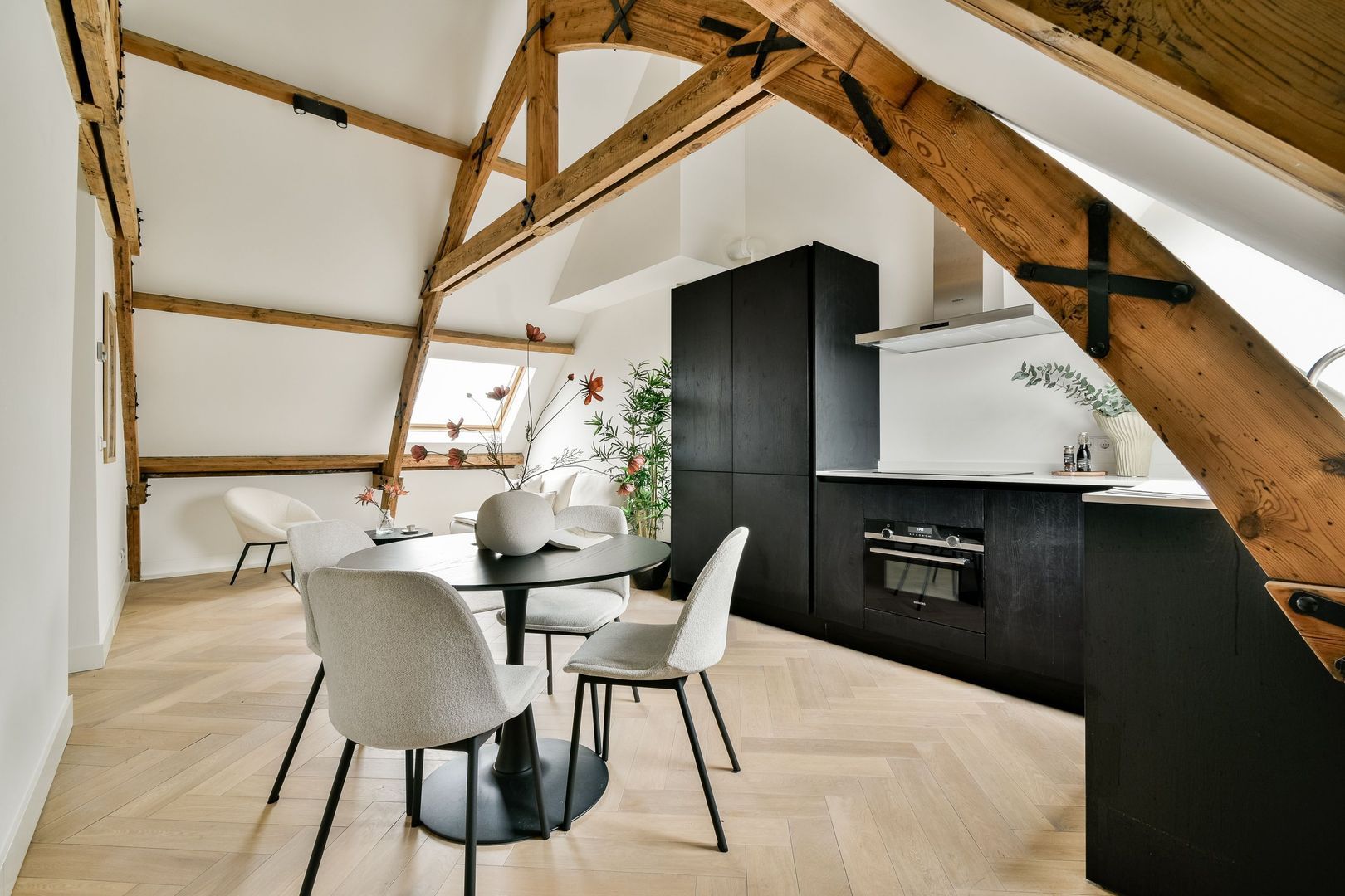 De woonkamer heeft een bijzonder ruimtelijk gevoel dankzij de hoge plafonds en de elegante kapconstructie. De open keuken is stijlvol uitgevoerd met zwarte houten kasten en lades, een lichtkleurig werkblad en hoogwaardige Siemens inbouwapparatuur, waaronder een combi-oven, inductiekookplaat, vaatwasser en koel-vriescombinatie.