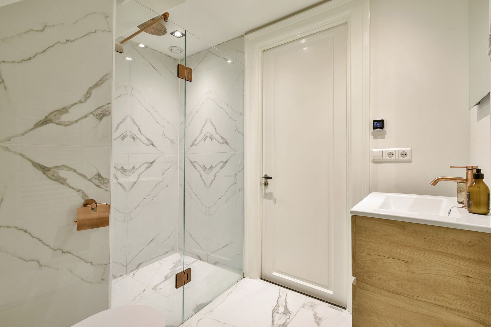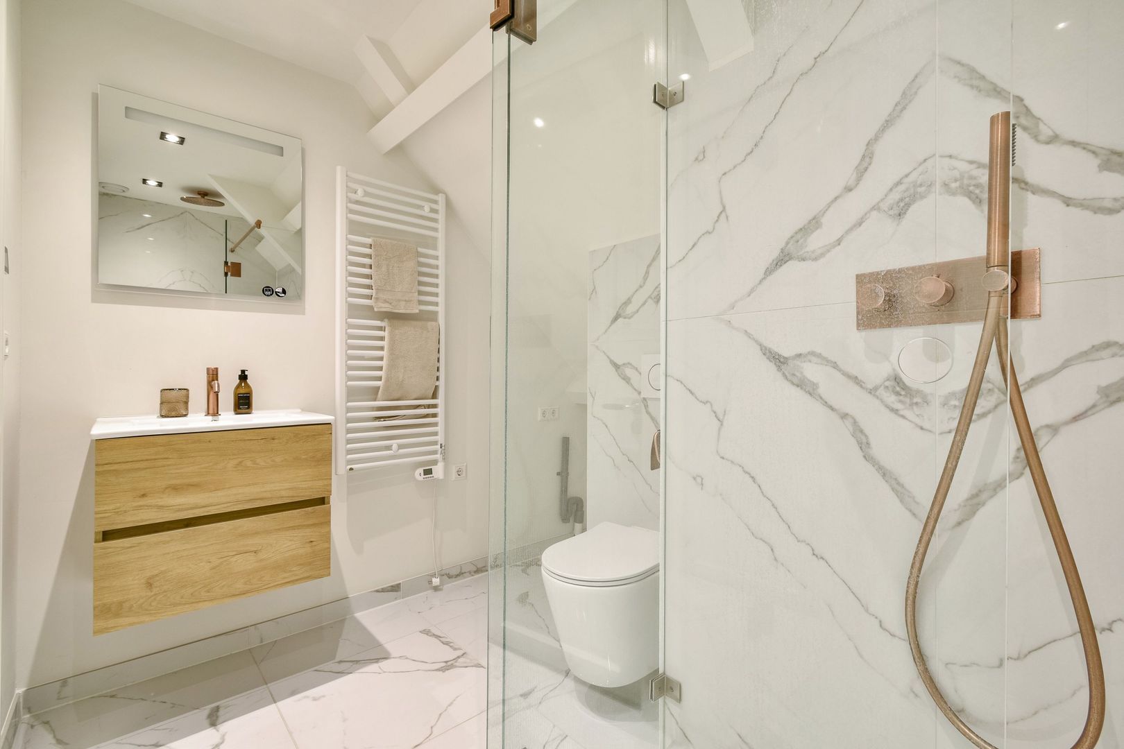 De badkamer is uitgevoerd met een prachtige marmerlook tegelvloer en douchewand in combinatie met een licht gestucte wand. De ruimte beschikt over een inloopdouche met glazen wand, een wastafelmeubel, handdoekradiator en toilet. Zowel de wastafel als de inloopdouche zijn voorzien van smaakvolle messing inbouwkranen, wat de badkamer een luxe uitstraling geeft.