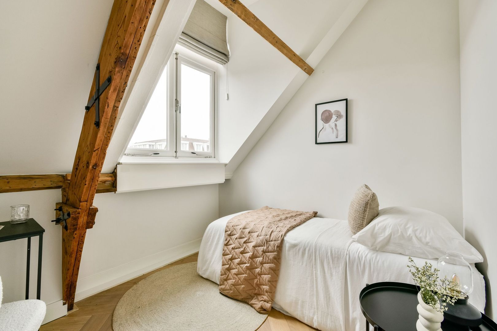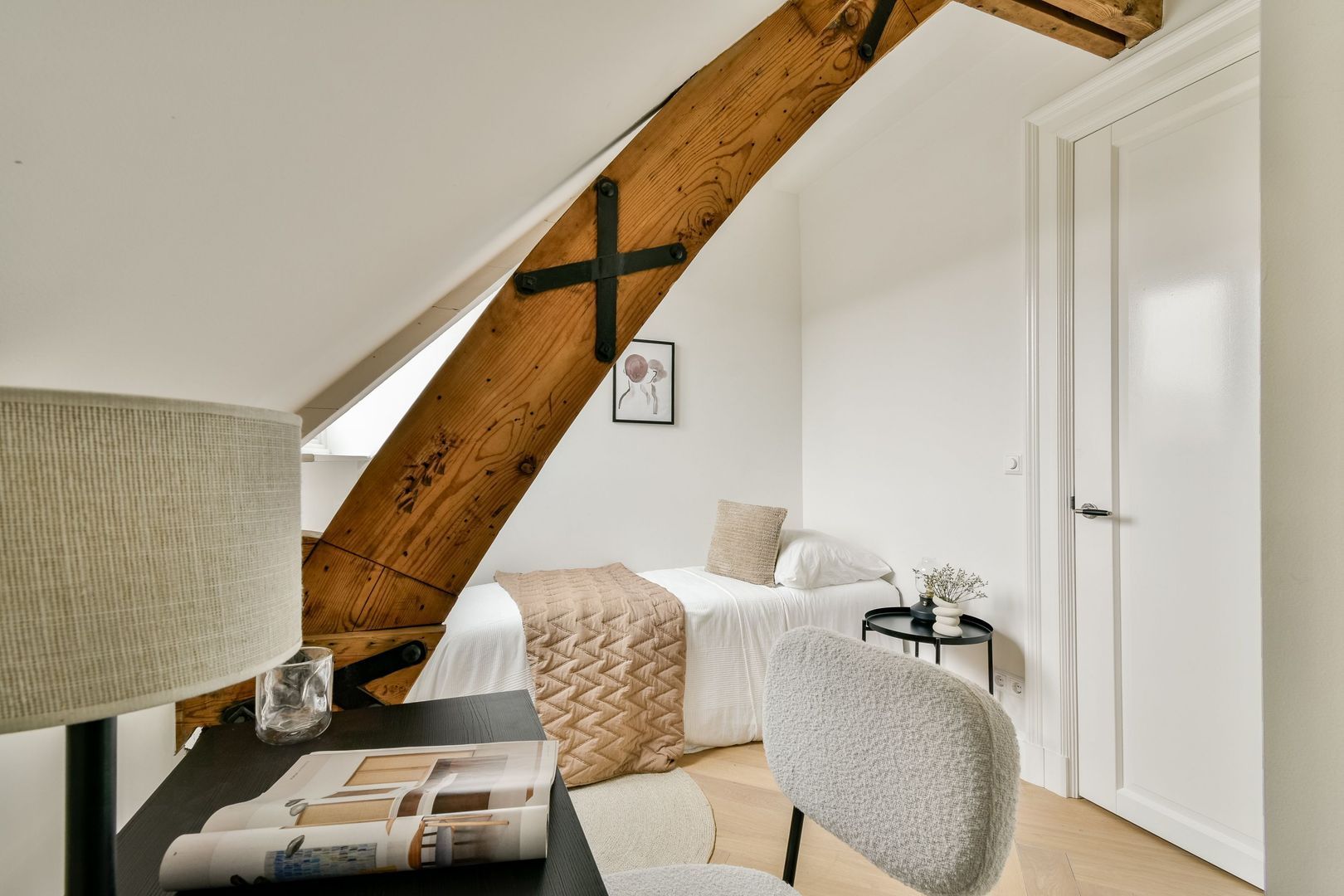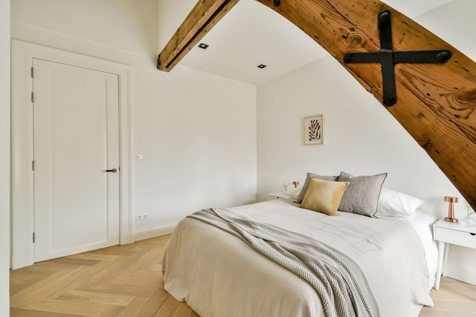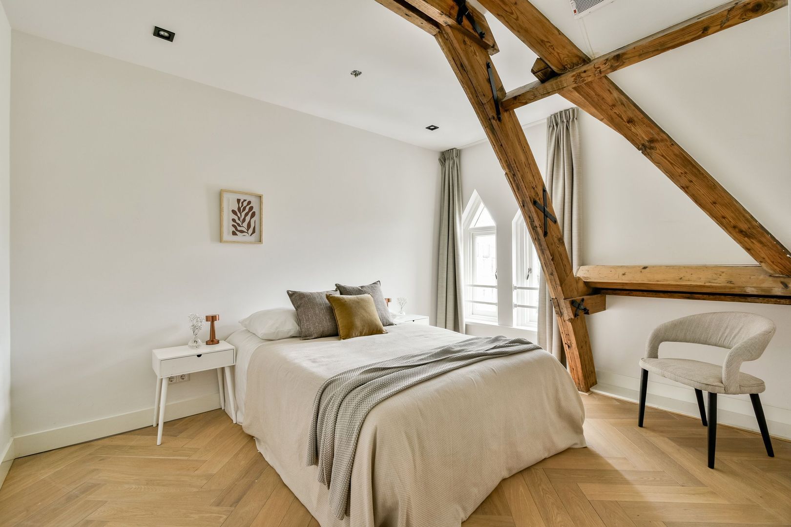 Aan beide zijden van de hal bevinden zich de 2 slaapkamers, waarvan één iets groter is dan de ander. Ook hier is de fraaie balkenconstructie zichtbaar, wat zorgt voor extra sfeer en karakter.
