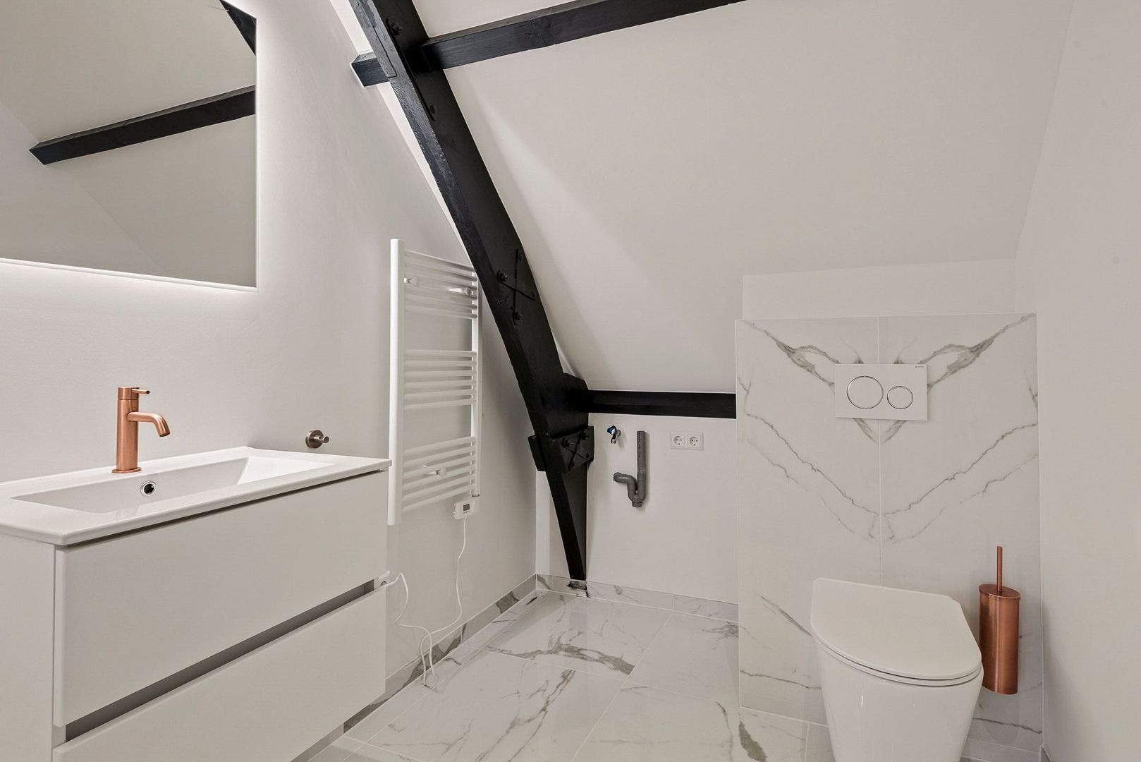 De badkamer is uitgevoerd met een prachtige marmerlook tegel en voorzien van een inloopdouche met glazen wand, wastafelmeubel, het toilet, de wasmachineaansluiting en is voorzien van vloerverwarming alsmede een handdoekradiator.