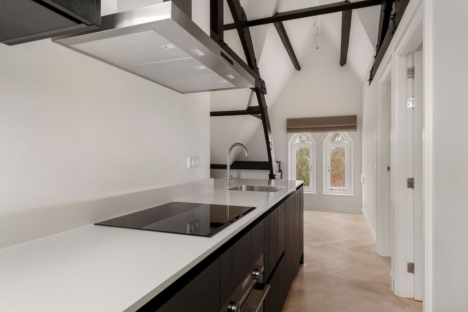 De moderne keuken is uitgevoerd met zwarte kasten en lades in combinatie met een crèmekleurig natuurstenen werkblad. Er is diverse inbouwapparatuur aanwezig waaronder een inductie kookplaat, vaatwasser, koelkast, vriezer en combi oven.