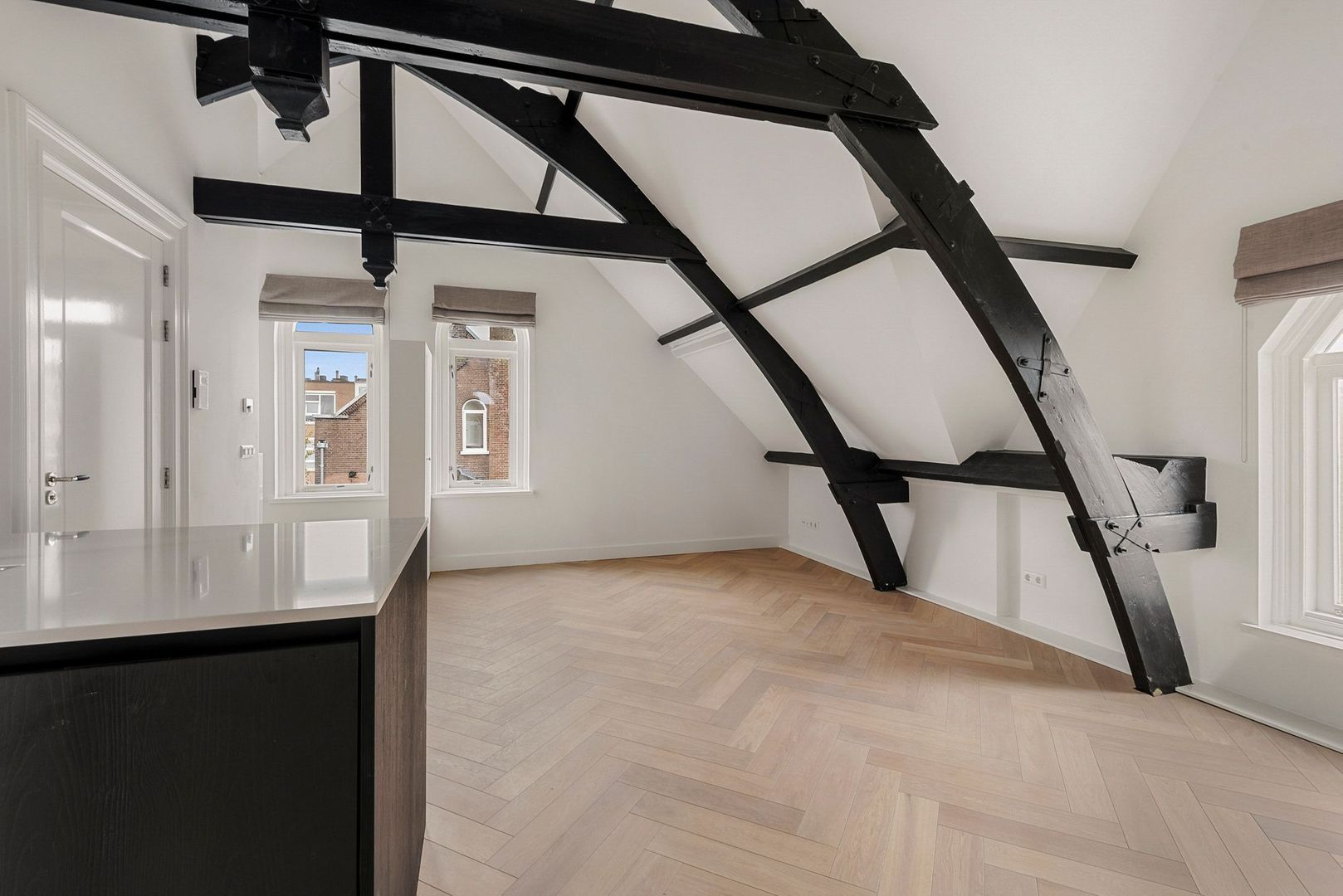 Via de gemeenschappelijke entree en het fraai afgewerkte trappenhuis is het appartement bereikbaar op de tweede verdieping en geeft via de interne trap direct toegang tot de woonkamer. De woonkamer is licht met aan drie zijdes ramen en is hoogwaardig afgewerkt. Fraai detail is de houten kapconstructie volledig in het zicht in combinatie met de hoge plafonds en paneeldeuren met klassiek beslag. De woning heeft door de schuine en hoge kapconstructie veel extra vloeroppervlakte.
