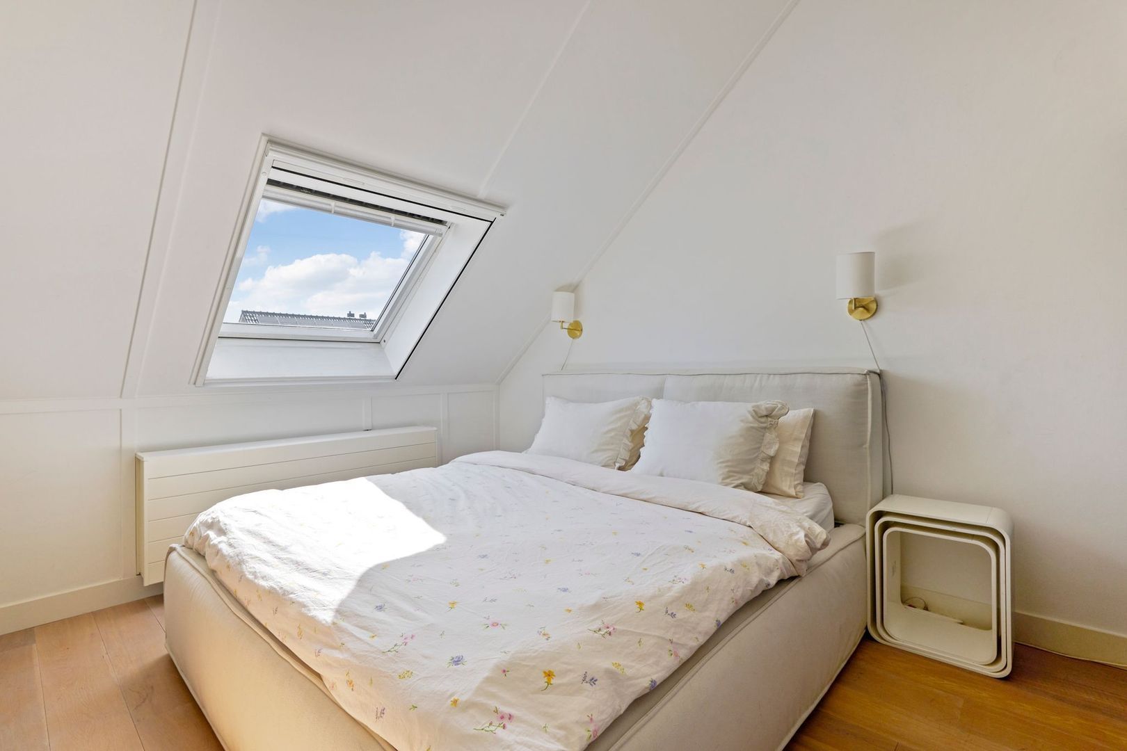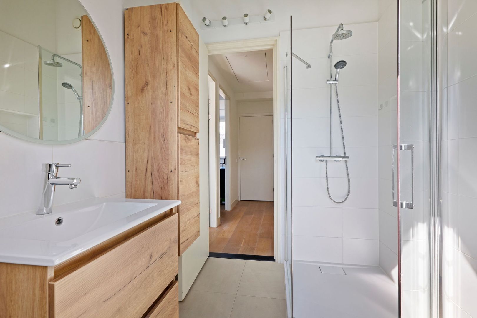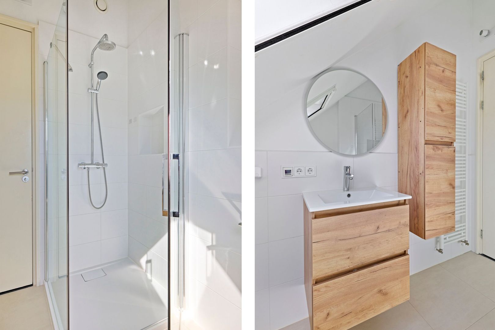 De tweede verdieping biedt nog eens twee slaapkamers en een tweede badkamer, alle bereikbaar via de overloop. De slaapkamer aan de achterzijde beschikt over een dakraam en airconditioning. De slaapkamer aan de voorzijde beschikt over een brede dakkapel en is ook voorzien van airconditioning. De moderne badkamer is uitgevoerd met een witte tegel en beschikt over een inloopdouche met glazen wand hand- en stortdouche, zwevend toilet, en een wastafel in houtlook. Ook deze badkamer beschikt over een (dak)raam wat wederom zorgt voor natuurlijk daglicht en extra ventilatie. Via de overloop is de wasruimte te bereiken, voorzien van de benodigde aansluitingen en de cv-installatie. De vlizotrap vanaf de overloop geeft toegang tot een extra bergzolder in de nok van het huis. Ideaal voor koffers of seizoensopslag.