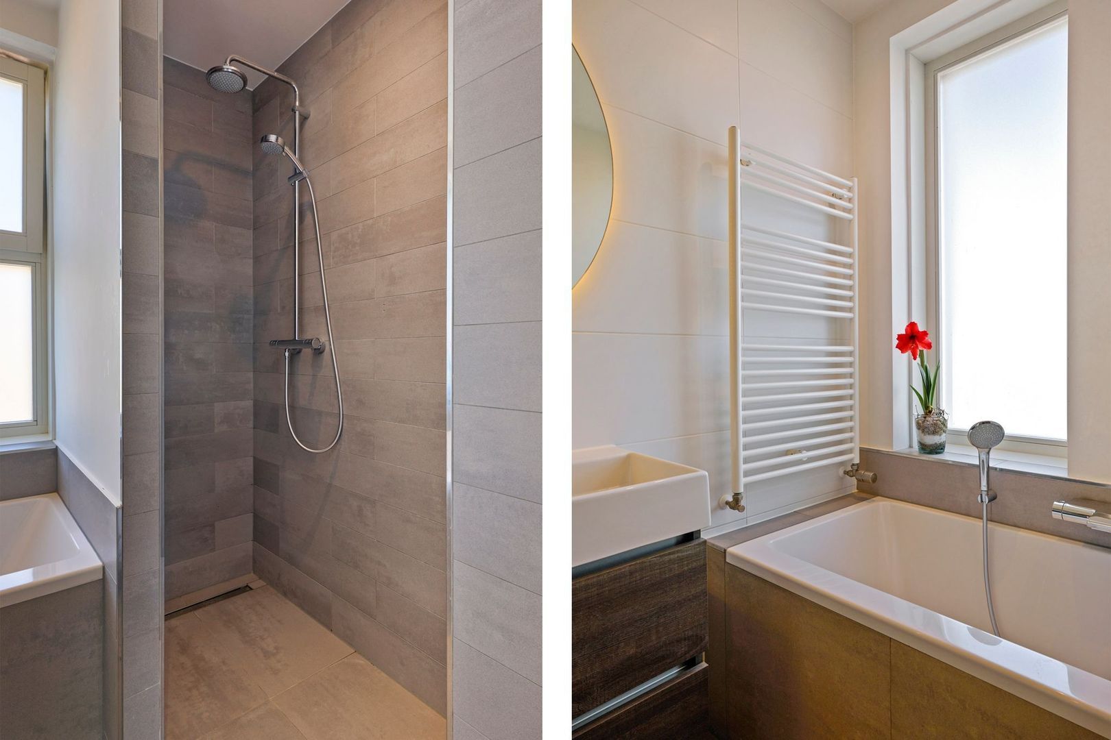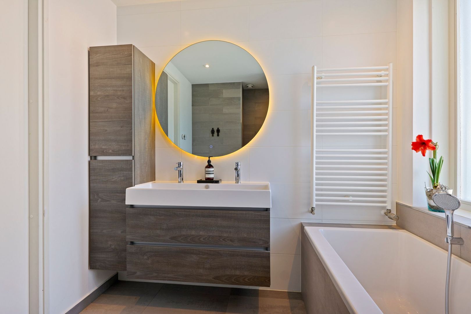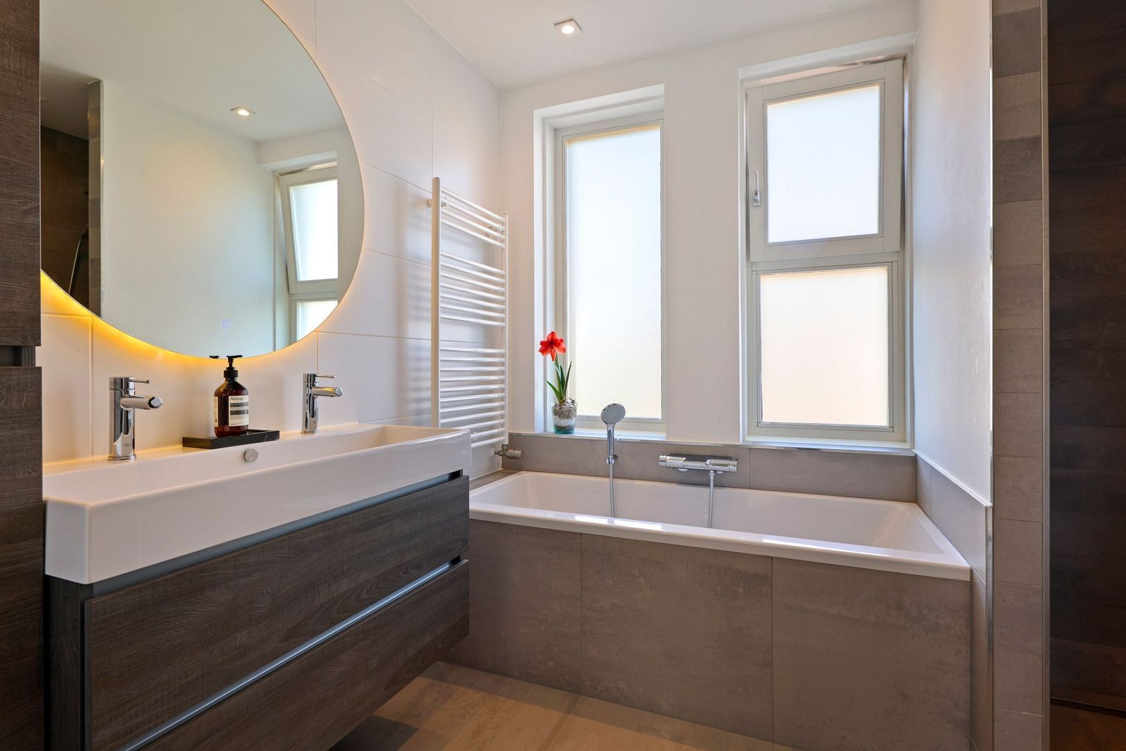 De moderne badkamer met vloerverwarming is volledig verbouwd en grotendeels uitgevoerd met een grijze tegel. Deze smaakvolle badkamer is voorzien van een inloopdouche, ligbad, toilet, een breed houtlook wastafelmeubel met dubbele kraan en verlichte spiegels. Een prettig detail is het raam wat zorgt voor natuurlijk daglicht en extra ventilatie.