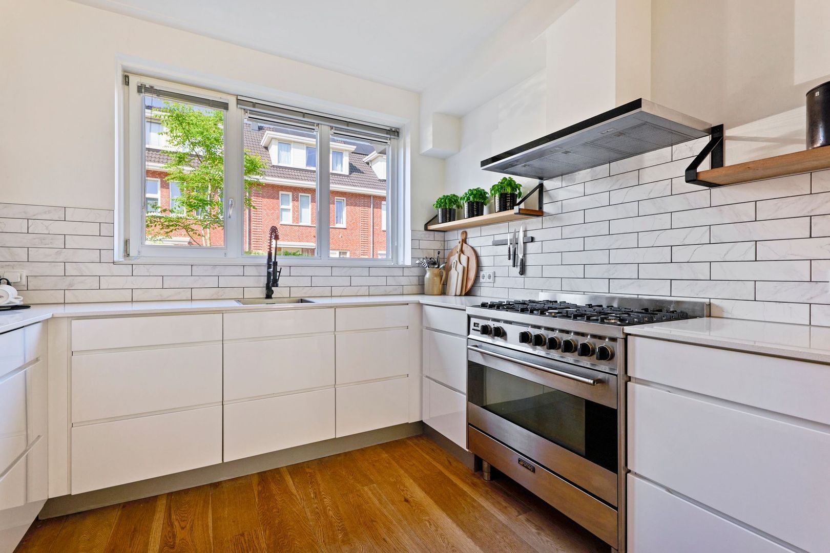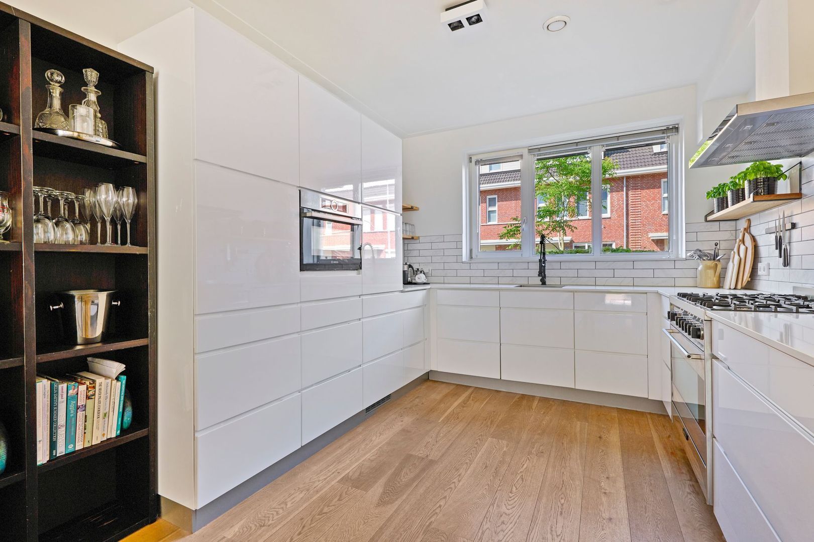 De open keuken ligt aan de voorzijde van de woning en is uitgevoerd in een witte kleurstelling met een licht stenen werkblad. De keuken is volledig voorzien van inbouwapparatuur met o.a. een Smeg 6-pits gasfornuis met oven, ingebouwde afzuigkap, een extra Bosch oven, vaatwasser en veel extra opbergruimte met greep loze kasten/lades. Vanuit de living is er nog toegang tot een diepe trapkast.