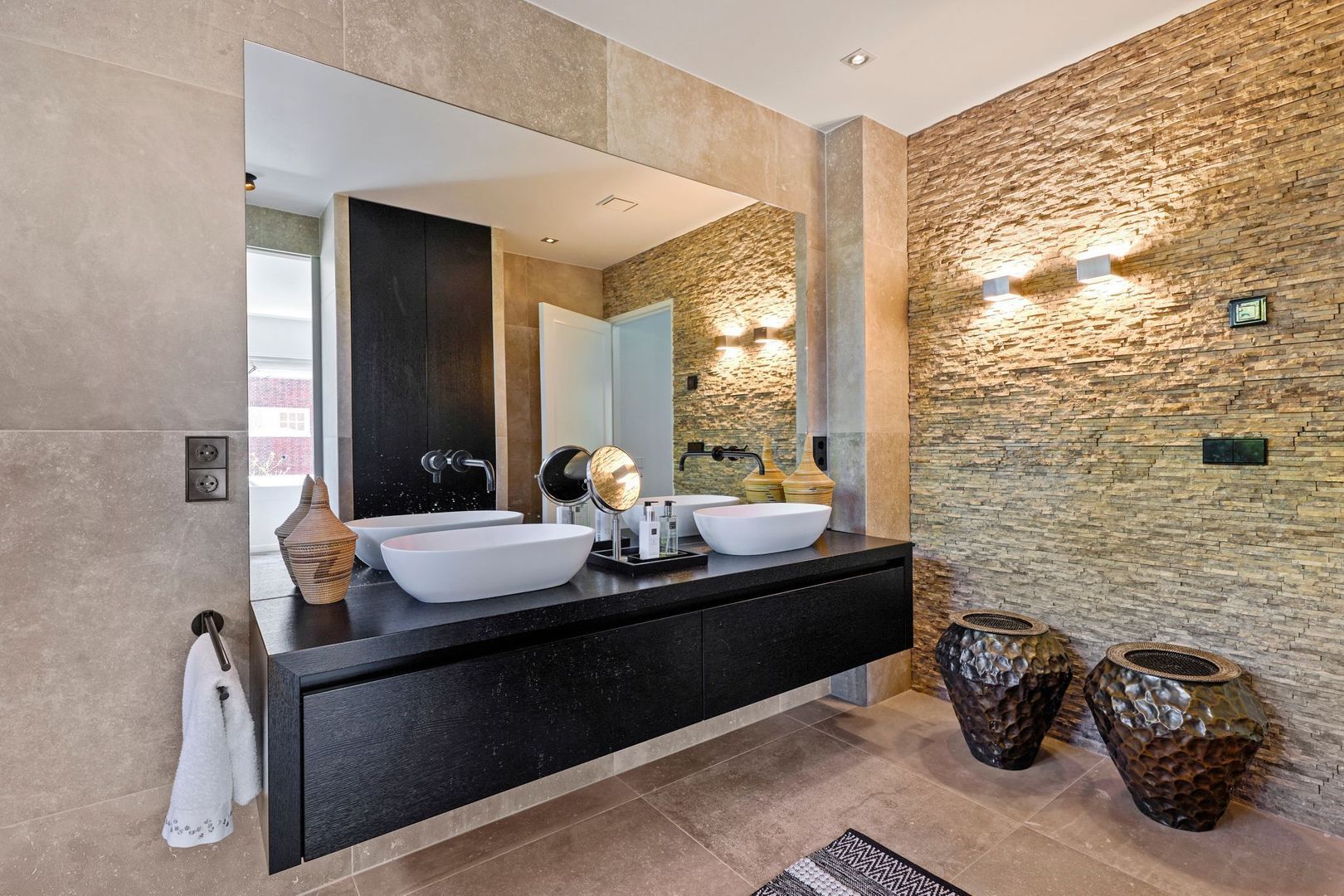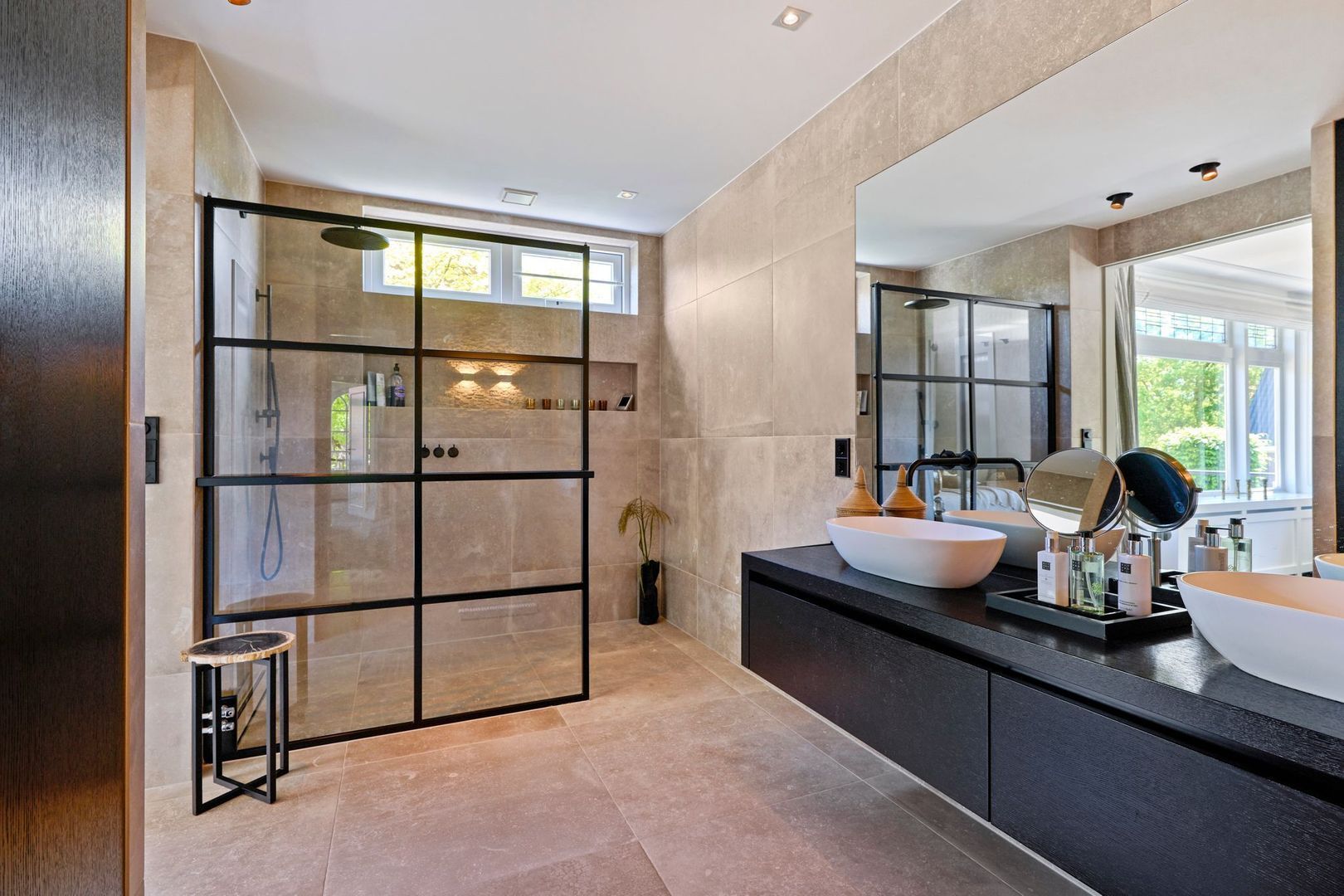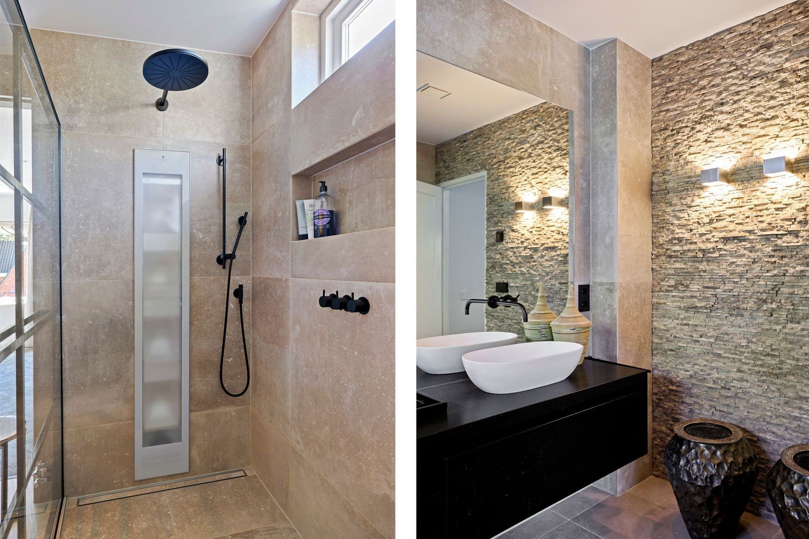 De prachtige badkamer aan de achterzijde is uitgevoerd met een grote zandkleurige vloer- en wandtegel in combinatie met een opvallende robuust betegelde muur. Voorts is de badkamer voorzien van een ruime inloopdouche met stort/handdouche en een infrarood en/of UV douchepaneel en een breed zwart houten wastafelmeubel met tweemaal een mat witte waskom en een ingebouwde zwarte kraan en een brede spiegelwand. Tenslotte is deze badkamer nog voorzien van een plafondhoge inbouwkast.
