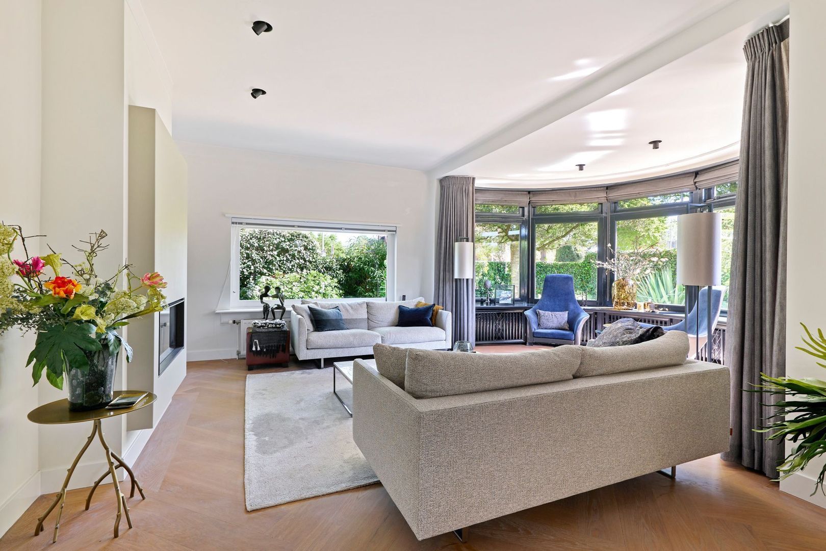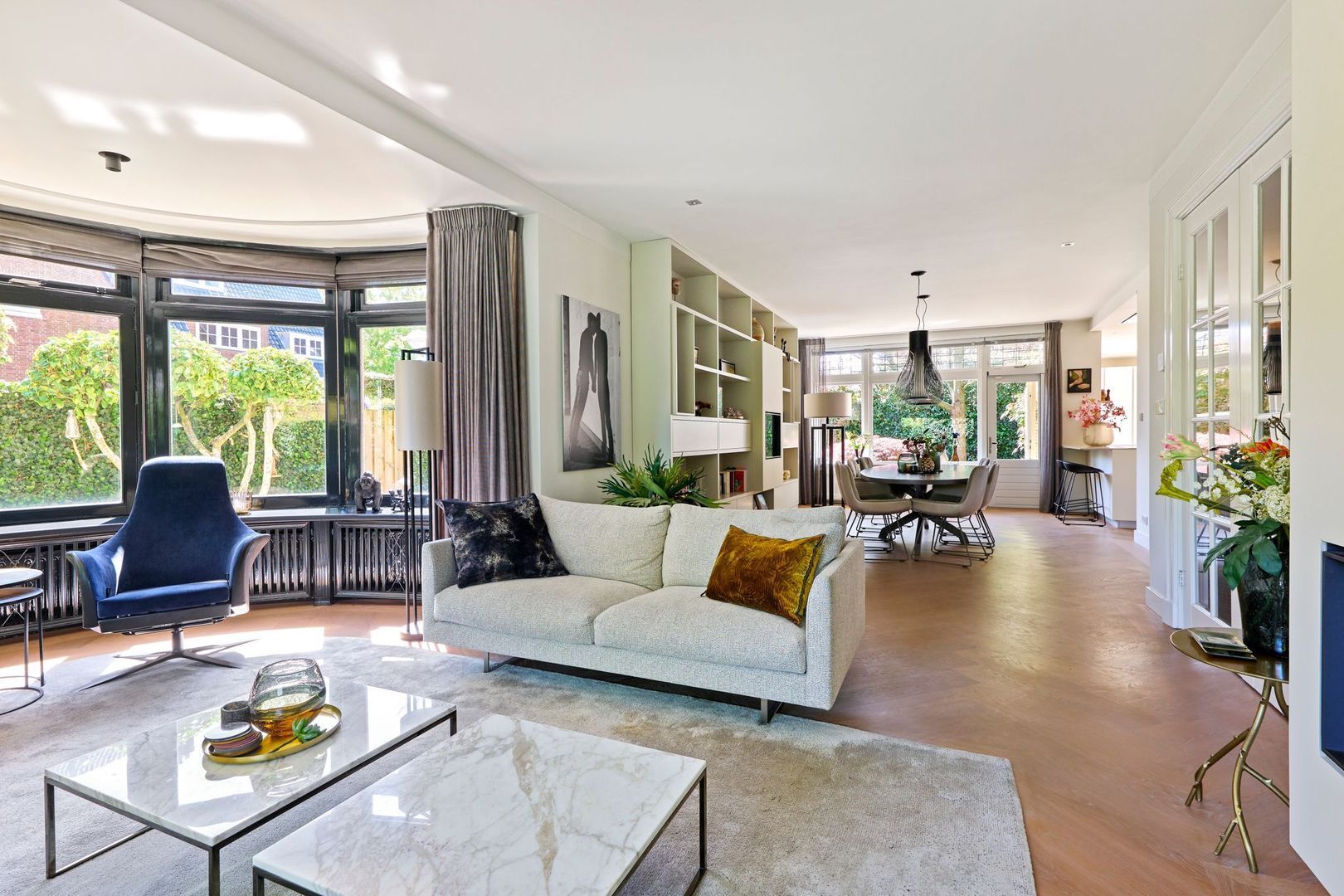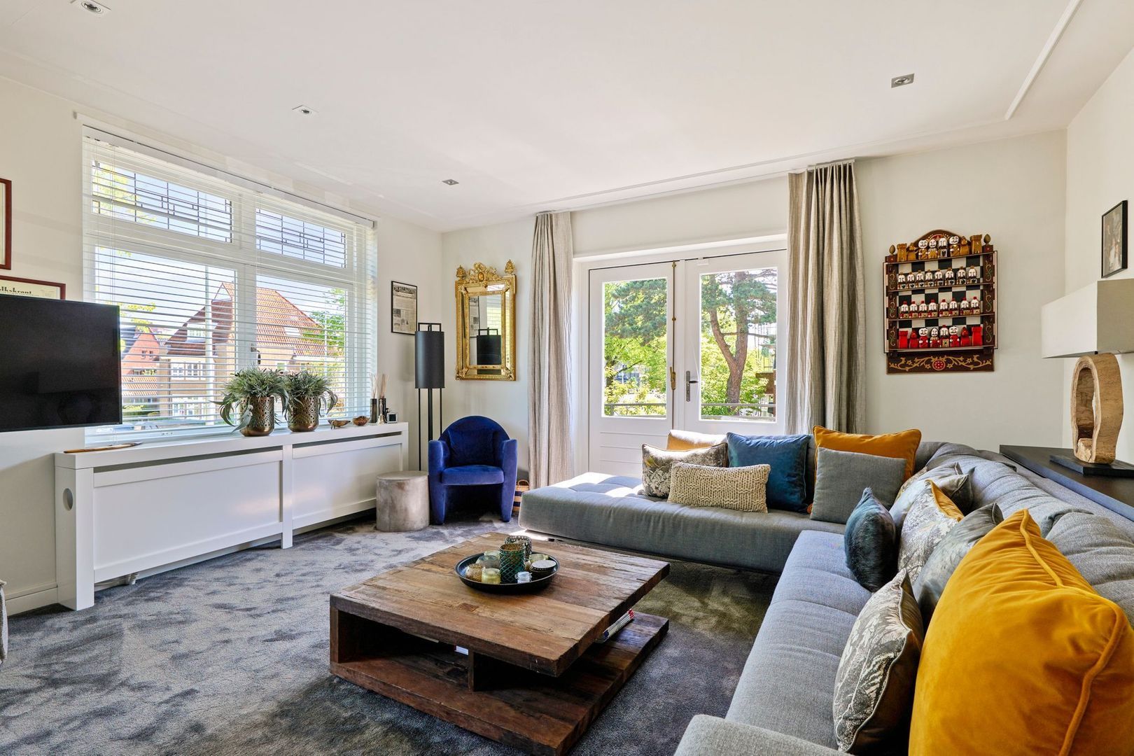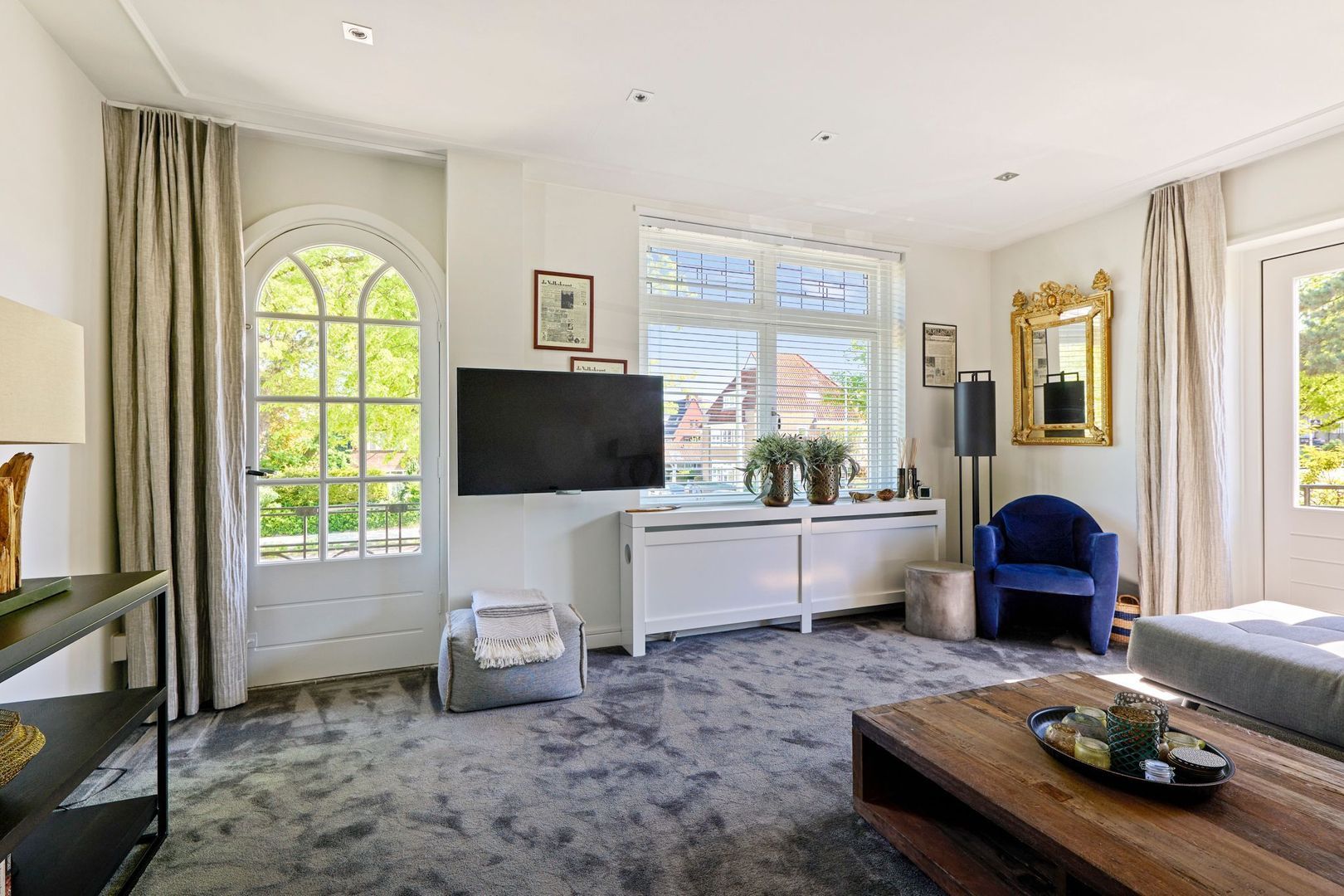 Aan de voorzijde ligt een tweede ruime kamer, thans in gebruik als leefruimte en voorzien van een charmante ronde deur naar een Frans balkon evenals openslaande deuren naar een rond balkon aan de Richard Wagnerstraat.