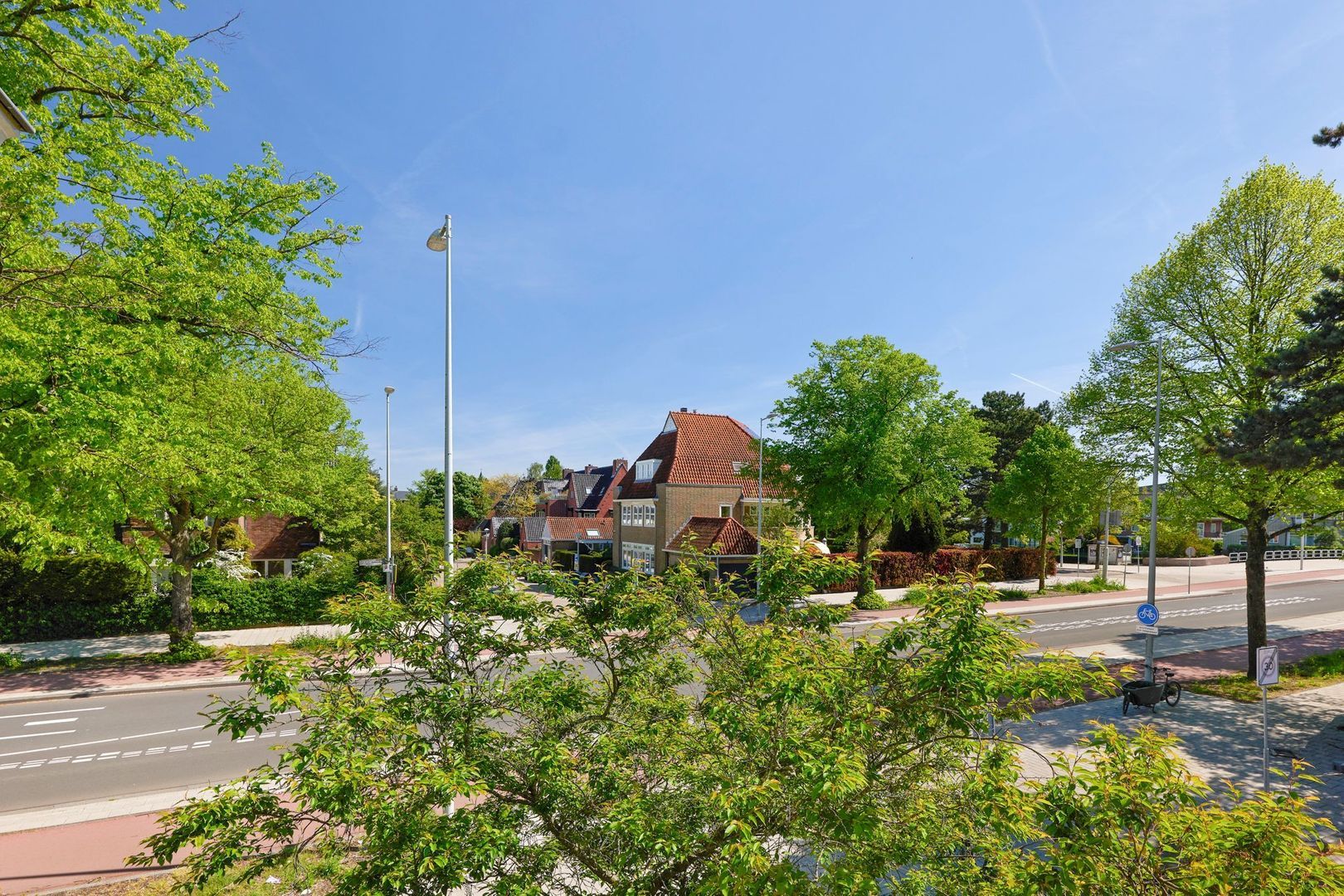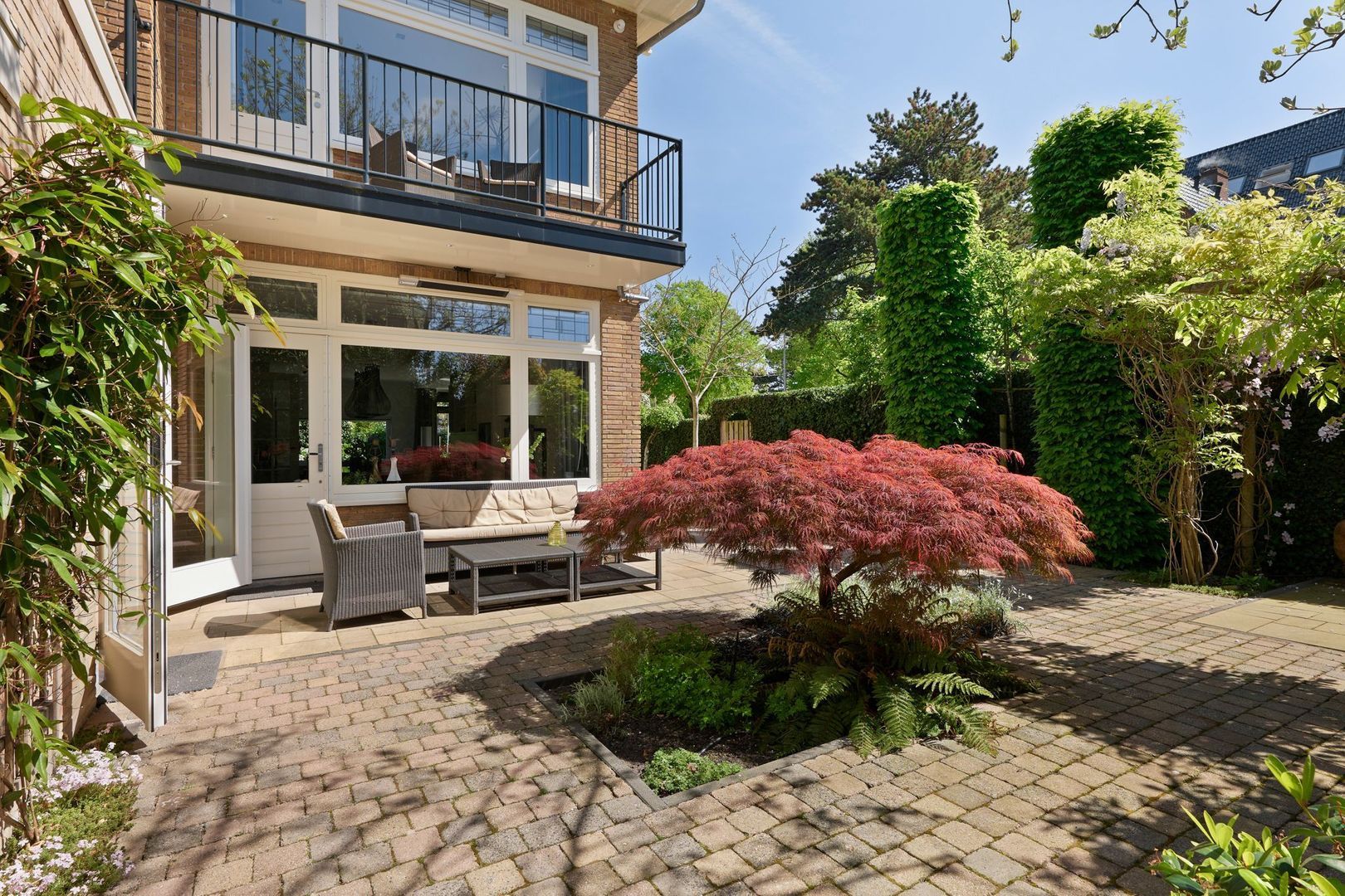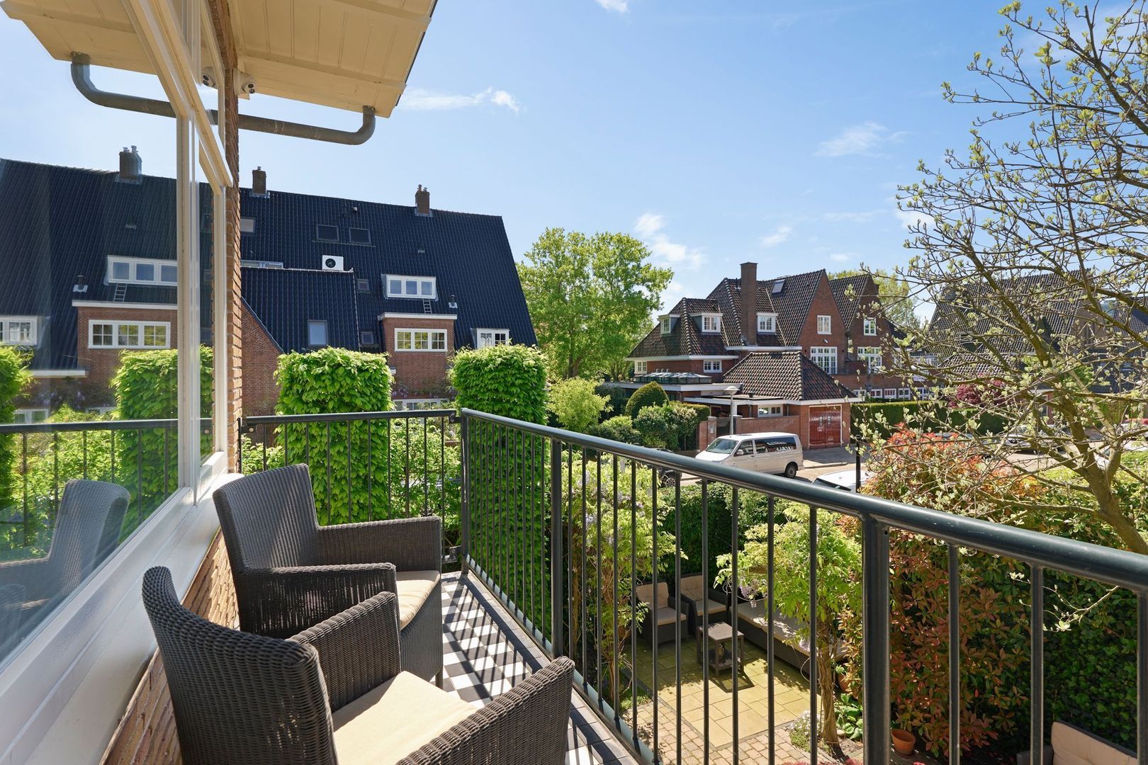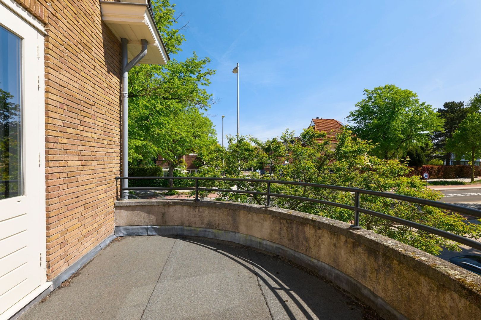 Aan de voorzijde ligt een tweede ruime kamer, thans in gebruik als leefruimte en voorzien van een charmante ronde deur naar een Frans balkon evenals openslaande deuren naar een rond balkon aan de Richard Wagnerstraat.