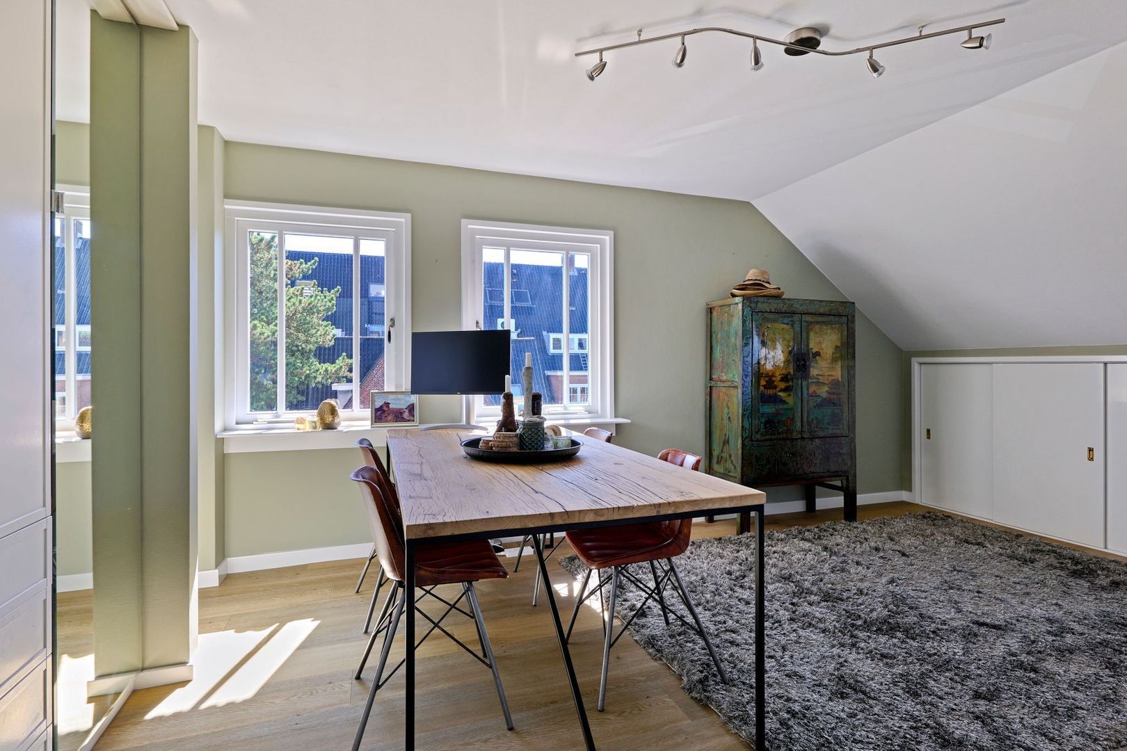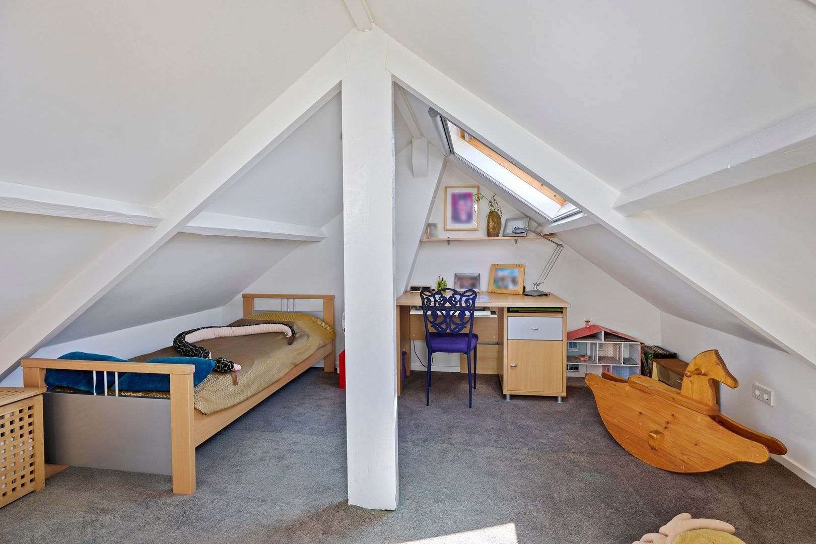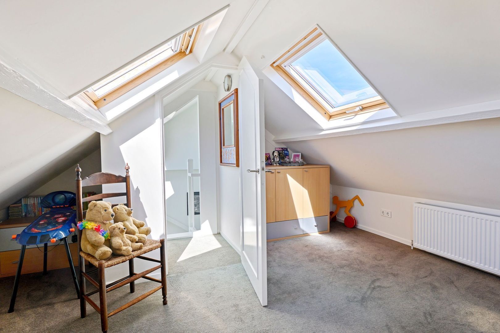 Via de hal leidt de witte open trap naar de bovenste verdieping. Een kleine overloop geeft toegang tot deze ruime zolderkamer, momenteel in gebruik als gasten/speelkamer. De schuine kap aan weerszijden geeft deze kamer een charmant karakter. Met de drie aanwezige Velux ramen is dit een volwaardige (slaap)kamer.