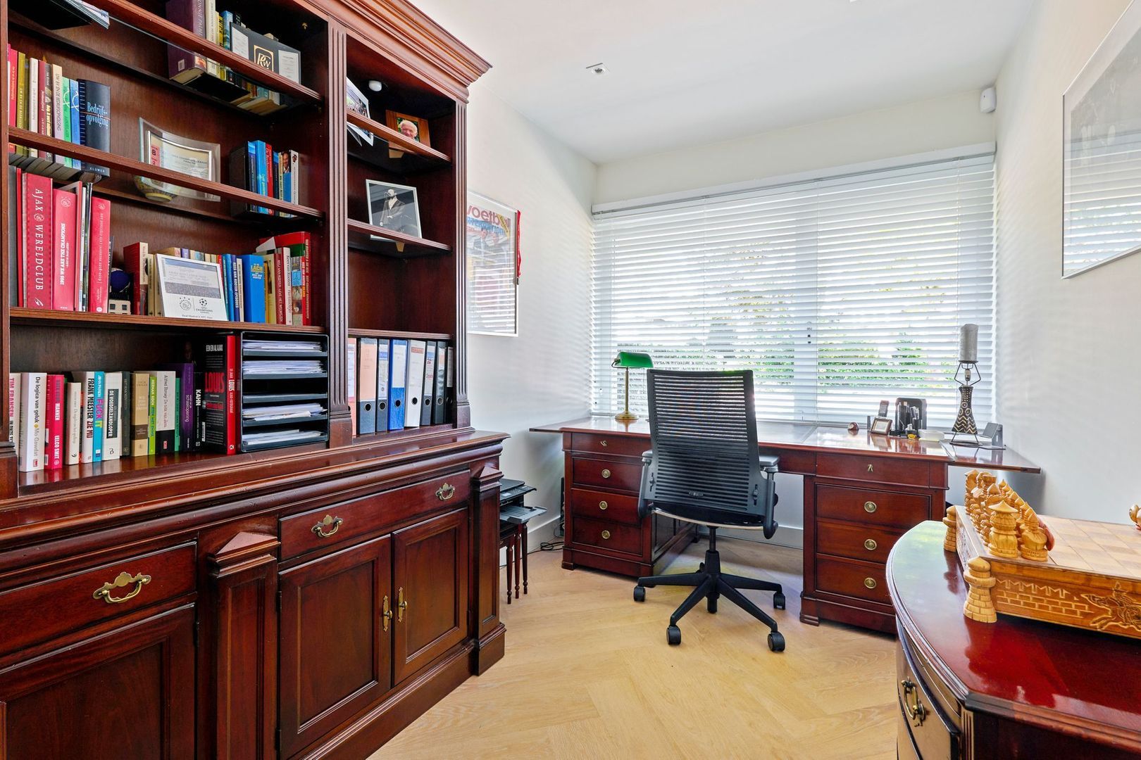 Aan de voorzijde van de begane grond is een ruime werkkamer gelegen welke uitkijkt over de eigen parkeerplaats in de voortuin.