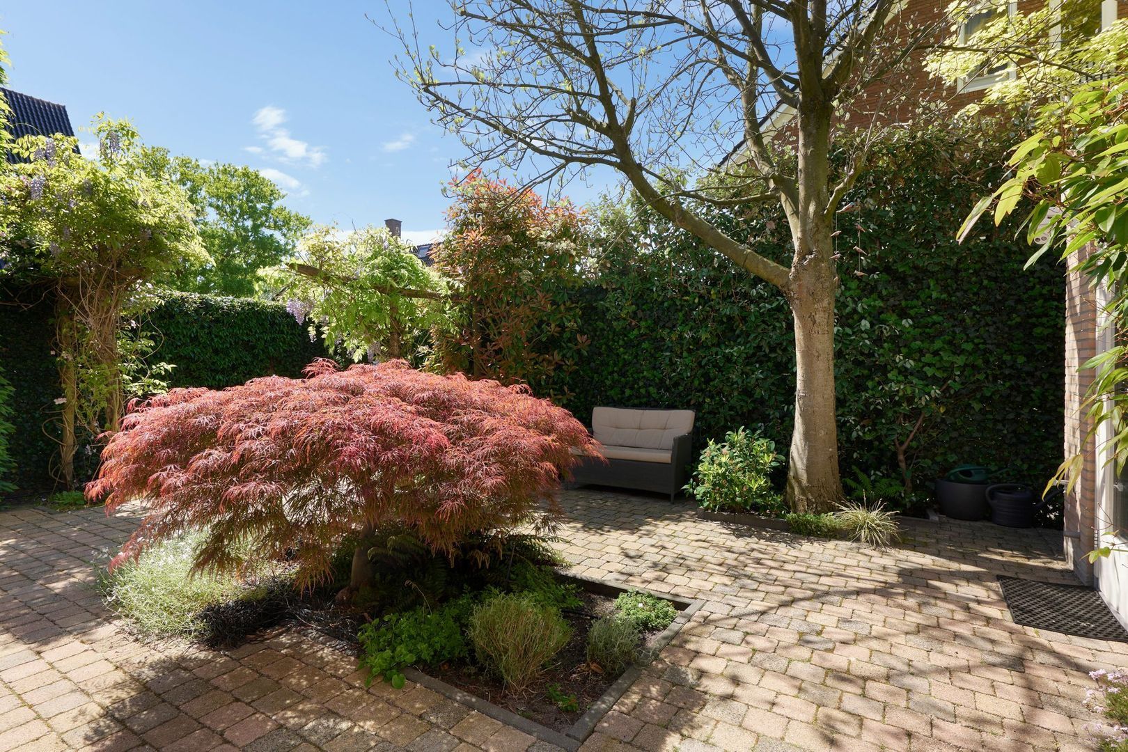 Zowel via de eetkamer als wel de openslaande deuren in de keuken heeft u toegang tot de immense, zonnige tuin van maar liefst 175m². De tuin is driekwart rondom gesitueerd en grotendeels betegeld met groenvoorzieningen aan de rand. Met deze oppervlakte biedt de tuin dan ook meerdere hoekjes voor loungen, eten, zonnen etc. Voorts beschikt de tuin over een bewatering- en sfeervol verlichtingssysteem, een achterom en een aangename schuur met goede bergruimte.