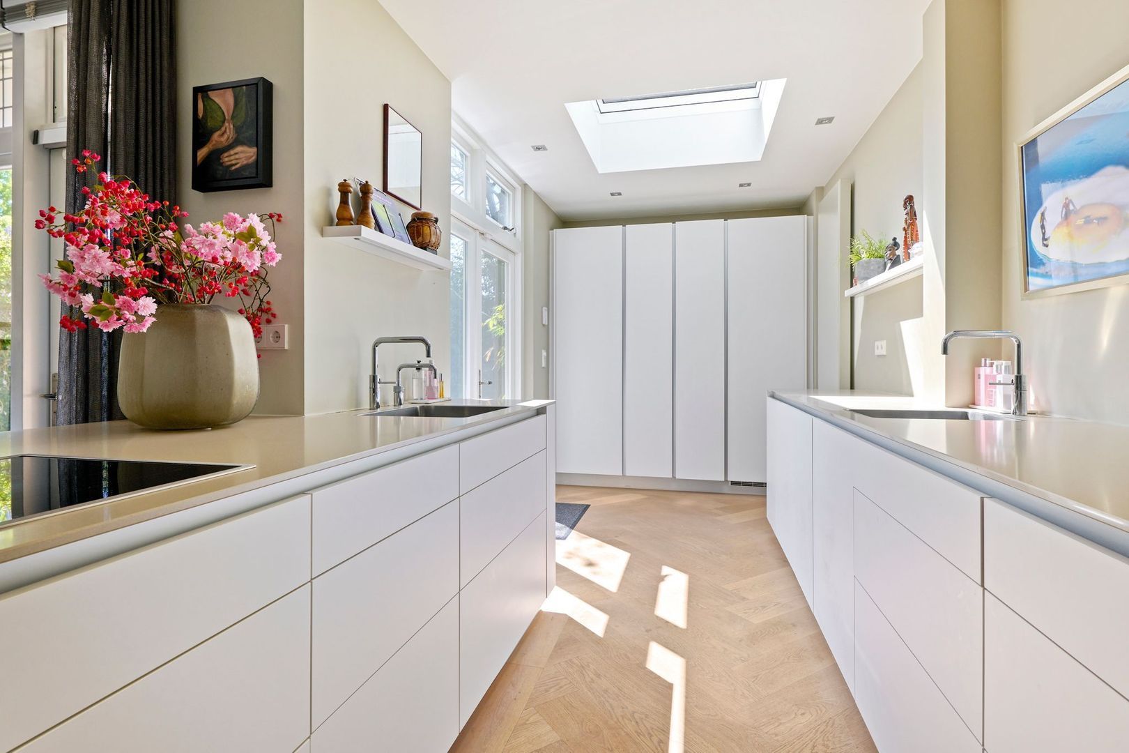 Geheel aan de achterzijde ligt de elegant uitgevoerde keuken, voorzien van een kook/spoeleiland, witte matte kasten/lades in combinatie met een slank zandkleurig werkblad. Deze luxe keuken is aan twee zijdes opgesteld waarbij het kookeiland aan de kamerzijde extra zitgelegenheid biedt. Het eiland met inductiekookplaat is tevens voorzien van een spoelgedeelte met Quooker. De tegenovergelegen apparatuurswand beschikt eveneens over een spoelgedeelte maar ook de overige gewenste inbouwapparatuur met in het bijzonder vermeld de Gaggenau stoomoven en combi oven/magnetron. Een leuk detail is het dakraam, dat zorgt voor nog meer licht in de al heldere keuken.