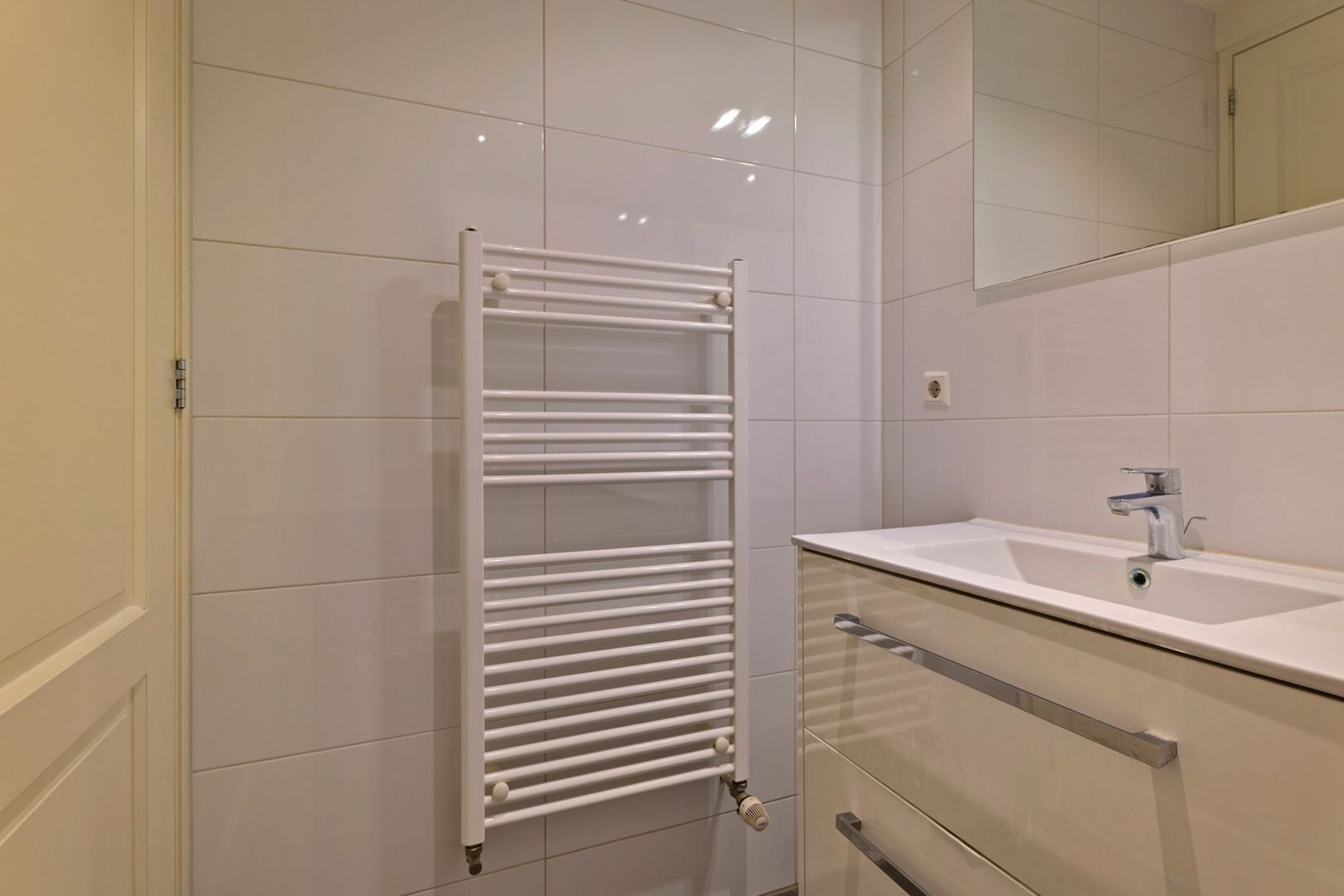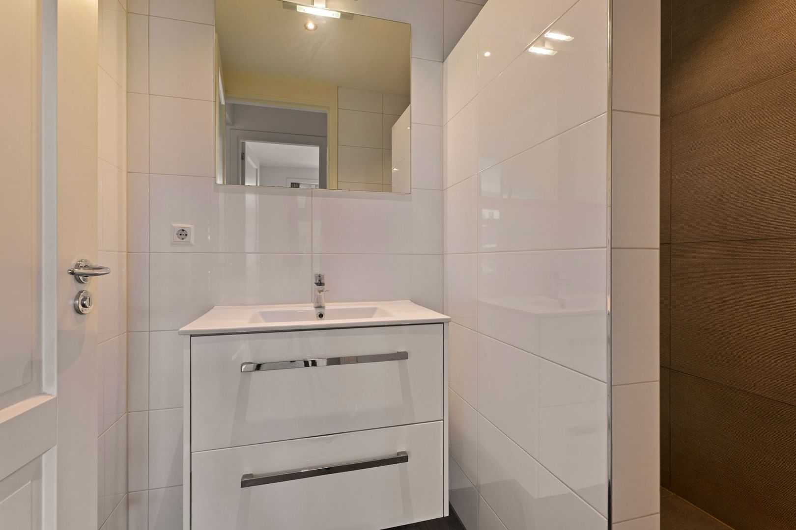 In de hal zijn het separate toilet, de badkamer en een wasmachine/c.v. kast te vinden. Beide sanitaire ruimtes zijn uitgevoerd in een grijs/witte kleurstelling. De badkamer biedt een inloopdouche, een hoogglans wit wastafelmeubel en een handdoekradiator.