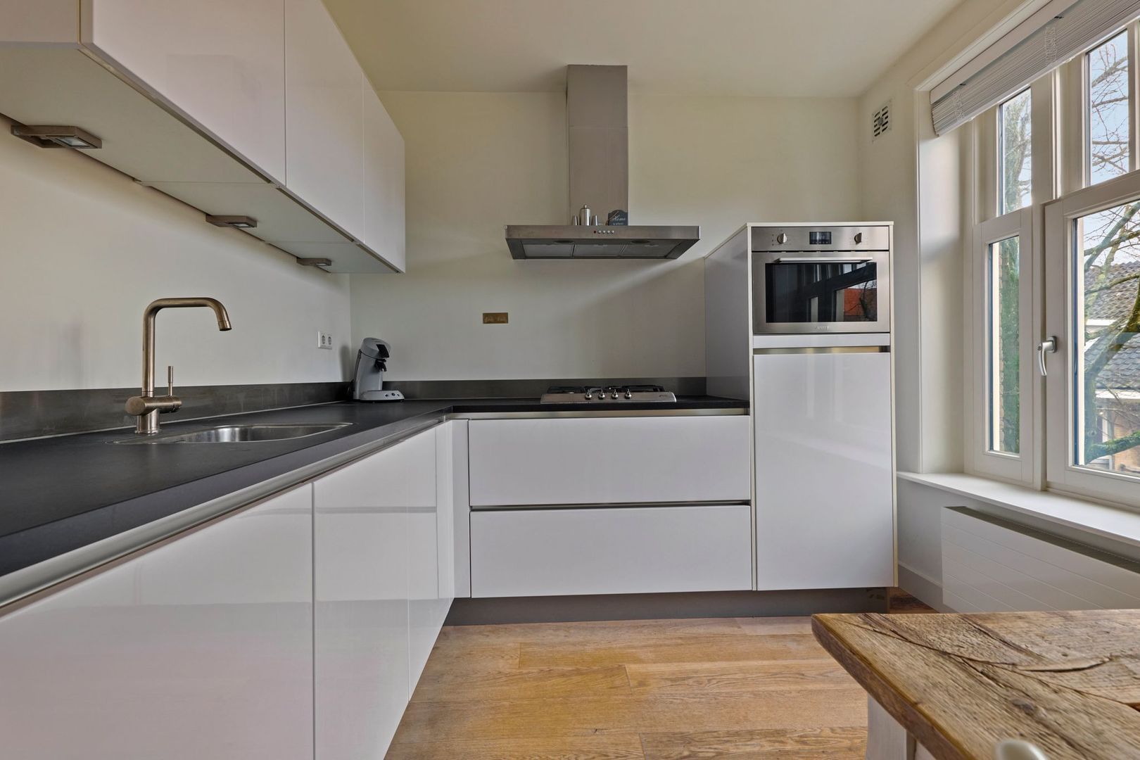 De moderne open keuken heeft een L-opstelling en is voorzien van greeploze, hoogglans witte kasten en lades in combinatie met een donkerkleurig aanrechtblad. Voorts beschikt de keuken over diverse inbouwapparatuur van het vooraanstaande merk “SMEG”.