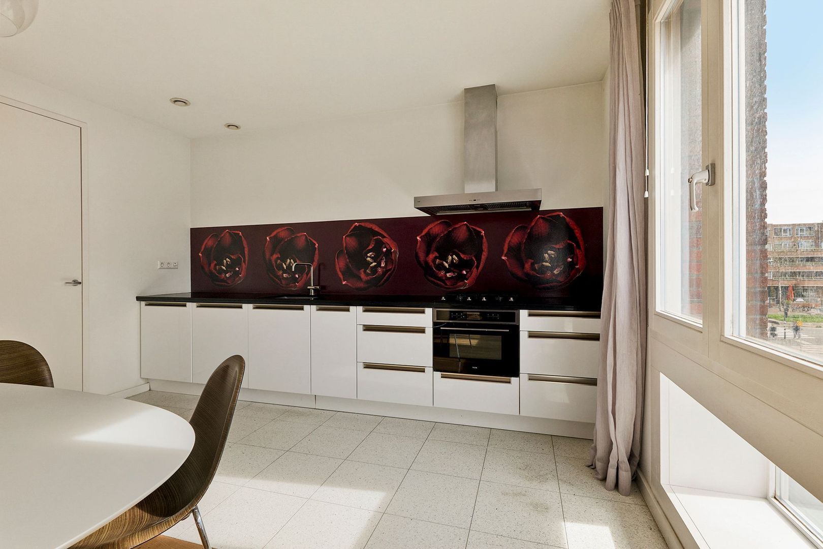 Via de gemeenschappelijke entree met ontvangsthal kun je met de trap of lift naar de woning op de tweede verdieping. De ruime hal biedt ruimte voor een garderobe en geeft toegang tot alle vertrekken. Aan de voorzijde is de brede leefruimte gelegen, voorzien van vier raampartijen inclusief openslaande deuren naar een Frans balkon. Geheel aan de linkerzijde is de open keuken gesitueerd, deze is over de gehele lengte van de kamer geplaatst en uitgevoerd met hoogglans witte kasten en lades met een donker natuurstenen werkblad. Een opvallend detail is de achterwand met fraaie bloemenprint. De keuken is voorzien van diverse inbouwapparatuur. Aansluitend op de keuken geeft een extra deur toegang tot de bijkeuken, voorzien van de wasmachine/drogeraansluiting en de WTW-unit.