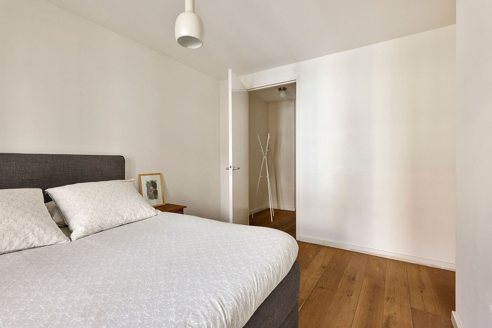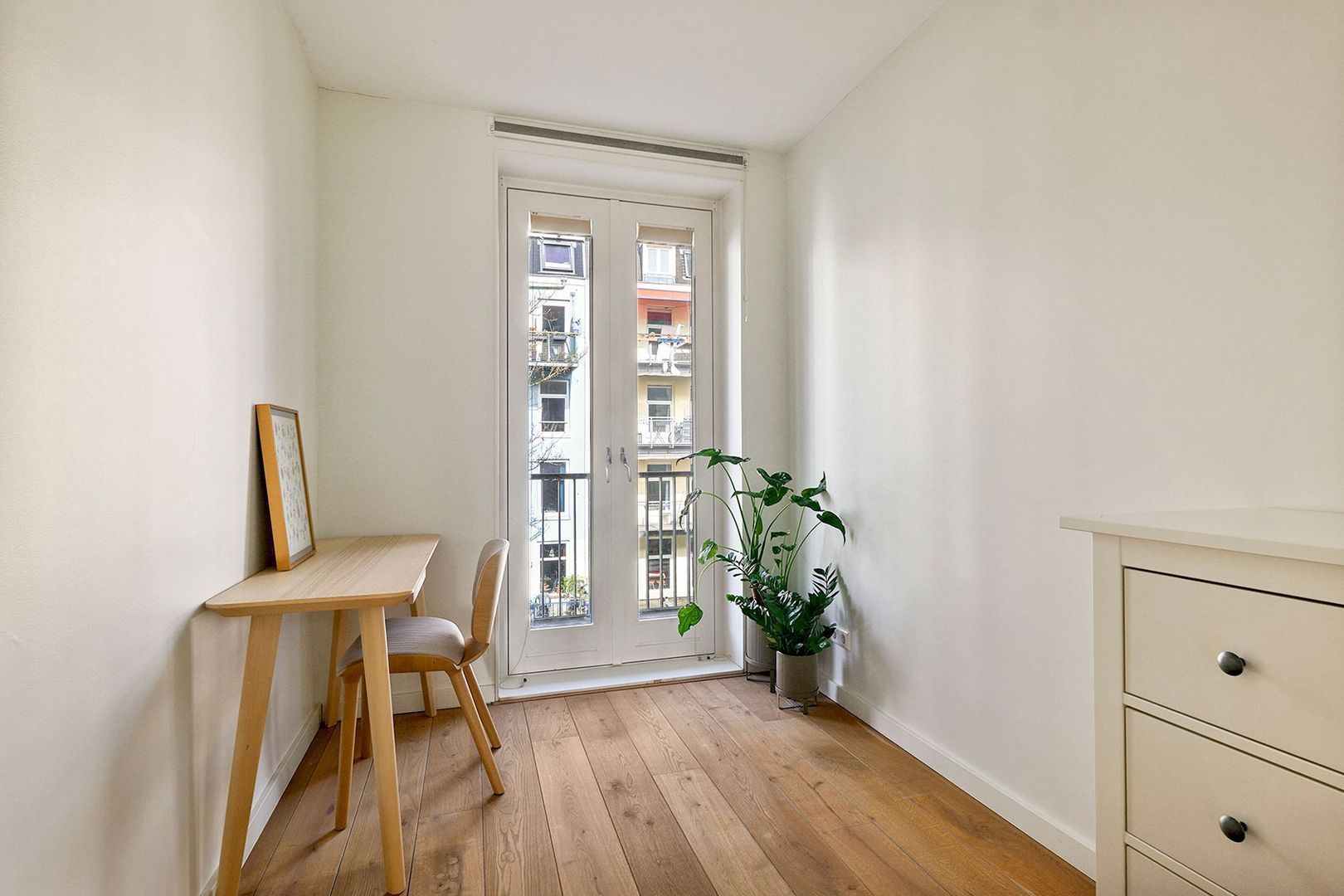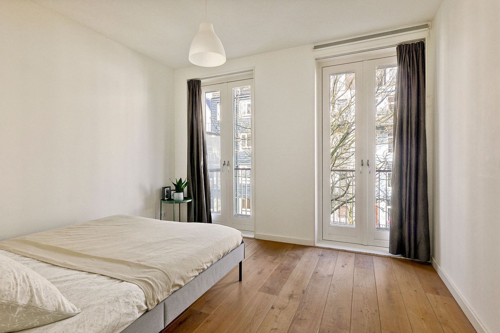De drie slaapkamers zijn aan de achterzijde gelegen en bieden alle drie, middels openslaande deuren, toegang tot het woning brede balkon. Dit balkon van 12m² kijkt uit over de binnentuinen. De hoofdslaapkamer is geheel aan de rechterzijde te vinden. Deze kamer beschikt nog over een afsluitbare inloopkast. De middelste kamer is momenteel in gebruik als werkkamer maar kan prima dienen als kinderkamer. De linkerkamer, tenslotte, is tevens goed van formaat en biedt zelfs tweemaal toegang tot voornoemd balkon.