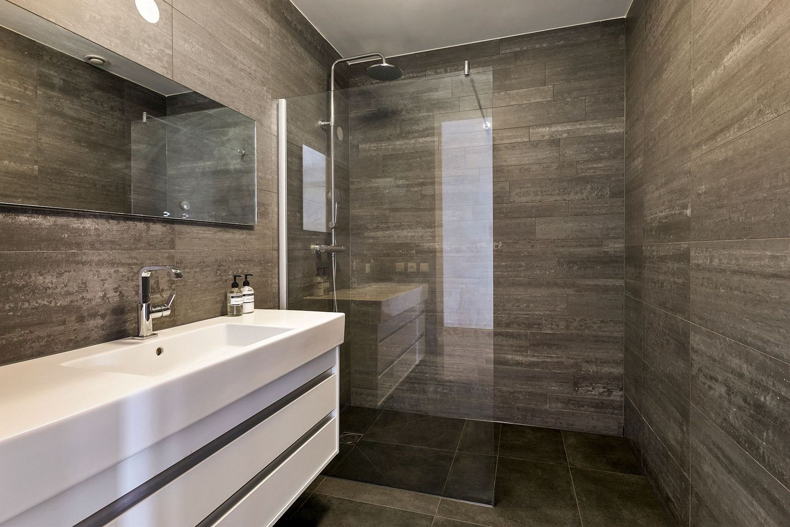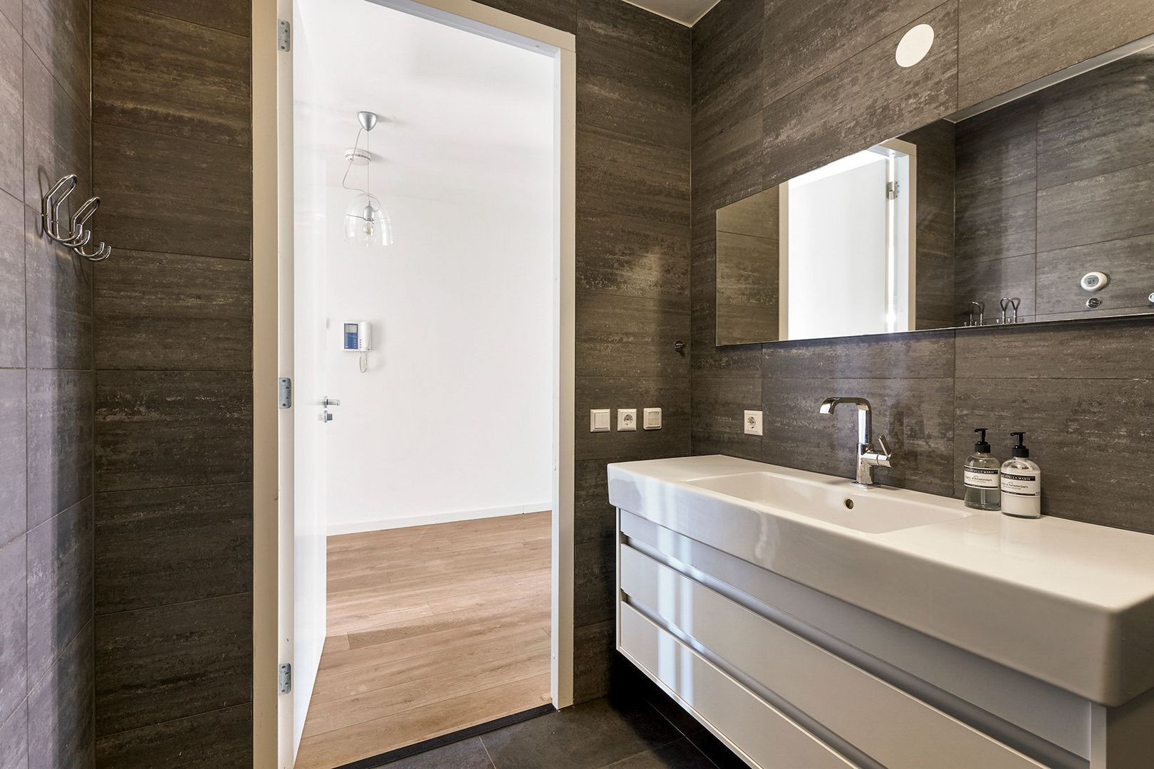 In het midden van de woning zijn de sanitaire ruimtes gelegen, beide uitgevoerd in een donkergrijze kleurstelling. De badkamer is voorzien van een breed hoogglans wit wastafelmeubel en een inloopdouche met stort- en handdouche.