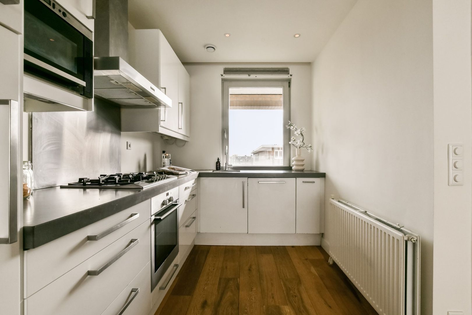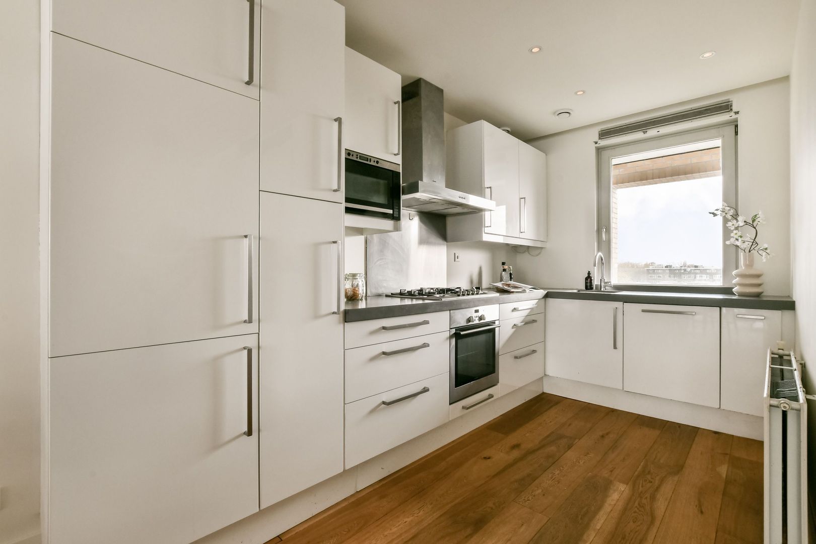 De open keuken is modern uitgevoerd in een witte kleurstelling met een antraciet werkblad en beschikt over diverse inbouwapparatuur, waaronder een koelkast, vriezer, vaatwasser, vijfpits gasfornuis, oven en magnetron. Daarnaast is er voldoende bergruimte aanwezig in de lades en kasten.
