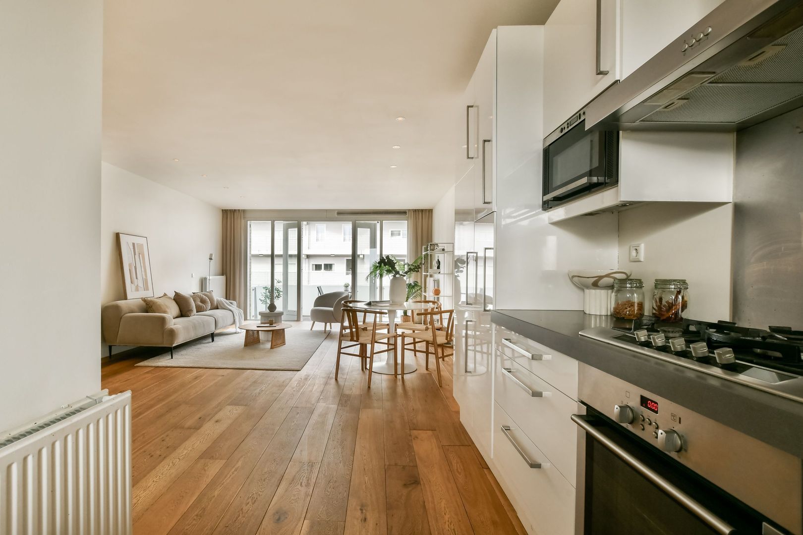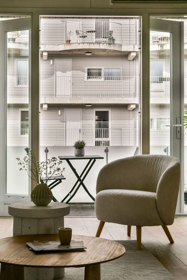 Bij binnenkomst treft u direct de royale en lichte woonkamer, welke voldoende ruimte biedt voor zowel een comfortabele zit- als eethoek. Middels openslaande deuren heeft u toegang tot het zonnige balkon van 6m², gelegen op het zuid-west. Het balkon beschikt over een zonnescherm. Vanaf het balkon geniet u van een uitzicht over de binnentuin.