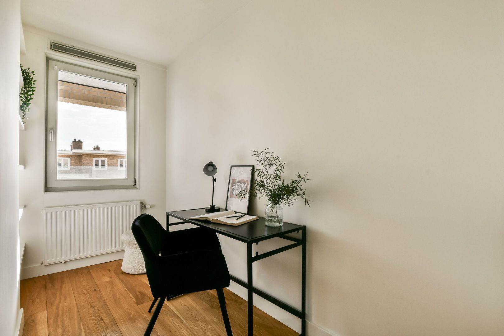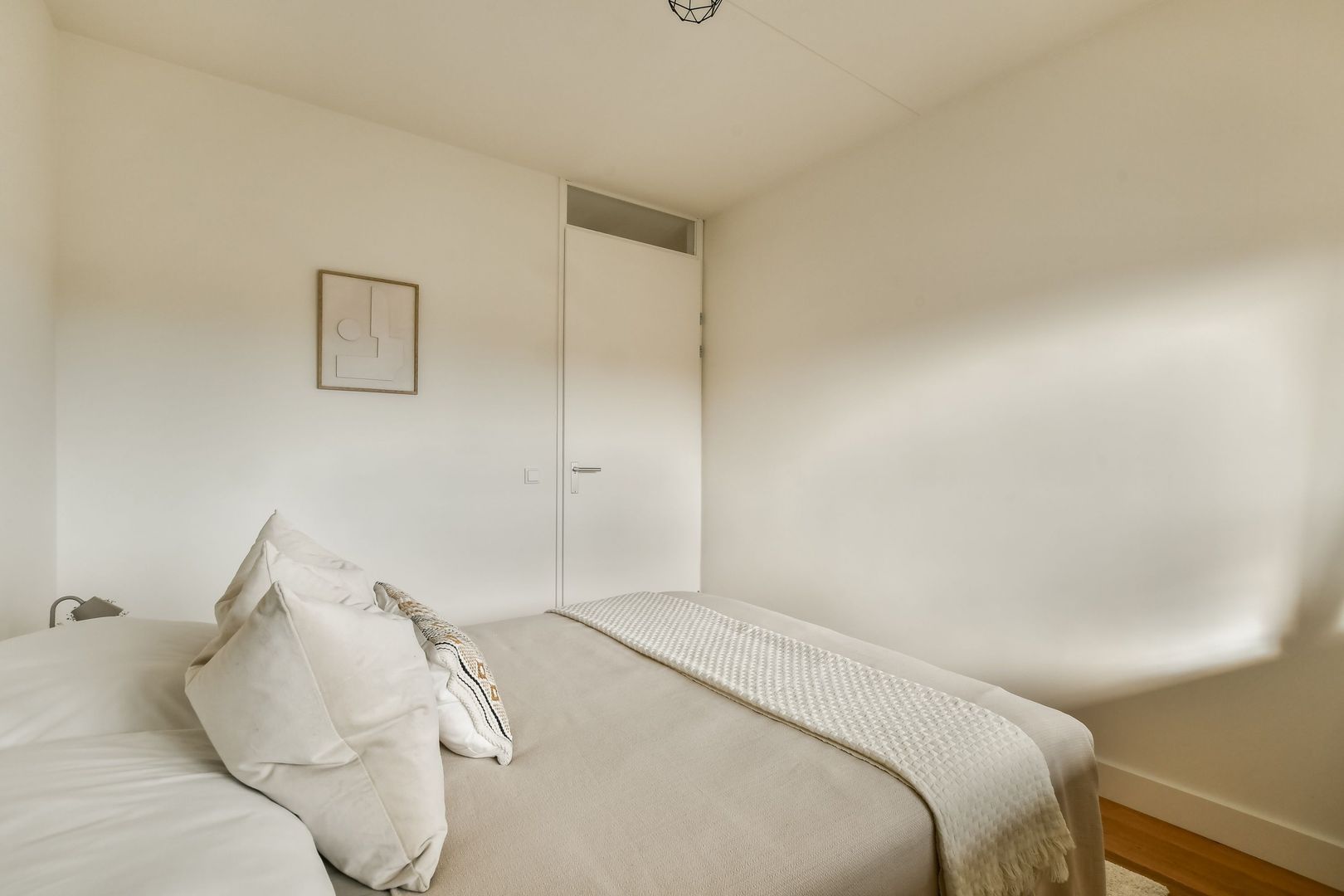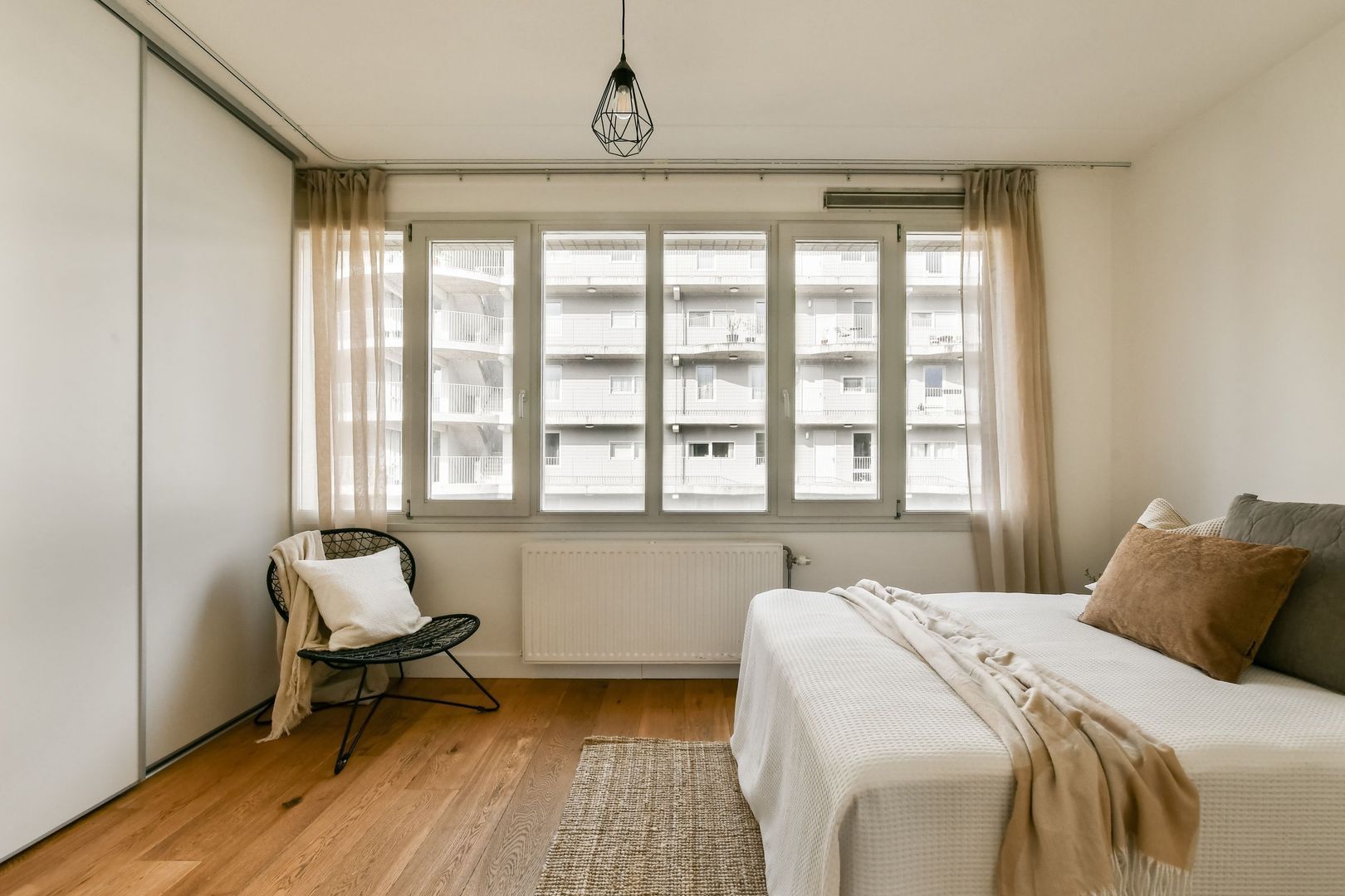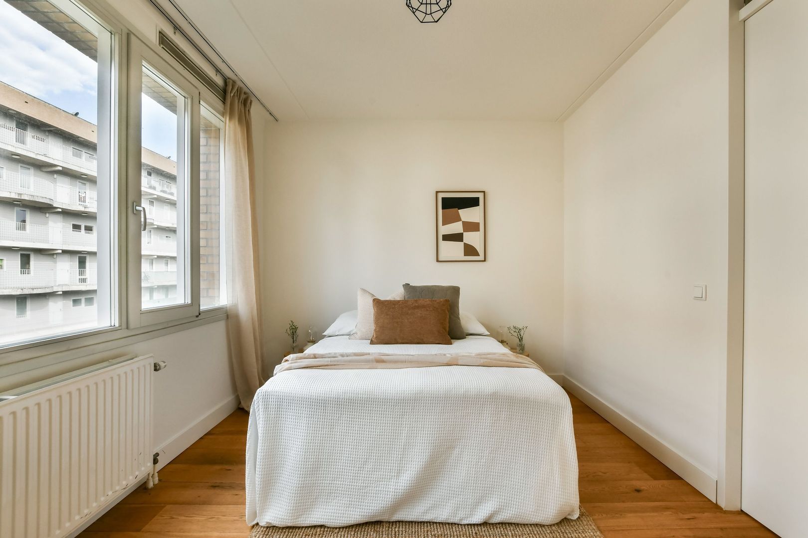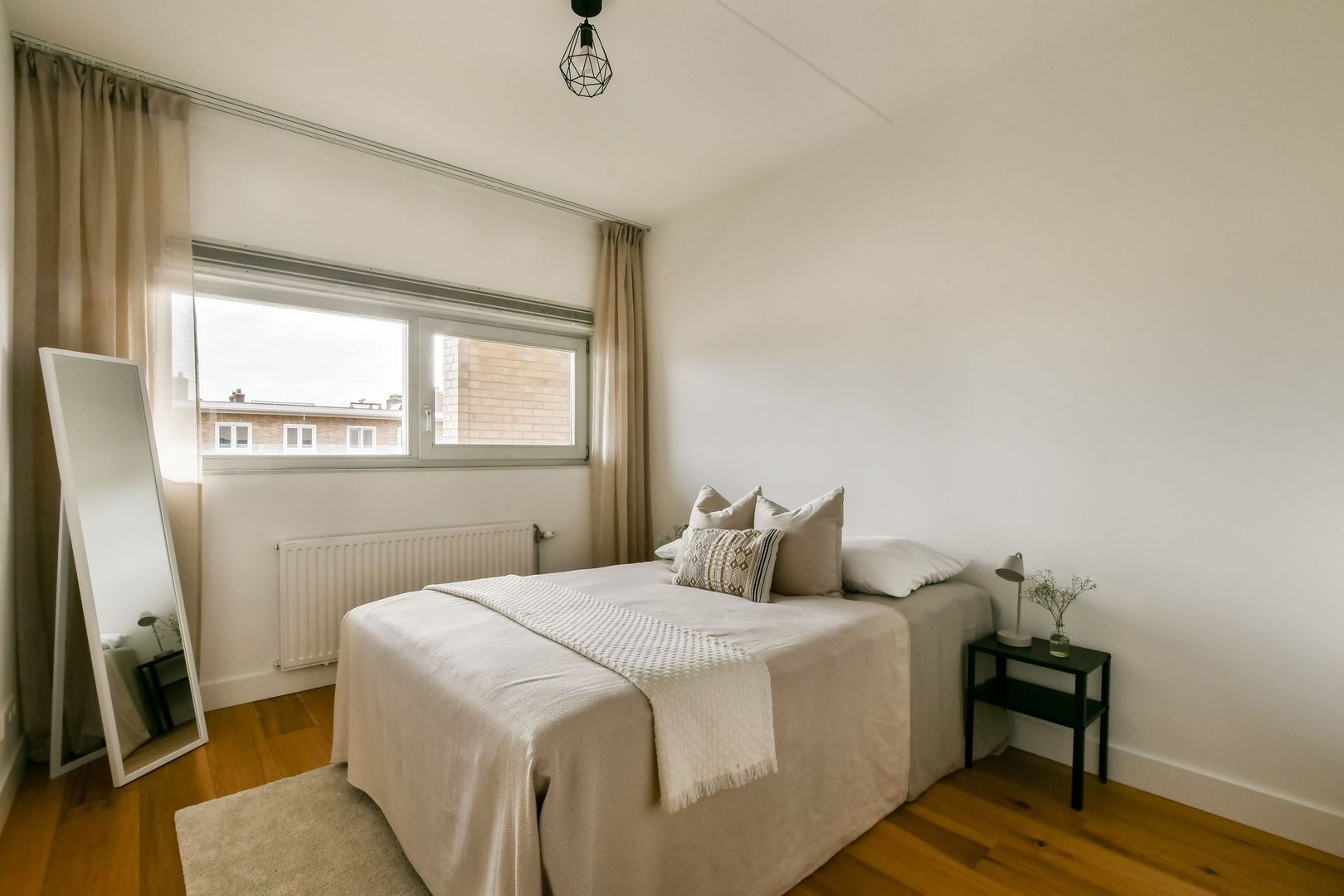 De hoofdslaapkamer is gelegen aan de achterzijde van de woning en kenmerkt zich door de grote raampartijen, wat zorgt voor een lichte uitstraling. Ook hier is voldoende ruimte voor een tweepersoonsbed en een kast.
