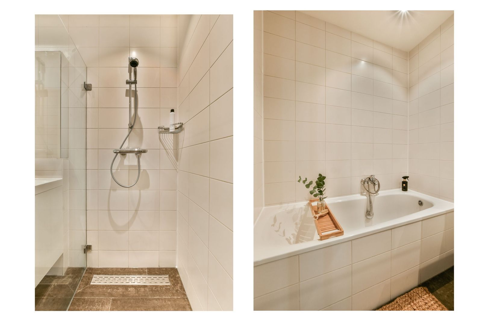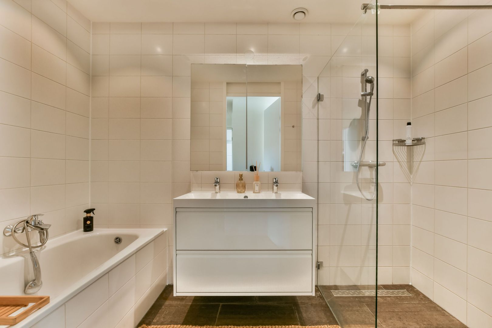 De moderne badkamer is stijlvol afgewerkt met een antraciet vloertegel en witte wandtegels en is voorzien van een ligbad, een inloopdouche met glazen wand en een dubbel wastafelmeubel.