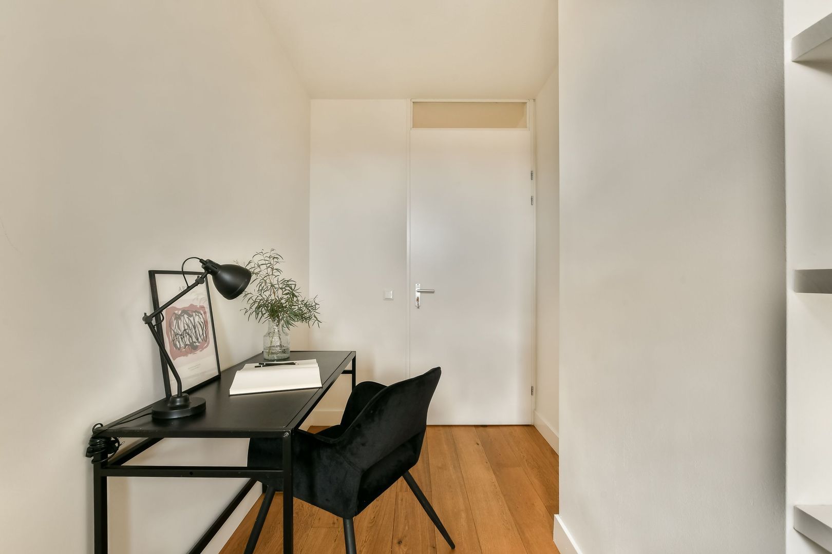 Via de hal bereikt u de overige vertrekken. Aan de voorzijde van de woning bevinden zich twee slaapkamers. De eerste kamer is ruim opgezet en voorzien van grote raampartijen, met voldoende ruimte voor een tweepersoonsbed en een kast. De tweede kamer is ideaal te gebruiken als werk-, hobby- of logeerkamer en beschikt over ingebouwde planken.