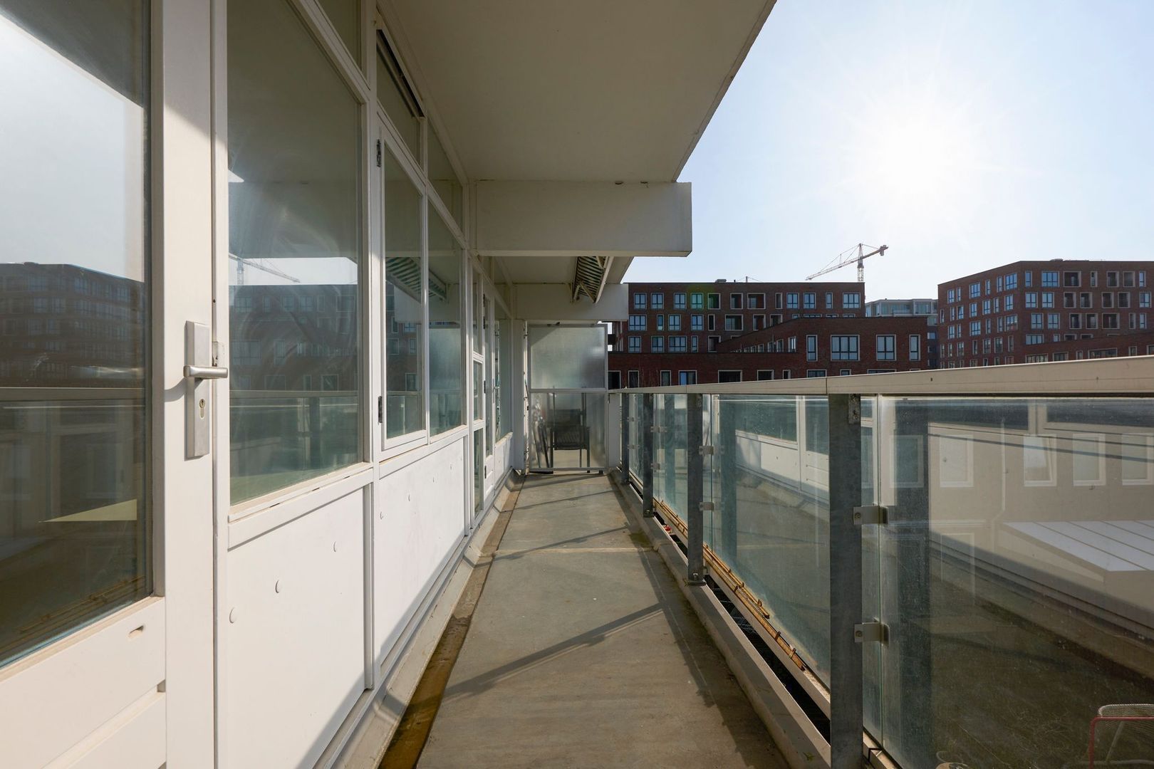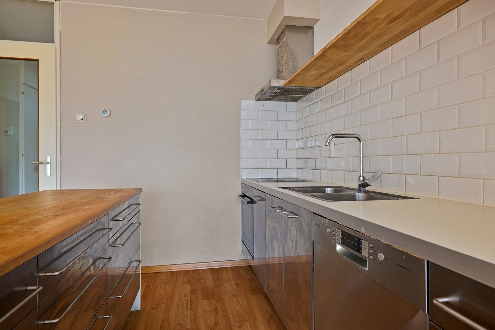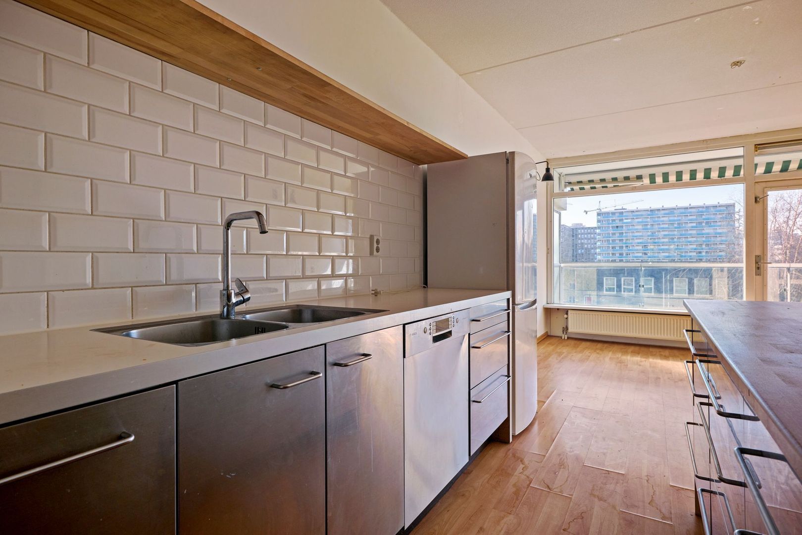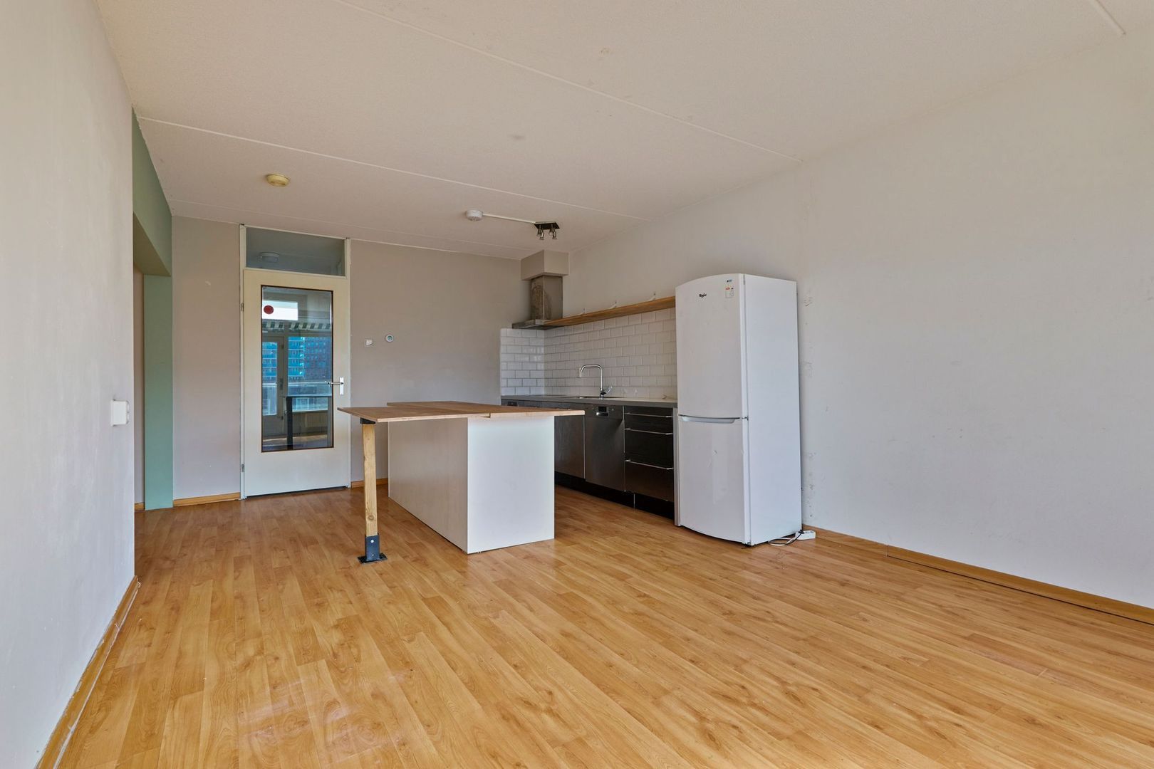 De ruime woonkamer met goede lichtinval geeft toegang tot het woning brede balkon van 14m2 gelegen op het zuidwesten. De open keuken is eenvoudig uitgevoerd met diverse inbouwapparatuur en beschikt over een werkeiland.