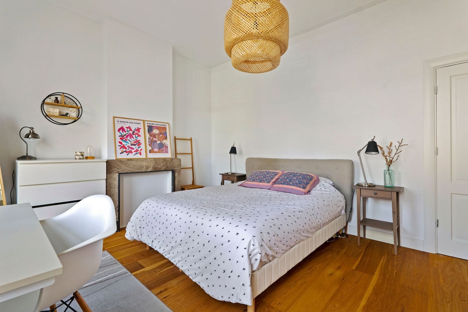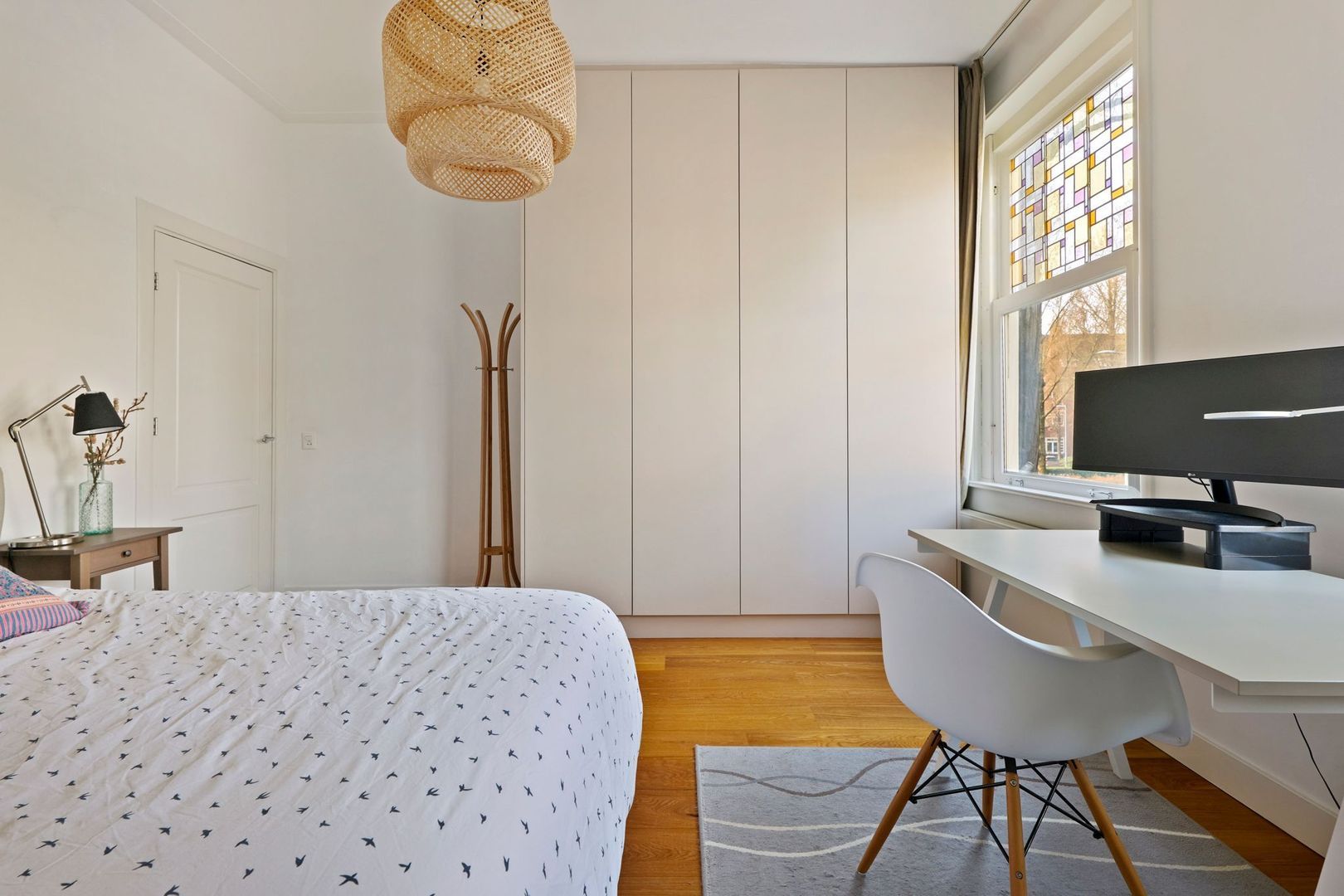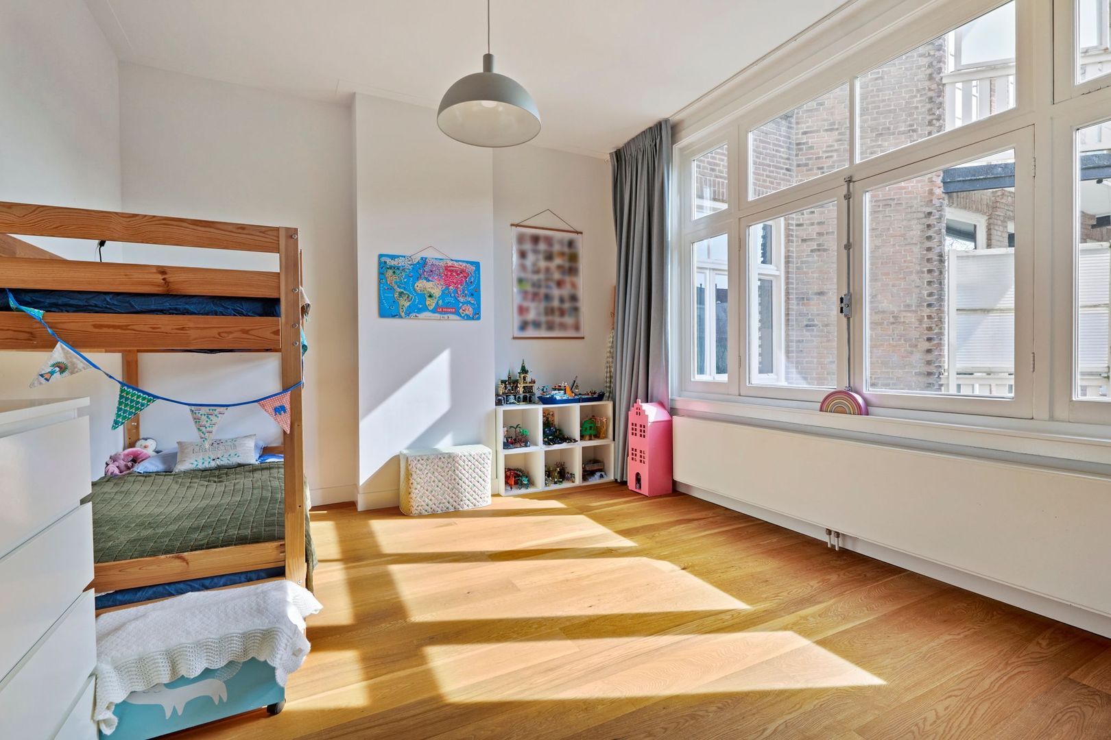 De linkerkamer aan de achterzijde is tevens goed van formaat en beschikt eveneens over een plafondhoge kastenwand. Naastgelegen kamer beslaat een goede kinder/tienerkamer. Beide kamers kijken uit over binnentuin.
