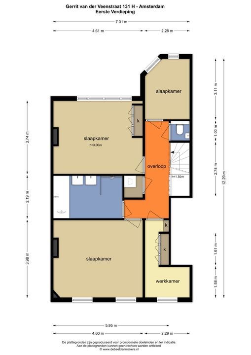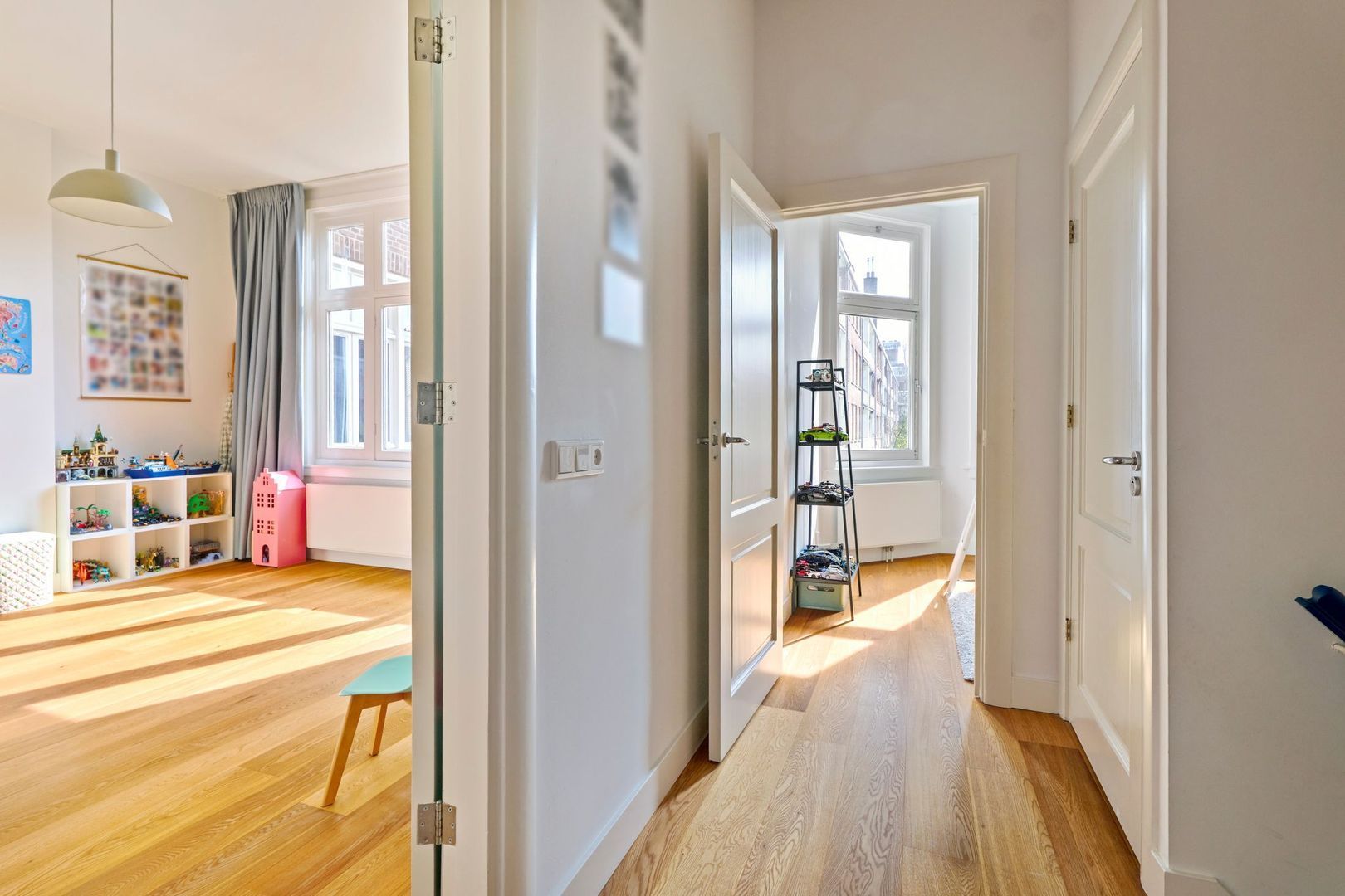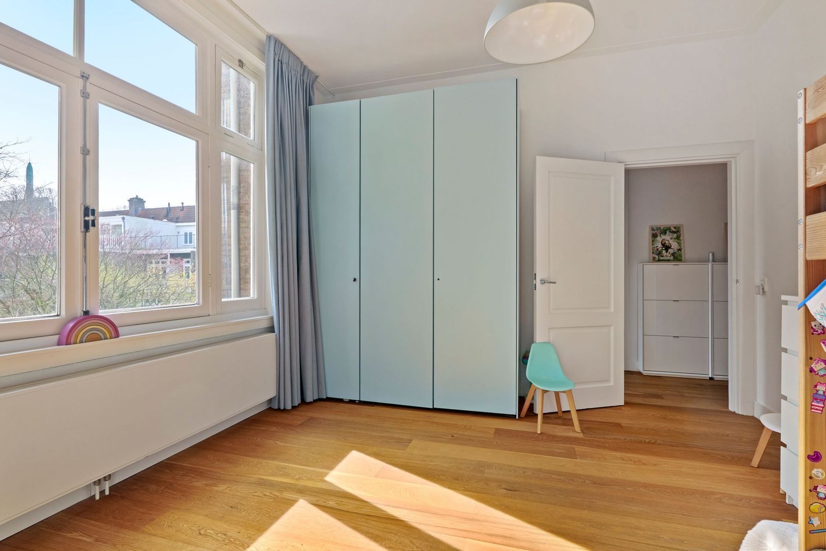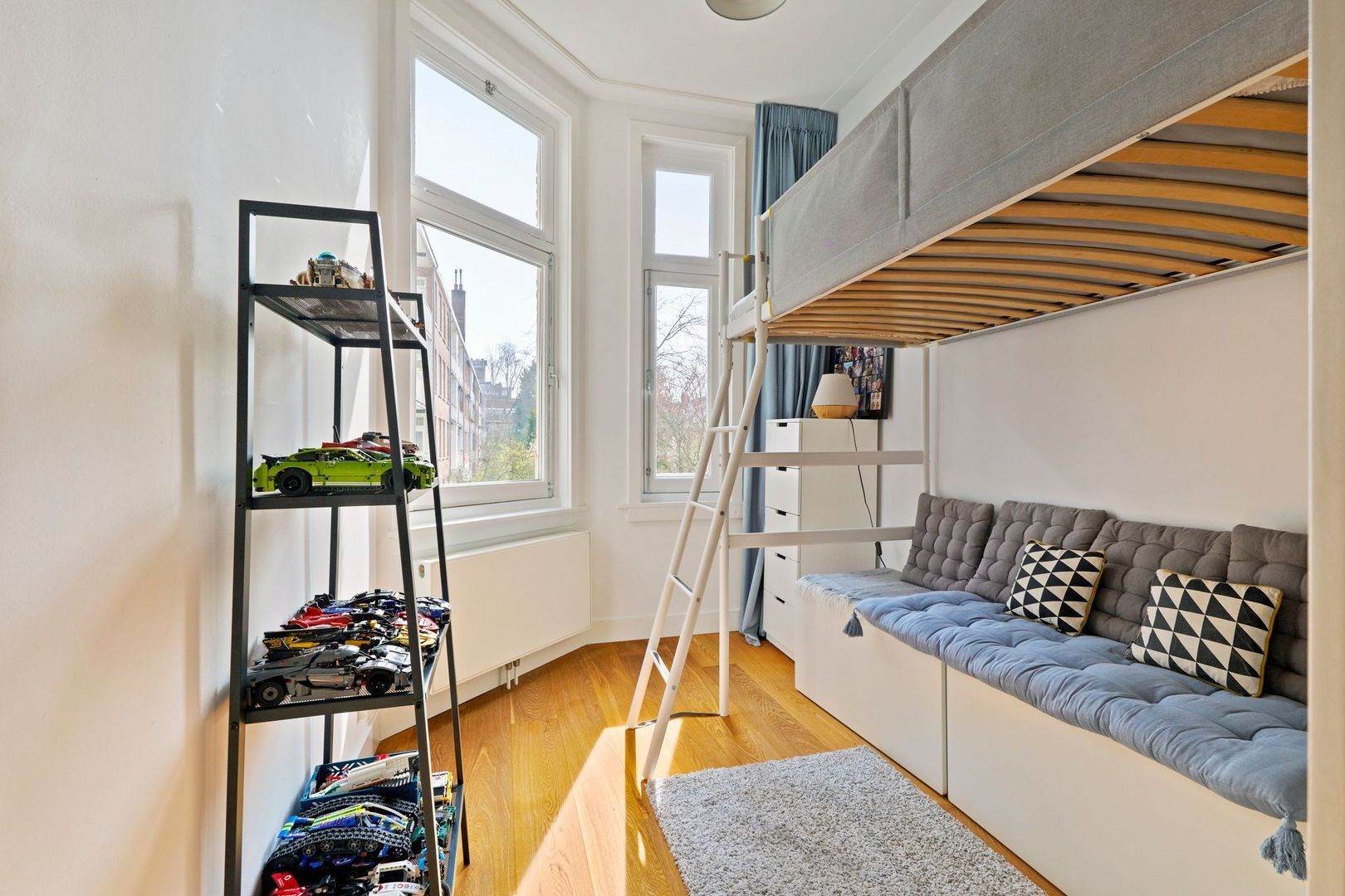 De linkerkamer aan de achterzijde is tevens goed van formaat en beschikt eveneens over een plafondhoge kastenwand. Naastgelegen kamer beslaat een goede kinder/tienerkamer. Beide kamers kijken uit over binnentuin.