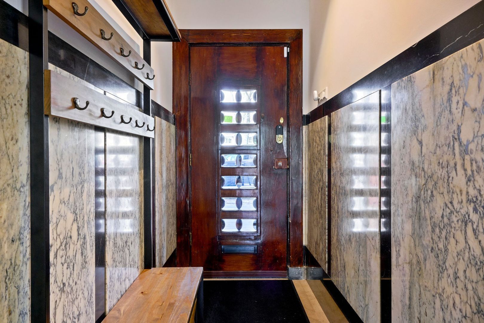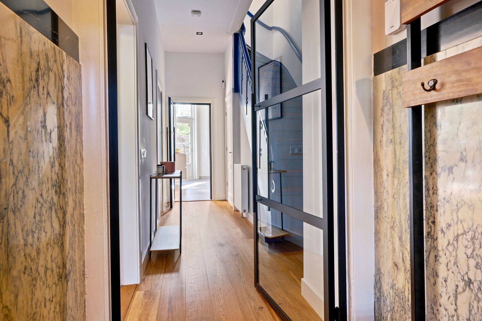 Via het klassieke portiek en toegangsdeur komt men binnen in de prachtige marmeren hal, voorzien van een garderobe en een glas in staal tussendeur naar de aansluitende ruime hal. Vanuit hier zijn alle ruimtes toegankelijk en leidt de originele trap naar bovengelegen slaapverdieping.