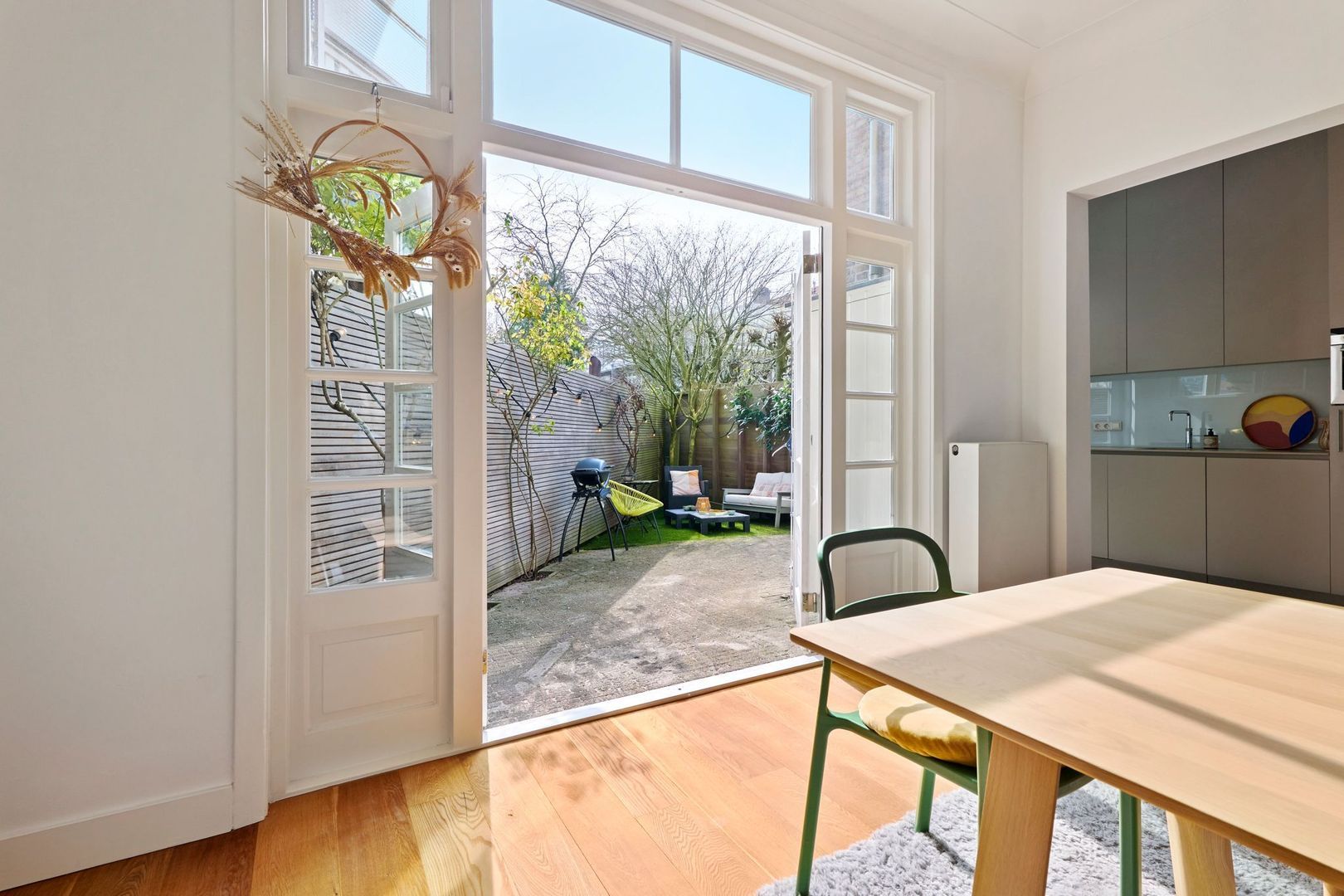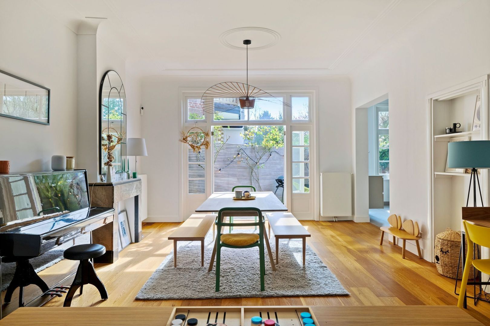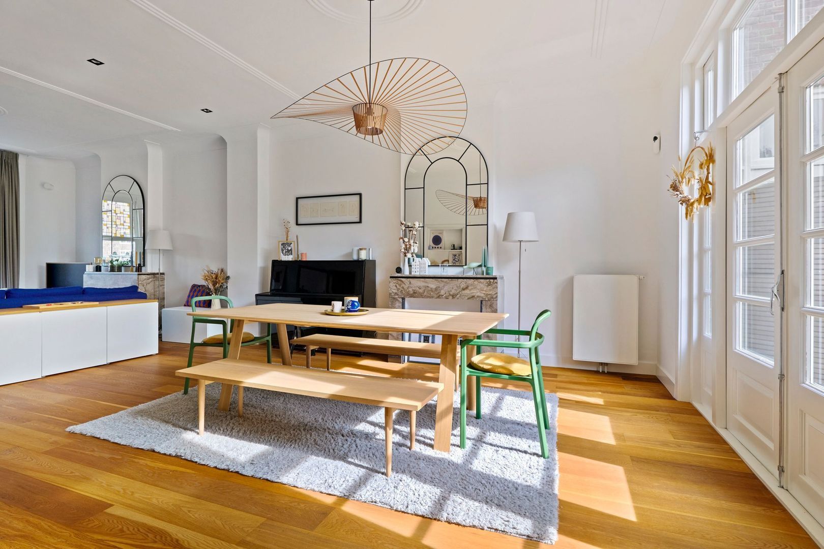 De royale leefverdieping is via twee zijden toegankelijk, beide via een glas in staal tussendeur. Aan de voorzijde is de charmante zitruimte gerealiseerd die vloeiend overloopt in de ruime eetkamer met openslaande deuren naar de tuin. Beide ruimtes zijn voorzien van een originele schouw en een ornamenten plafond. Door de goede breedte van deze ruimte is er tevens plaats voor een fijne werkplek aan de wand. De zitruimte heeft twee grote ramen met glas in lood bovenramen en kijkt uit over een gezellig en groen speelplein. De eetkamer loopt naadloos over in de luxe open keuken, uitgevoerd in een mat taupe kleurstelling en voorzien van bijzonder hoge keukenkasten. Leuk detail is de brede ladekast tegenover het keukenblok, een perfecte plek als coffee corner. Ook vanuit de keuken is de tuin te bereiken. Voorts is de keuken voorzien van diverse inbouwapparatuur en een fraaie grote vloertegel in een neutrale kleurstelling. De hal, zit- een eetkamer beschikken over een mooie eikenhouten vloer.