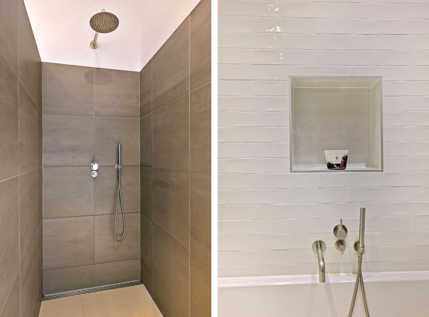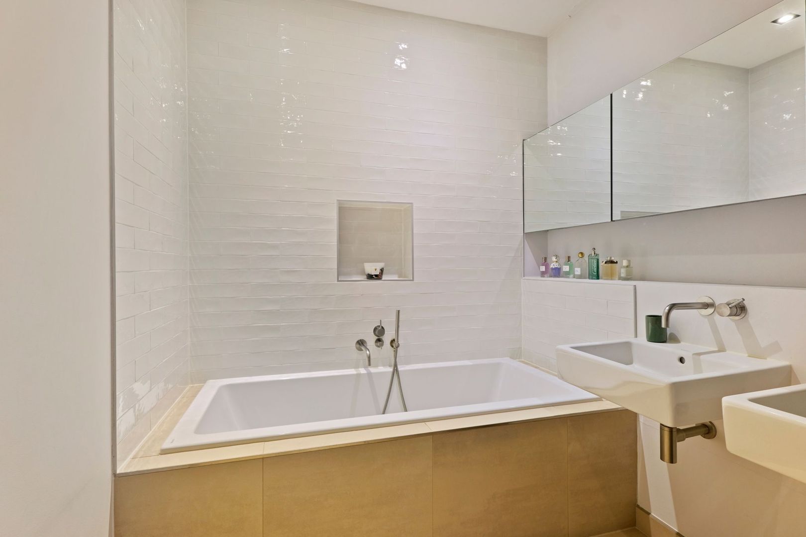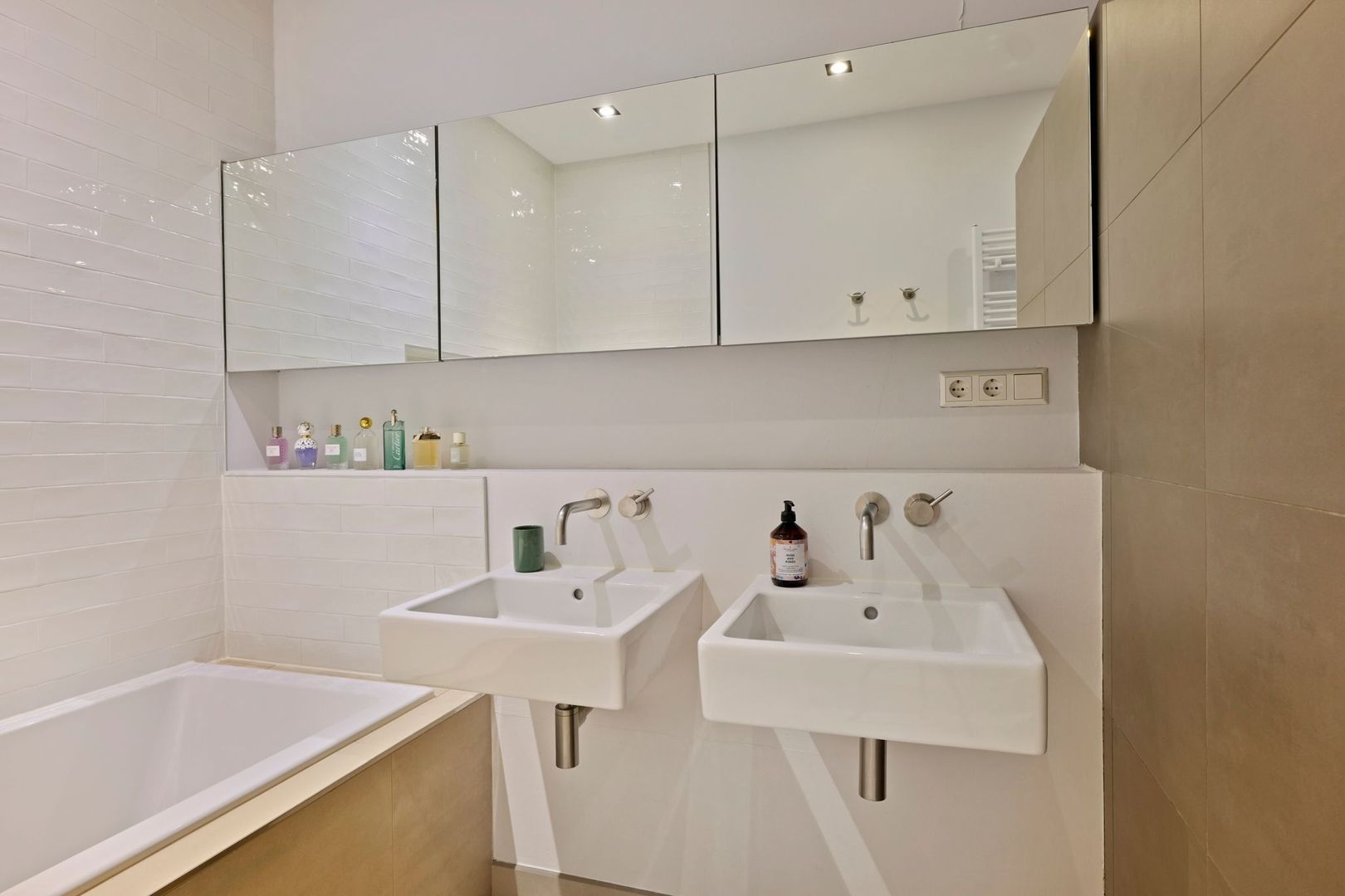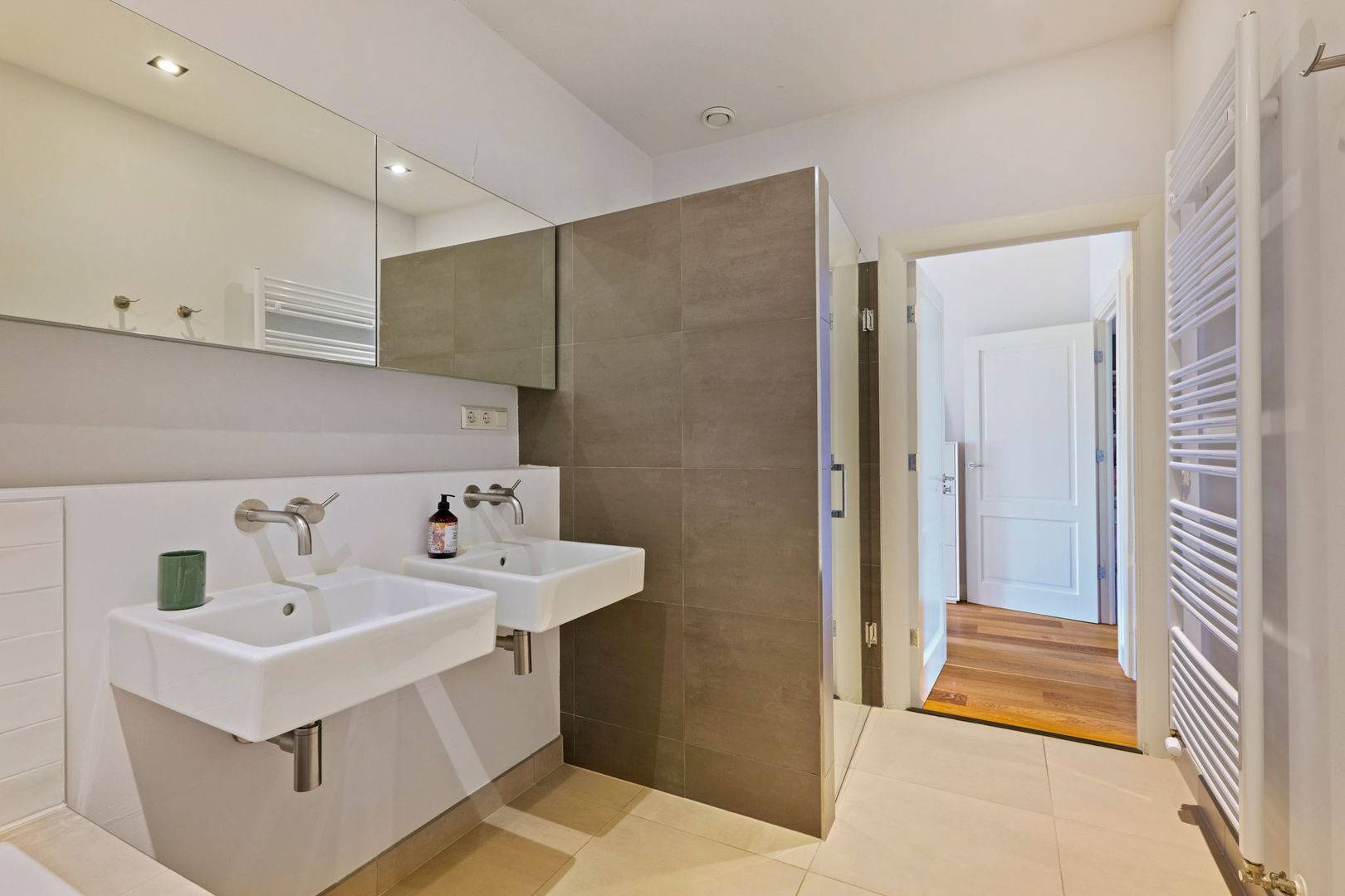 In het midden van deze verdieping is de luxe badkamer gesitueerd, uitgevoerd met een zandkleurige vloertegel en bad ombouw in combinatie met een geheel witte wand echter deels uitgevoerd met geglazuurde witte tegels. De inloopdouche is voorzien van donkere wanden en biedt zowel een regendouche als een handdouche. Voorts beschikt de badkamer over een ligbad, handdoekradiator en twee moderne wastafels met een muurbrede spiegelkast. Alle kranen zijn ingebouwd. Naast de badkamer is een diepe kast gelegen waarin de wasmachine- en drogeraansluitingen zijn geplaatst.