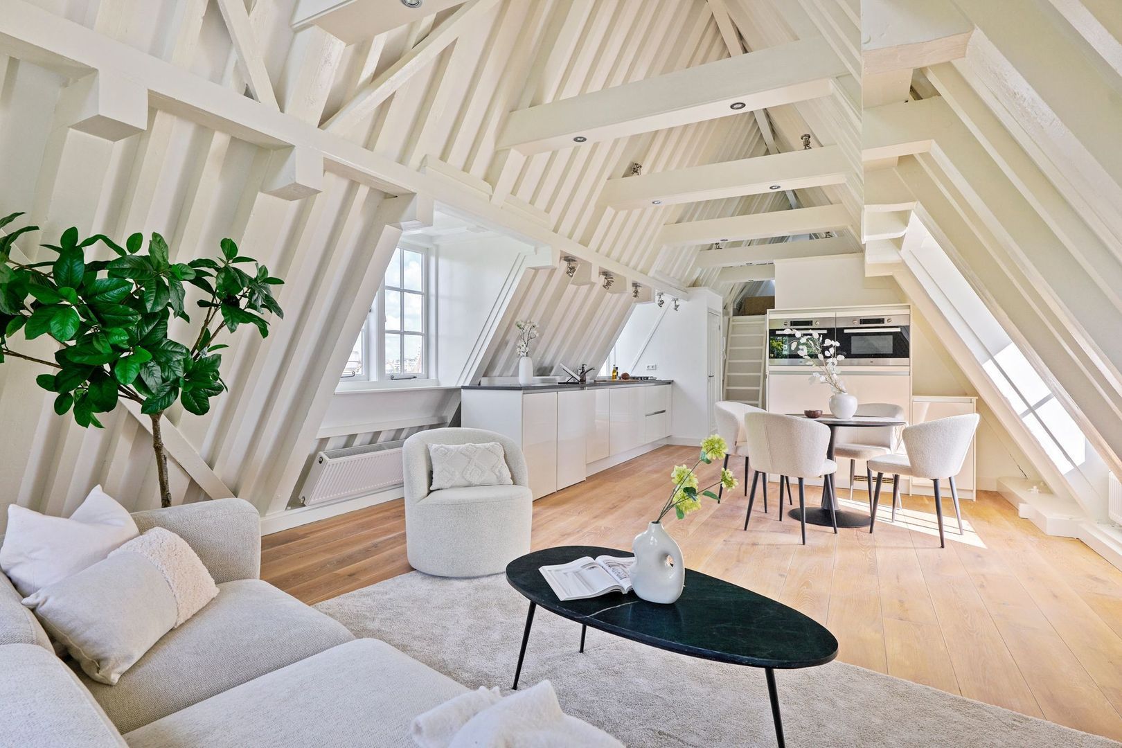 De eikenhouten vloer, open kapconstructie en hoge plafonds geven het appartement een ruimtelijke en karakteristieke uitstraling.
