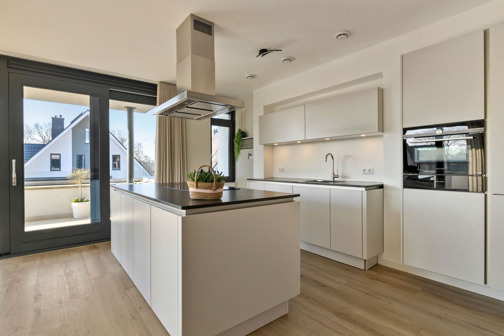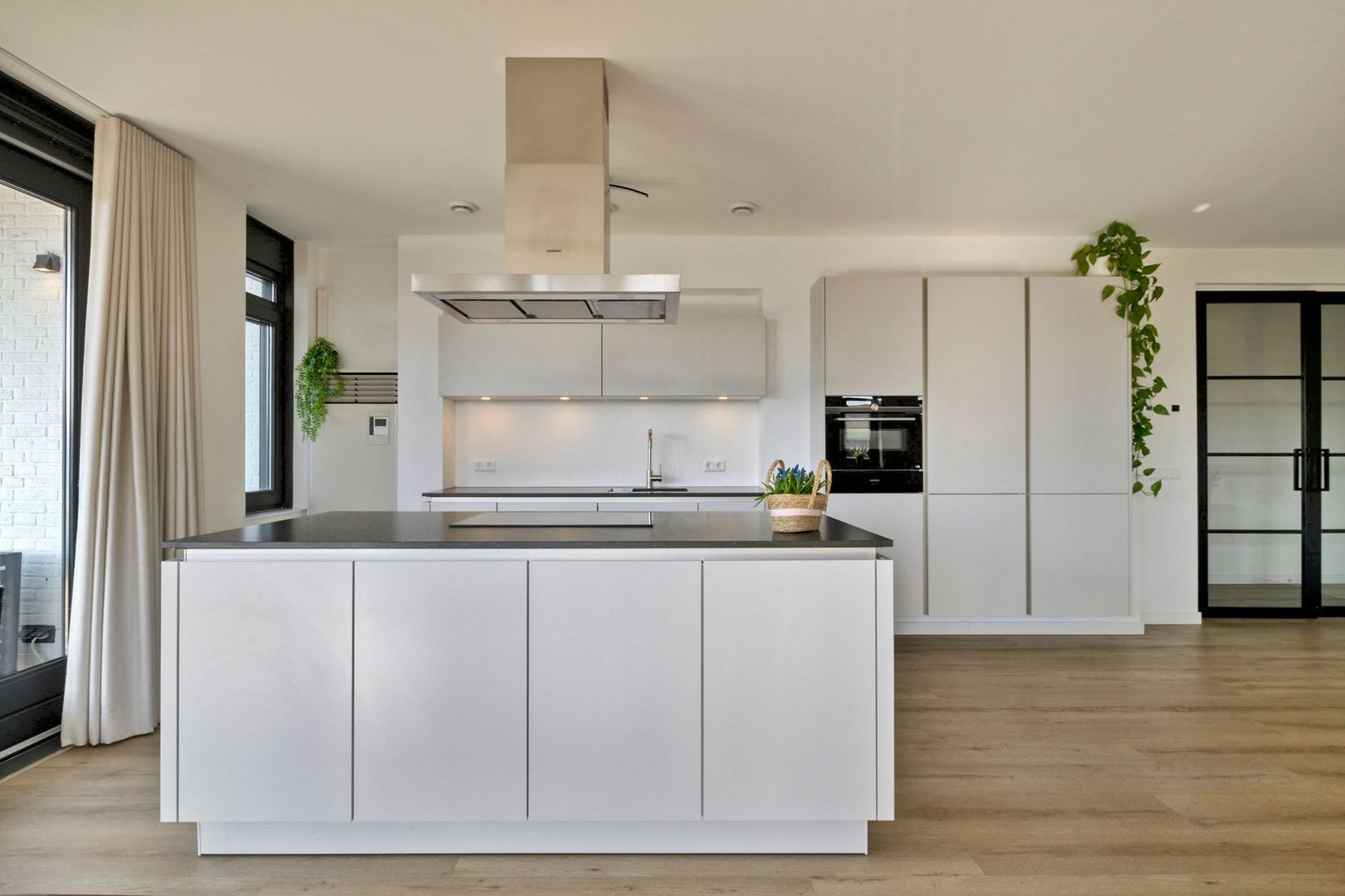 De volledig uitgeruste luxe keuken is uitgevoerd in een wandopstelling met extra werkblad en kastenwand, inclusief een kookeiland. De kasten zijn uitgevoerd in een beige kleurstelling in combinatie met een stijlvol zwart werkblad, voorzien van hoogwaardige inbouwapparatuur, waaronder een combi-oven van Siemens, inductiekookplaat en vaatwasser.