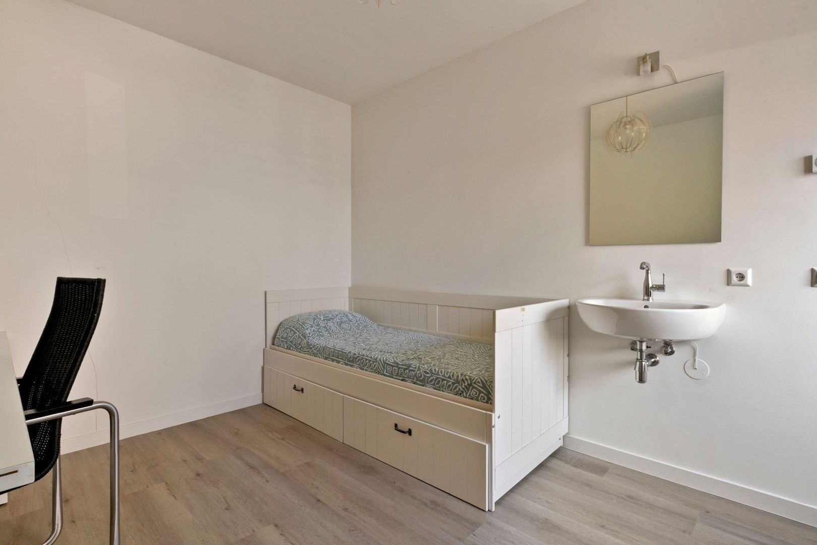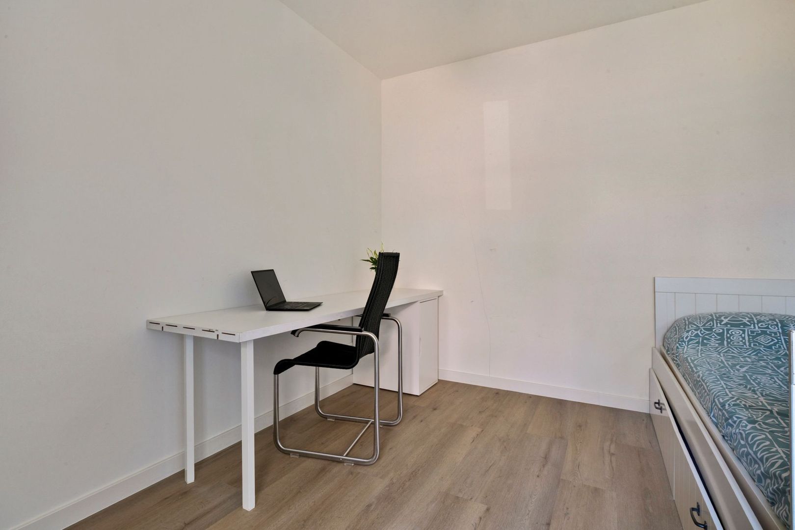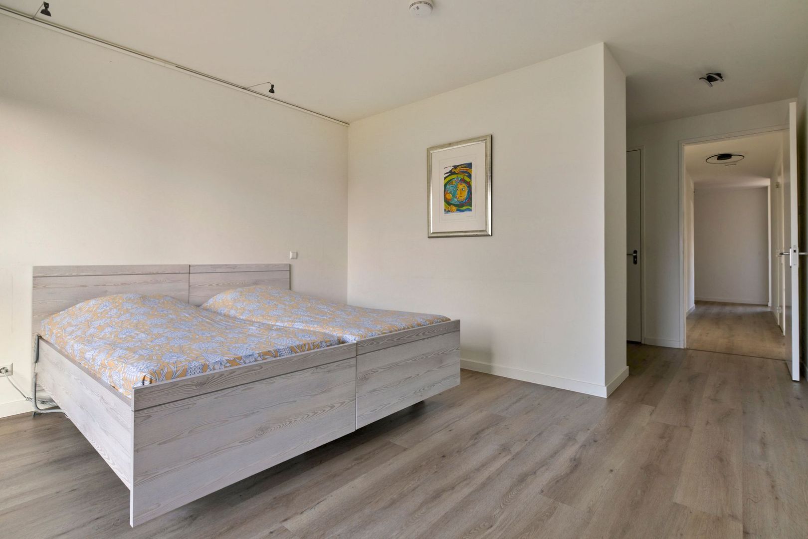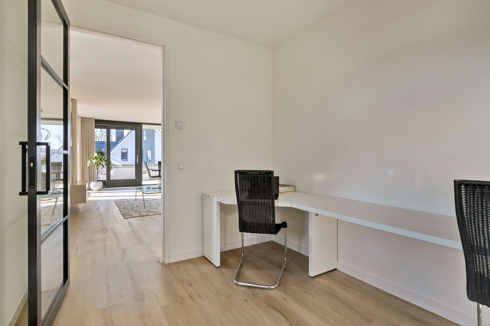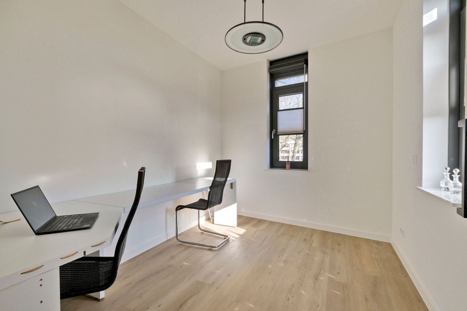 De tweede slaapkamer ligt aan de voorzijde van het appartement en is ruim van formaat. De derde slaapkamer, bereikbaar vanuit de woonkamer, kan uitstekend dienstdoen als werk- of logeerkamer.