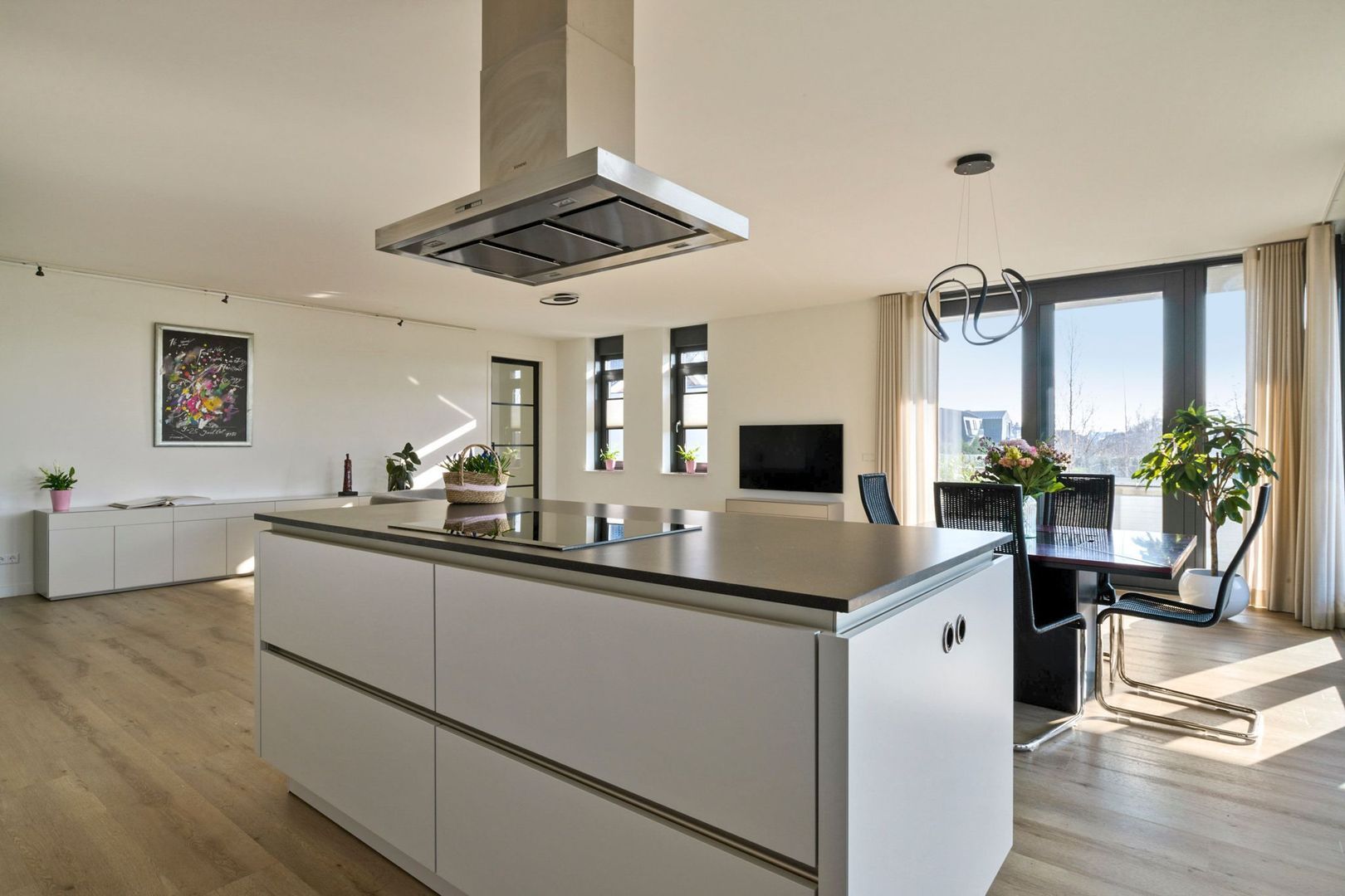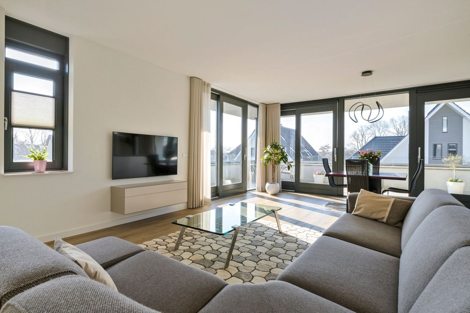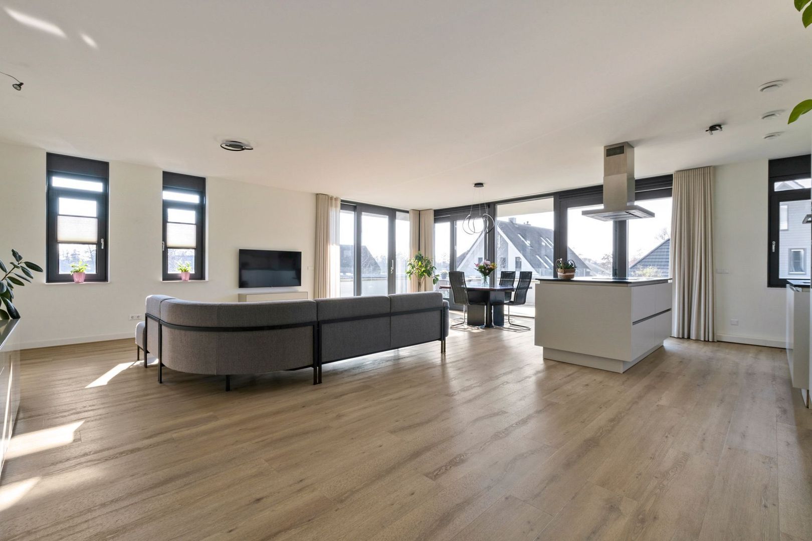 Aan de voorzijde is de zeer lichte en ruime woonkamer gelegen met grote raampartijen van vloer tot plafond, wat zorgt voor veel lichtinval. De woonkamer is voorzien van airconditioning en elektrische zonneschermen. Via de openslaande deuren is het L-vormige balkon van 26m² bereikbaar. De woonkamer biedt volop ruimte voor een royale zithoek en eethoek.