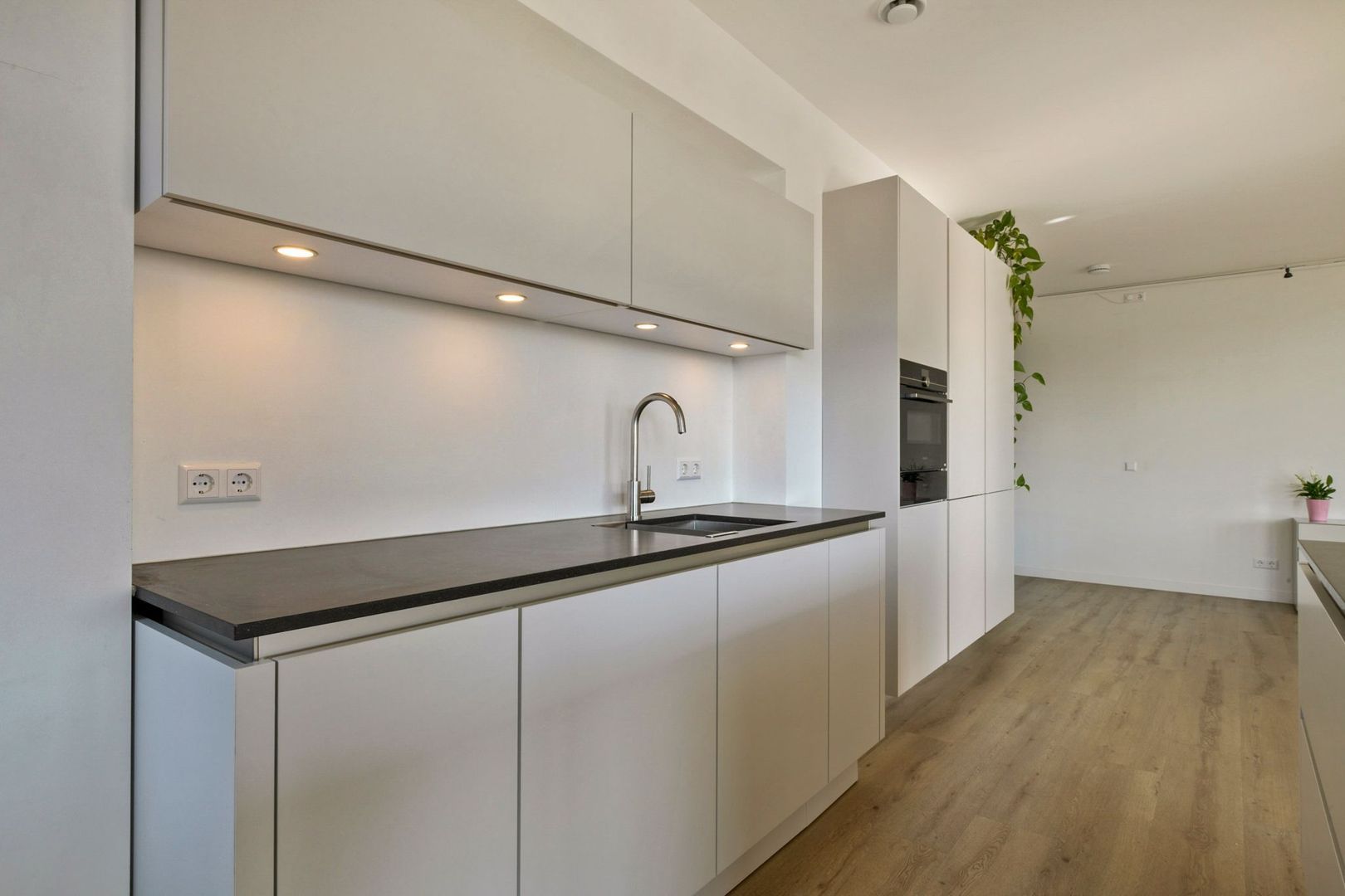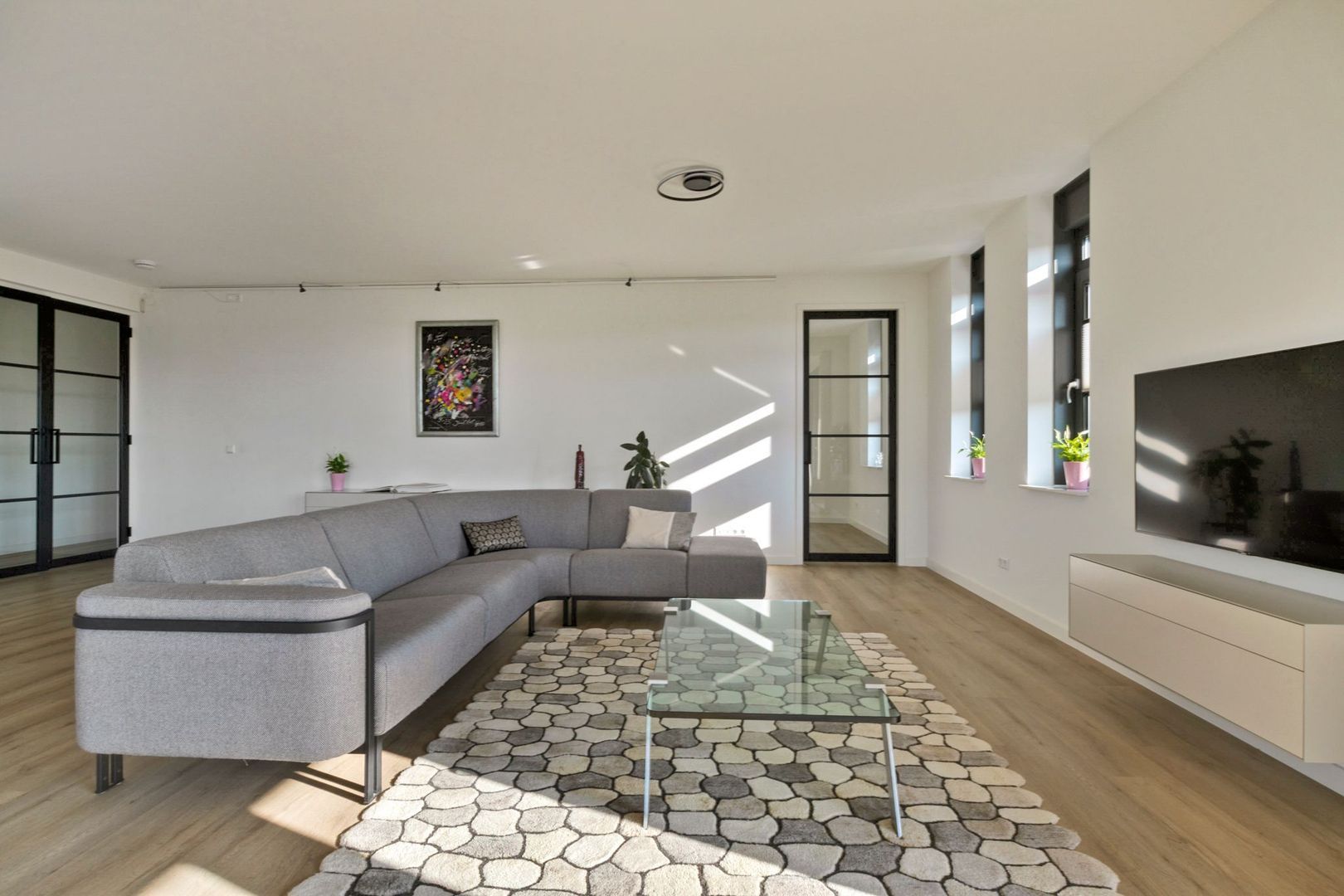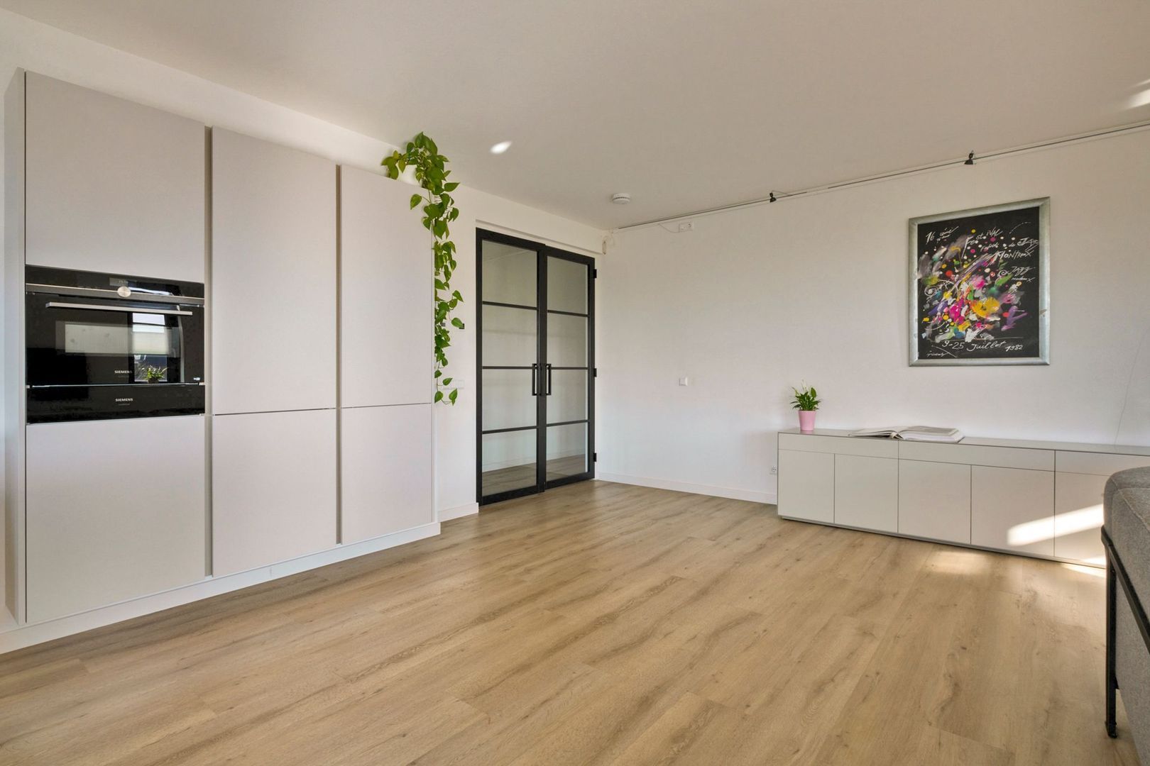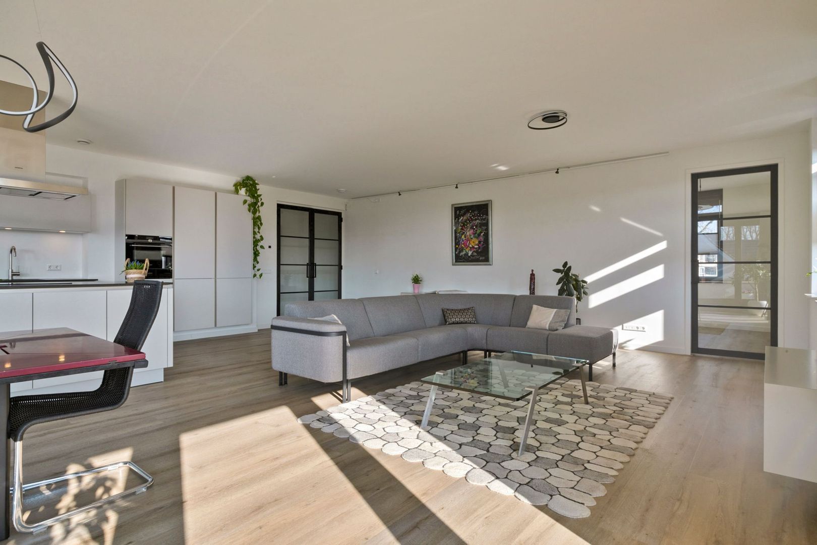 De gehele woning is voorzien van strakke witte wanden met inbouwspots en houten kozijnen met dubbele beglazing.