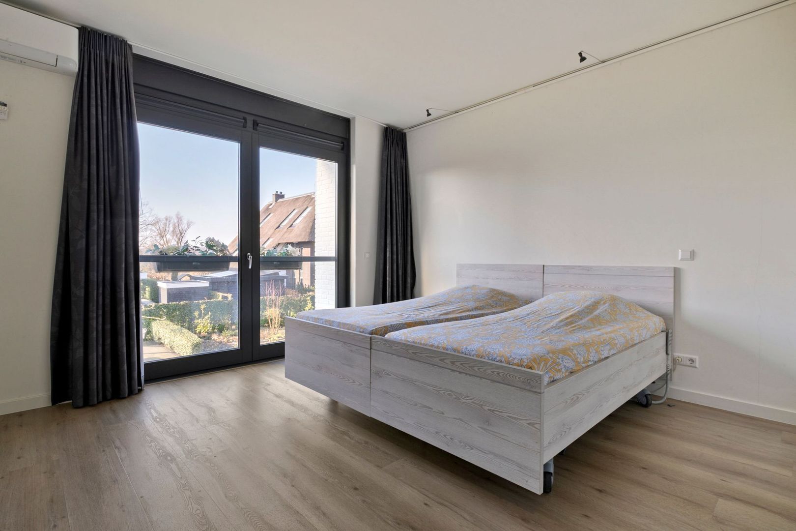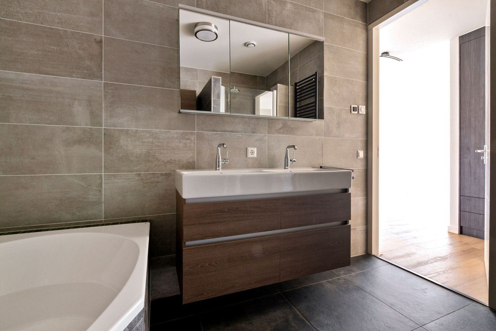 De hoofdslaapkamer is gelegen aan de achterzijde van het gebouw en biedt openslaande deuren naar een Frans balkon, een walk-in closet, airconditioning en een royale en suite badkamer. De badkamer is modern afgewerkt met grijze vloer- en wandtegels en beschikt over een inloopdouche, een groot ligbad, een dubbel wastafelmeubel in houtlook en een toilet.